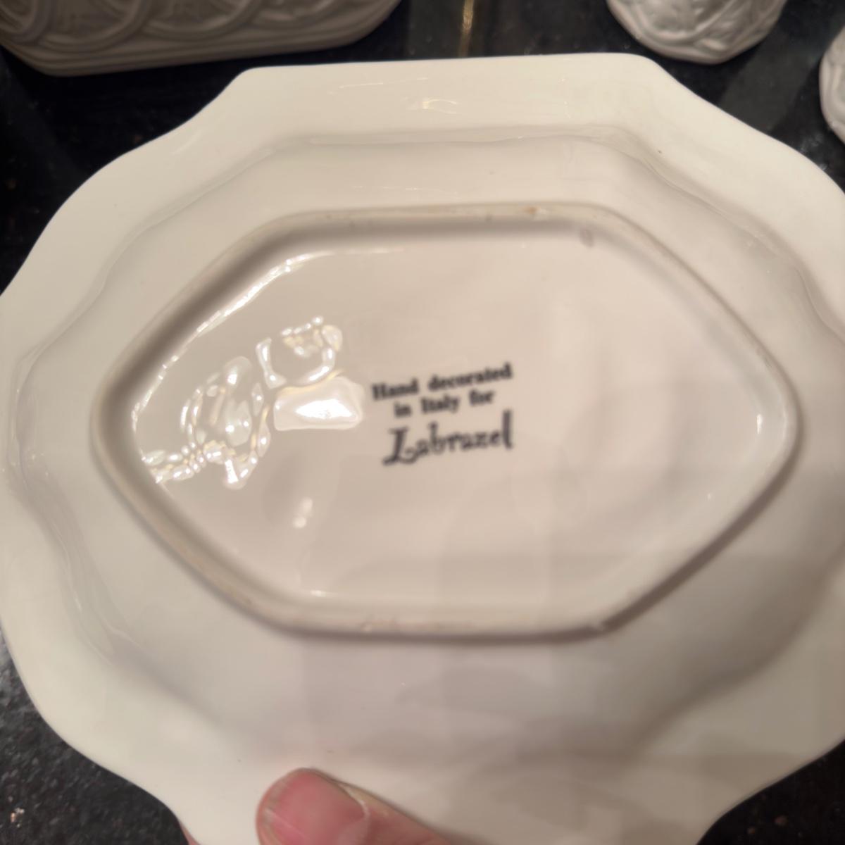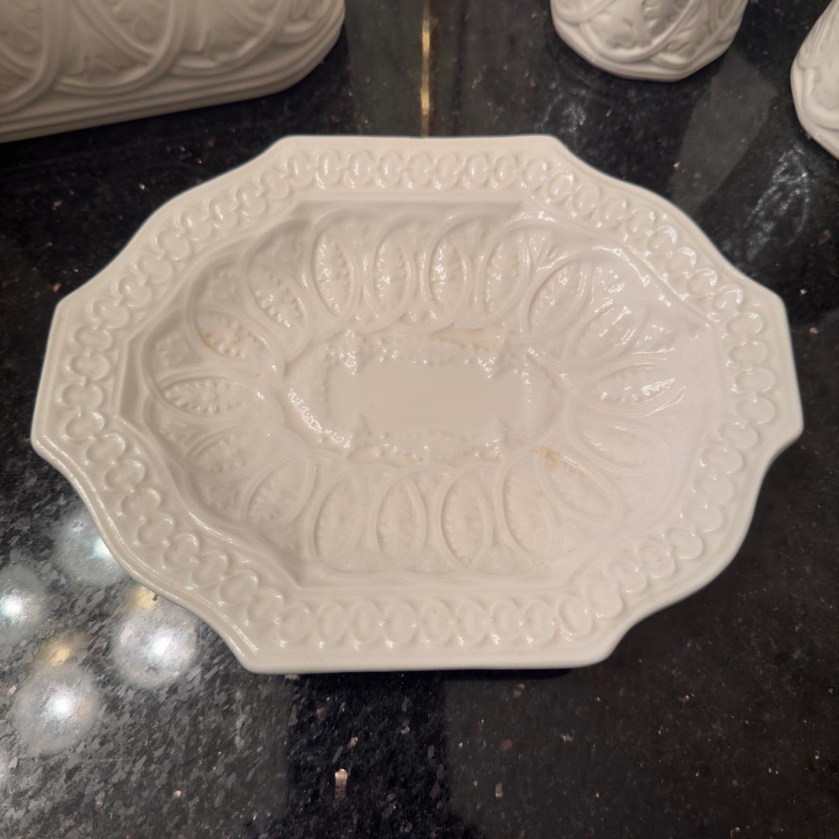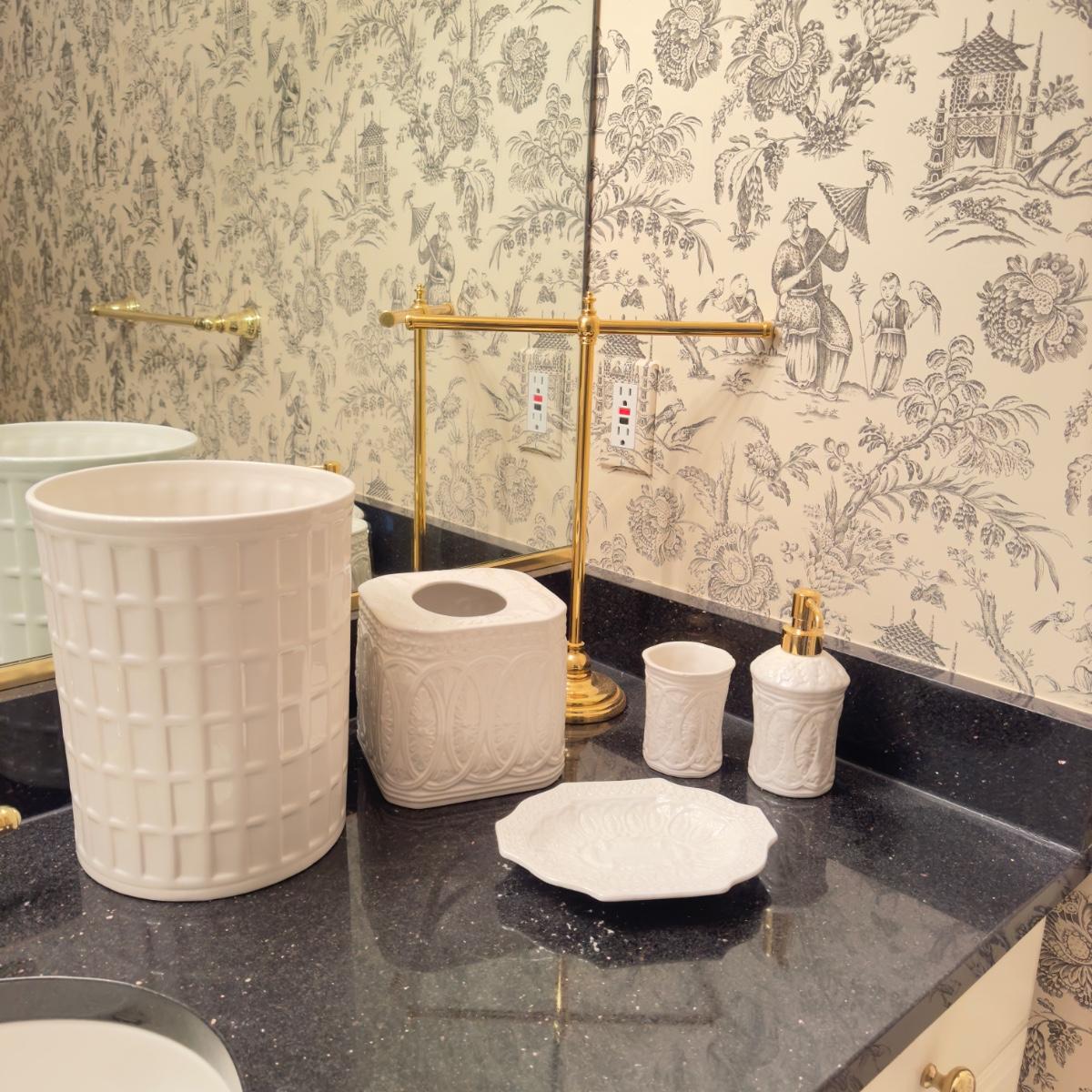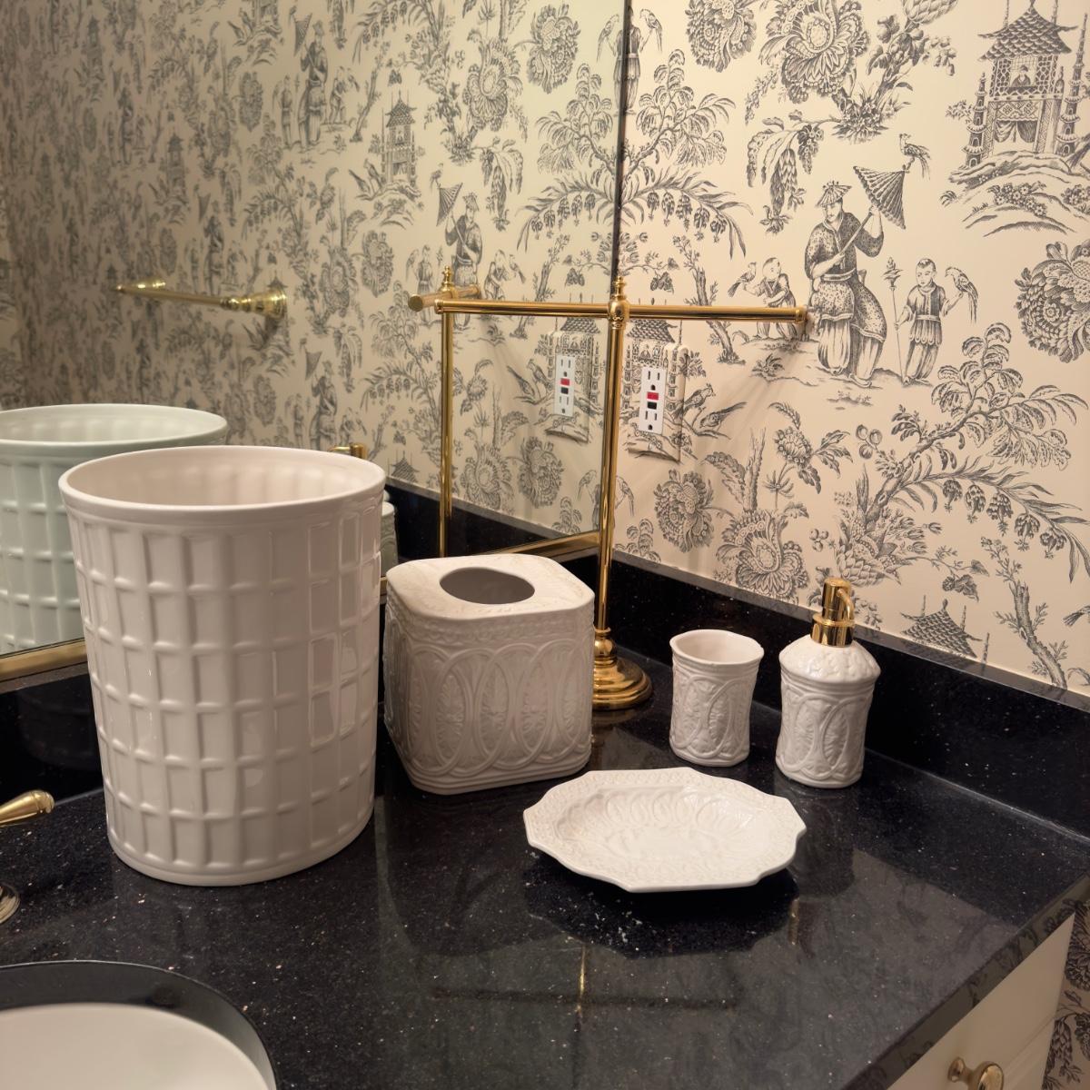 Waste can , tissue box cover, soap dish . Tooth brush holder, cup, hand towel holder