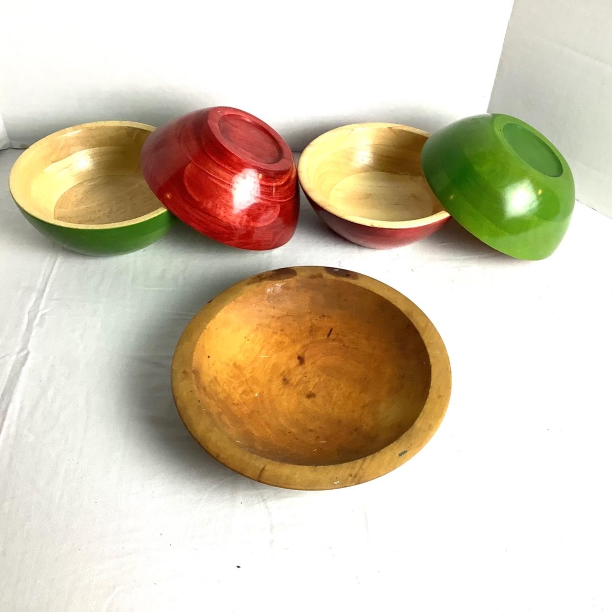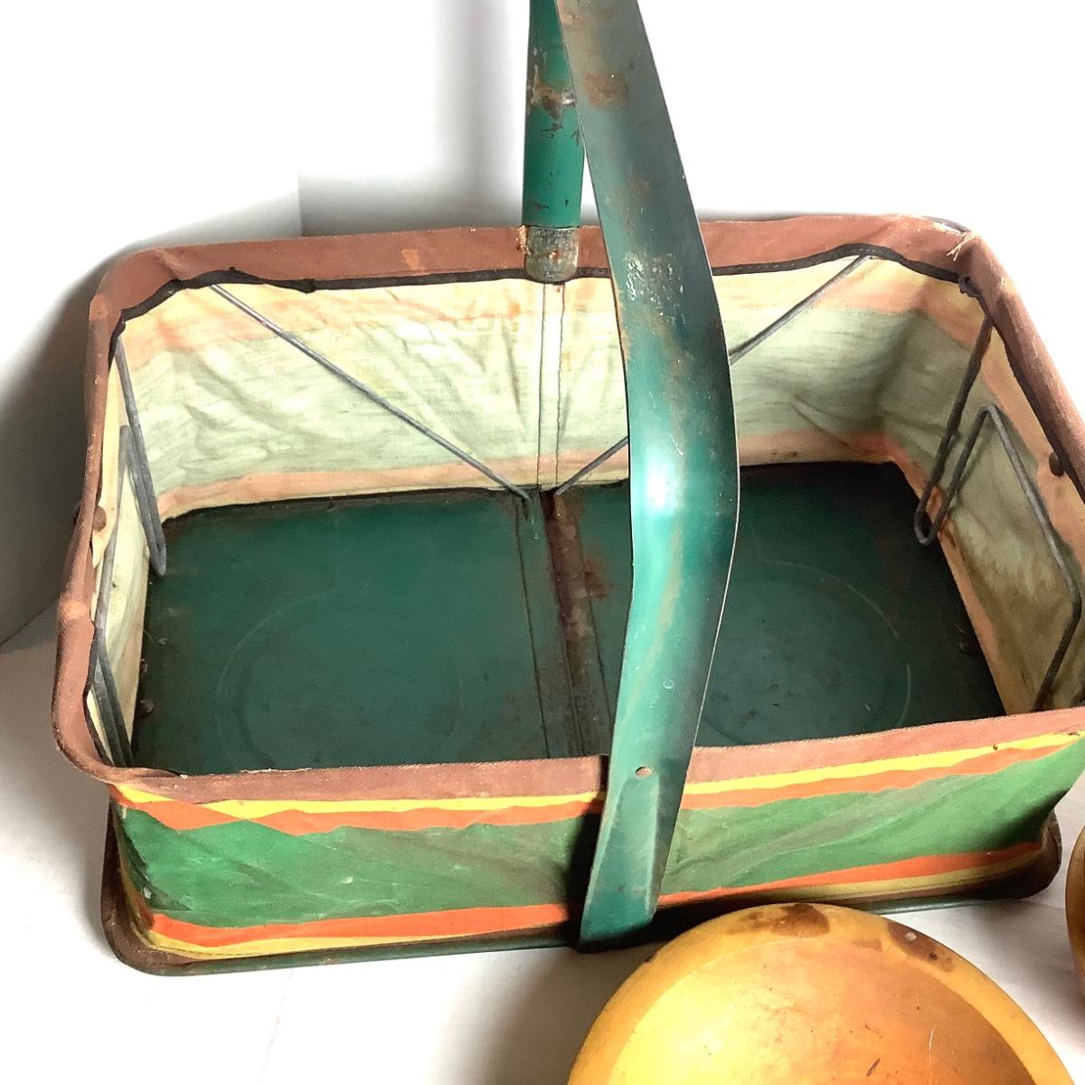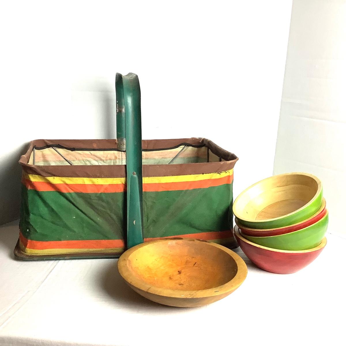 381 Vintage Folding Cloth Basket with Wooden Bowls