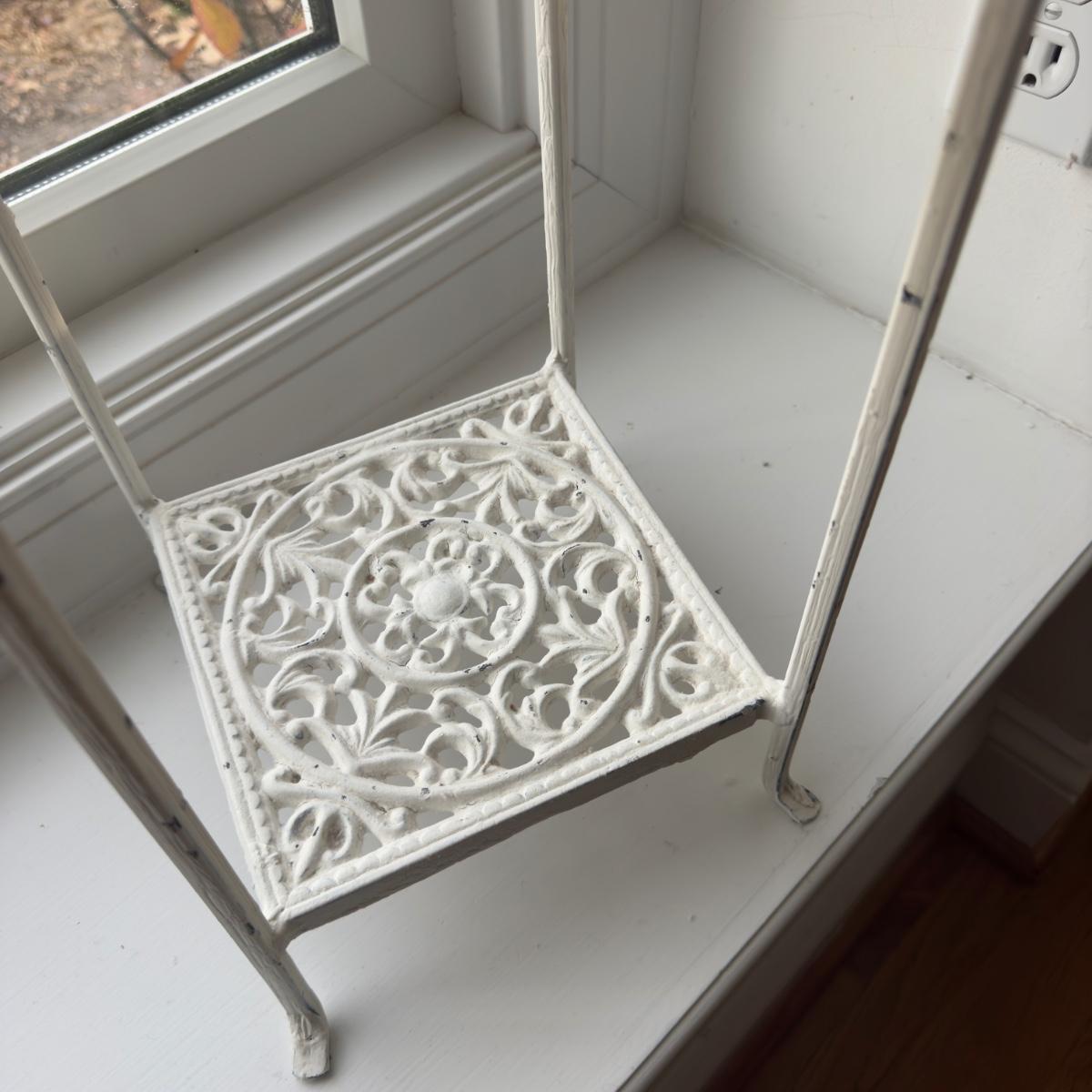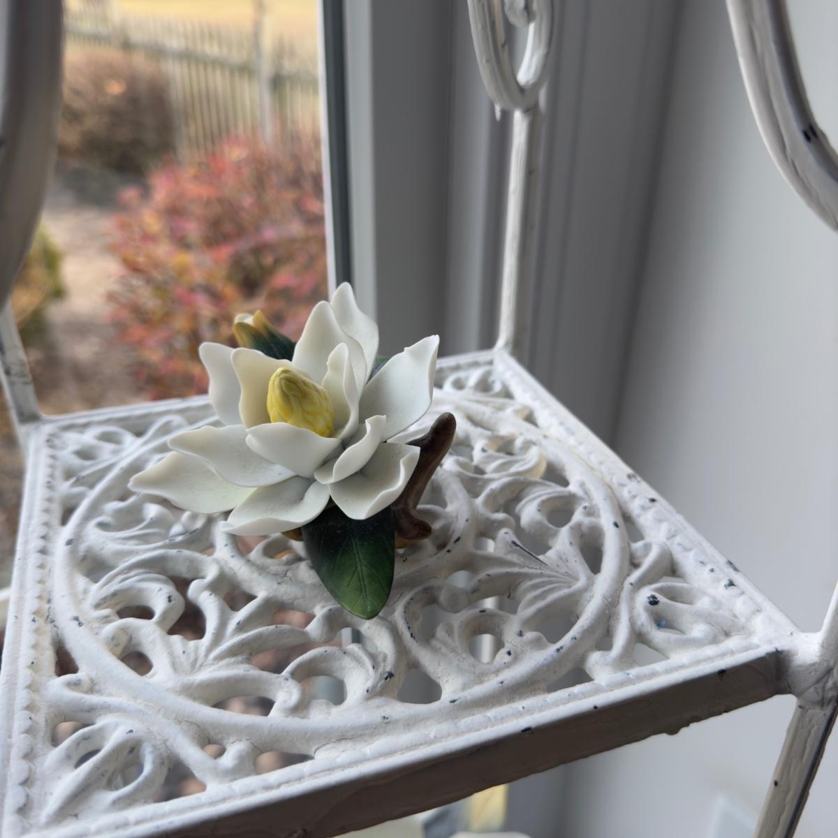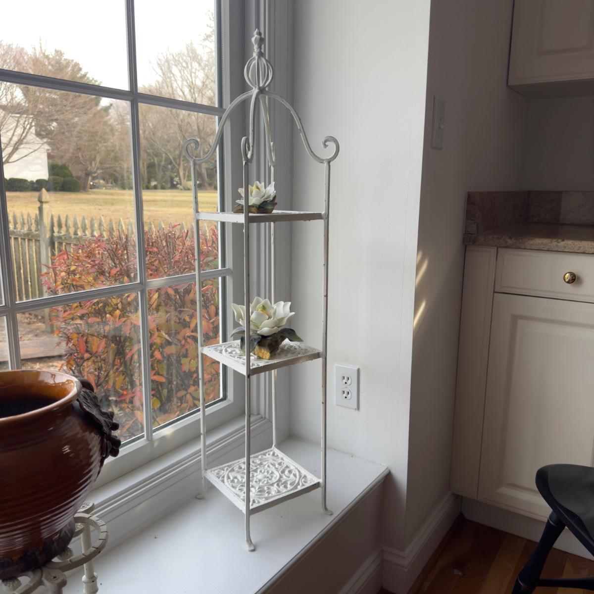 384 White Distressed Painted Metal Three Tier Stand with Porcelain Magnolia Flowers