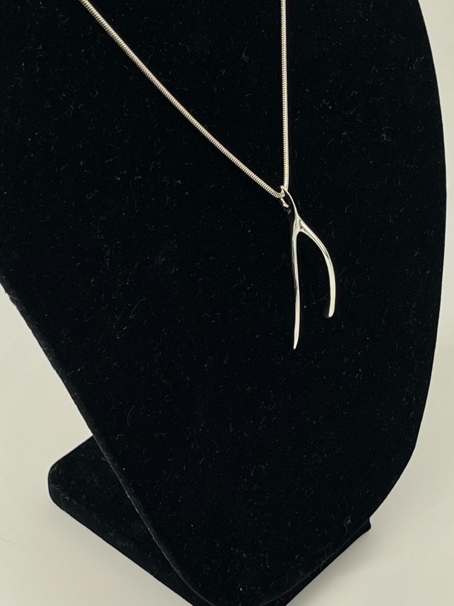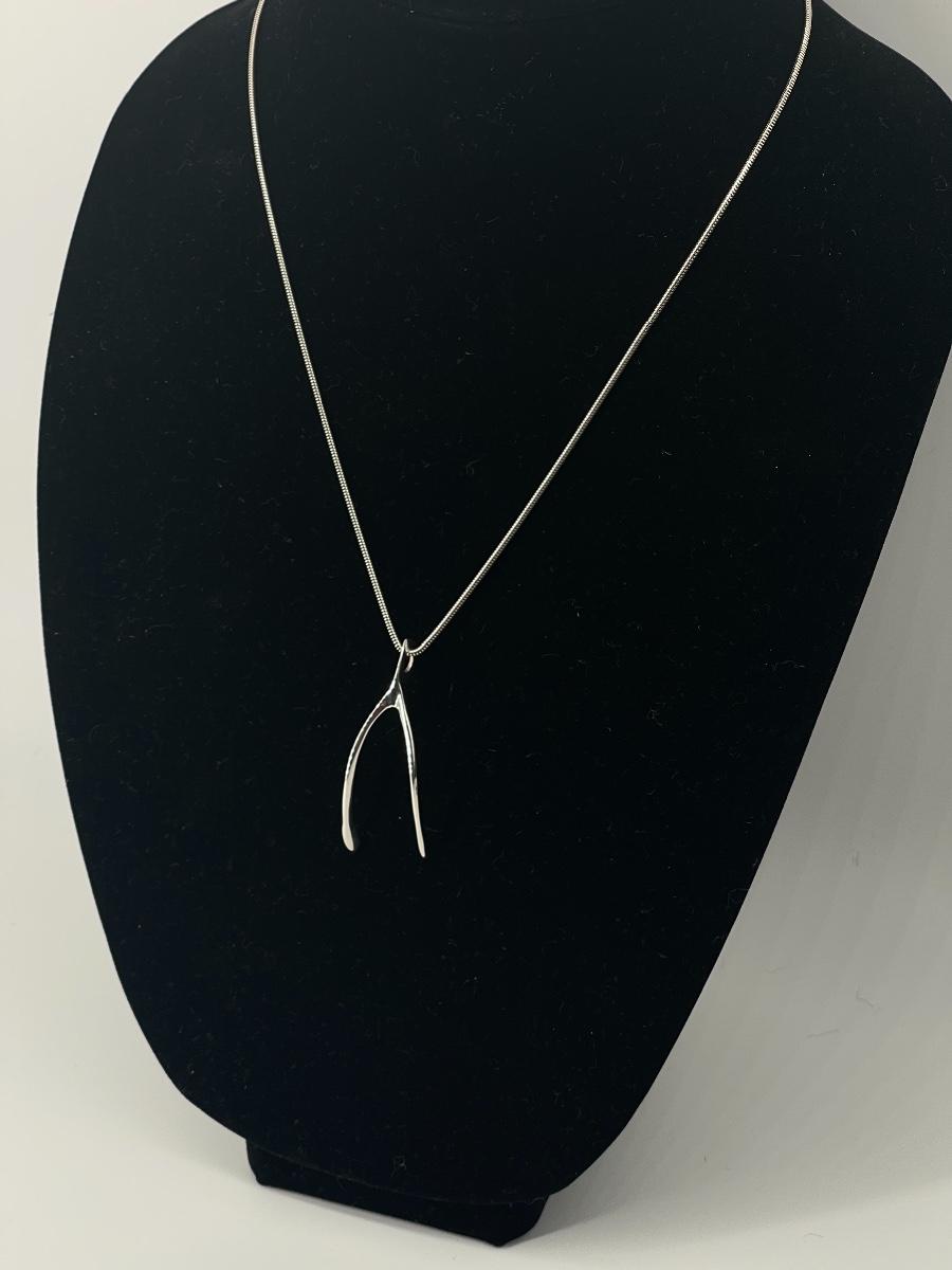 Wishbone is 2” long x 1” wide. Lobster claw closure on chain. Pendant = 4 grams. Chain = 4 grams.