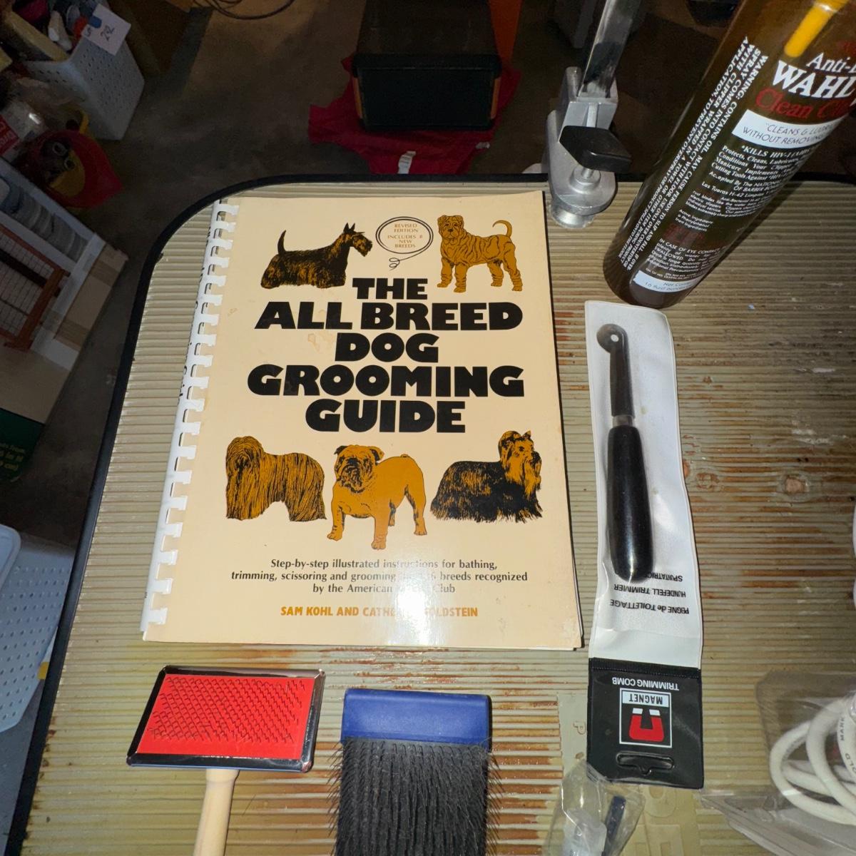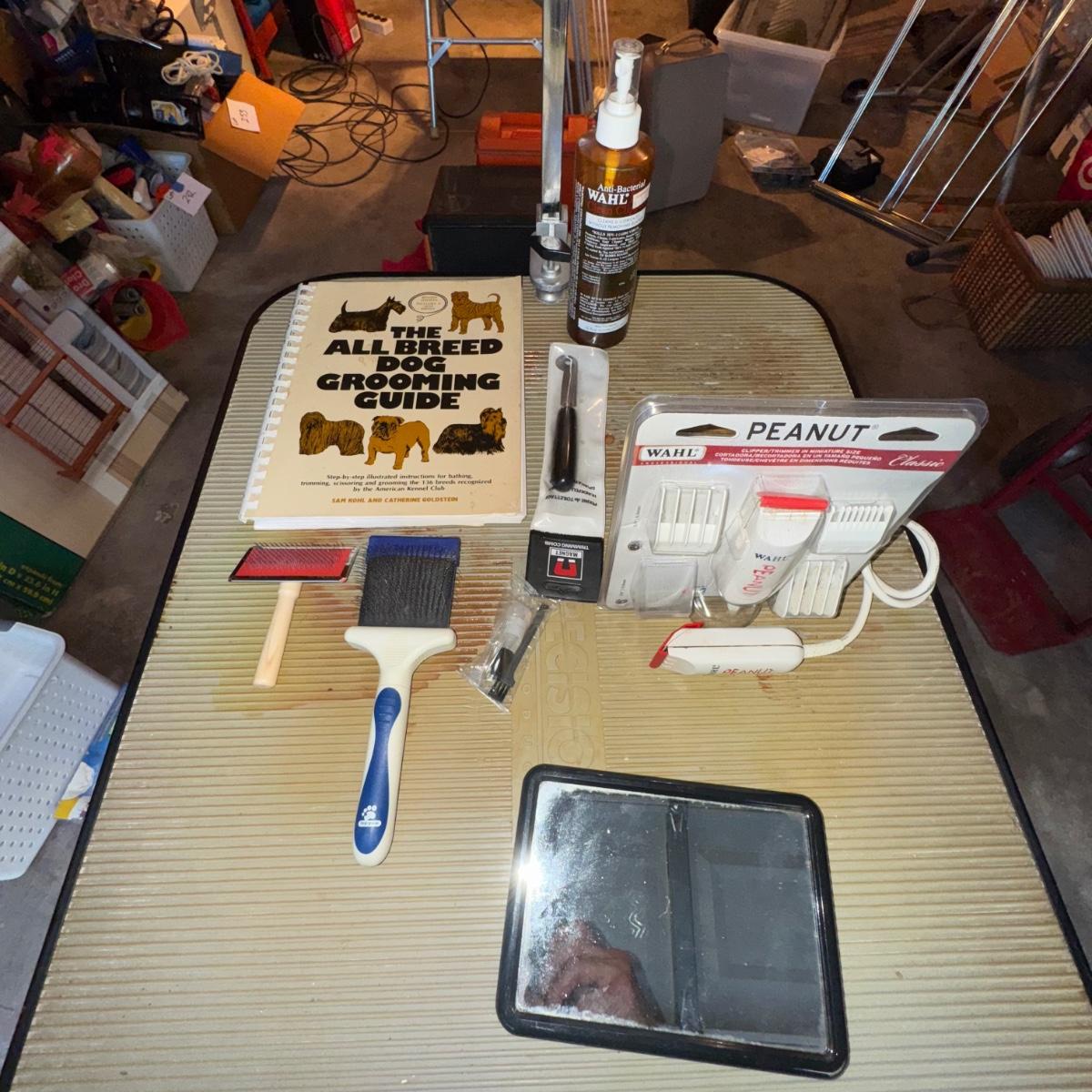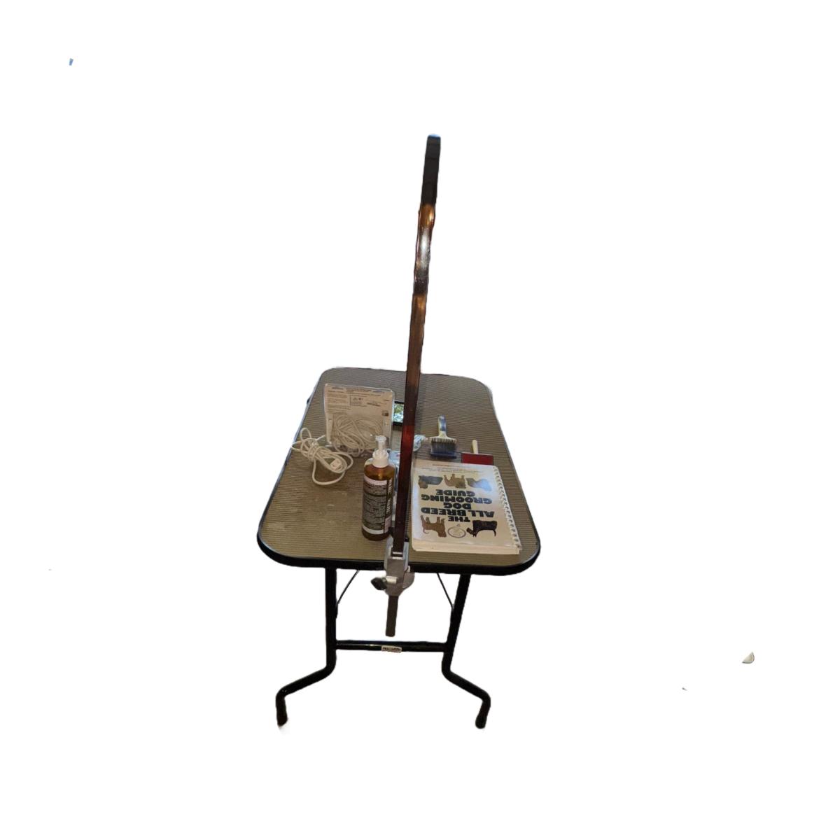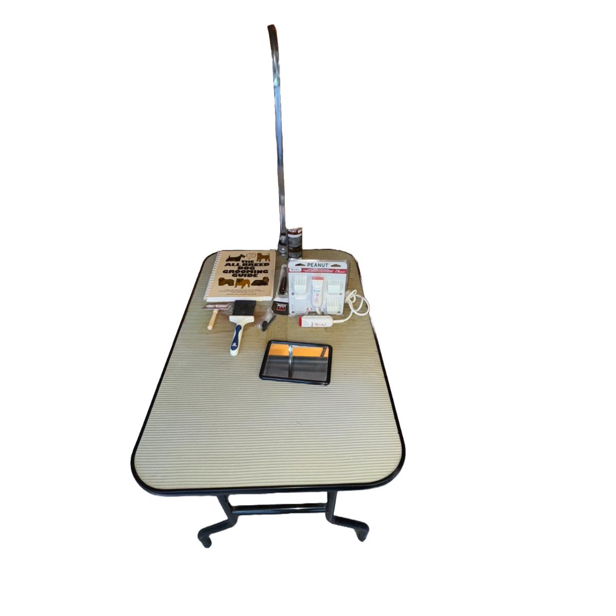 385 Dog Grooming Table & Supplies. Small electric clipper, qty (1) new in package, qty (1) used-tested and working, dog grooming guide book. Legs can be folded for storage or travel. Leash bar can also be removed as well. See pics for details.
