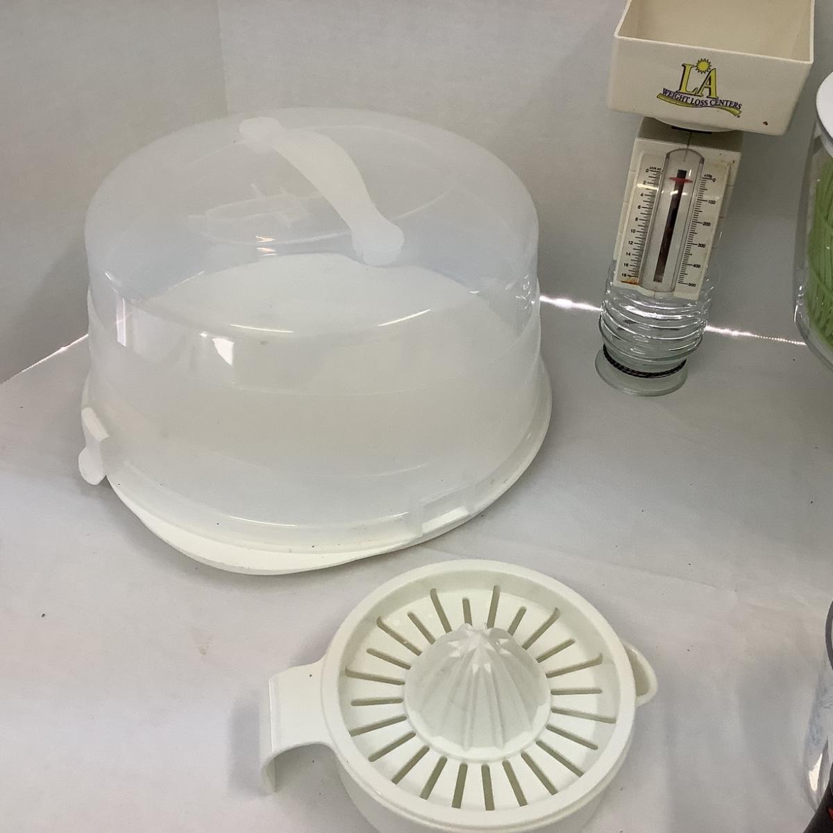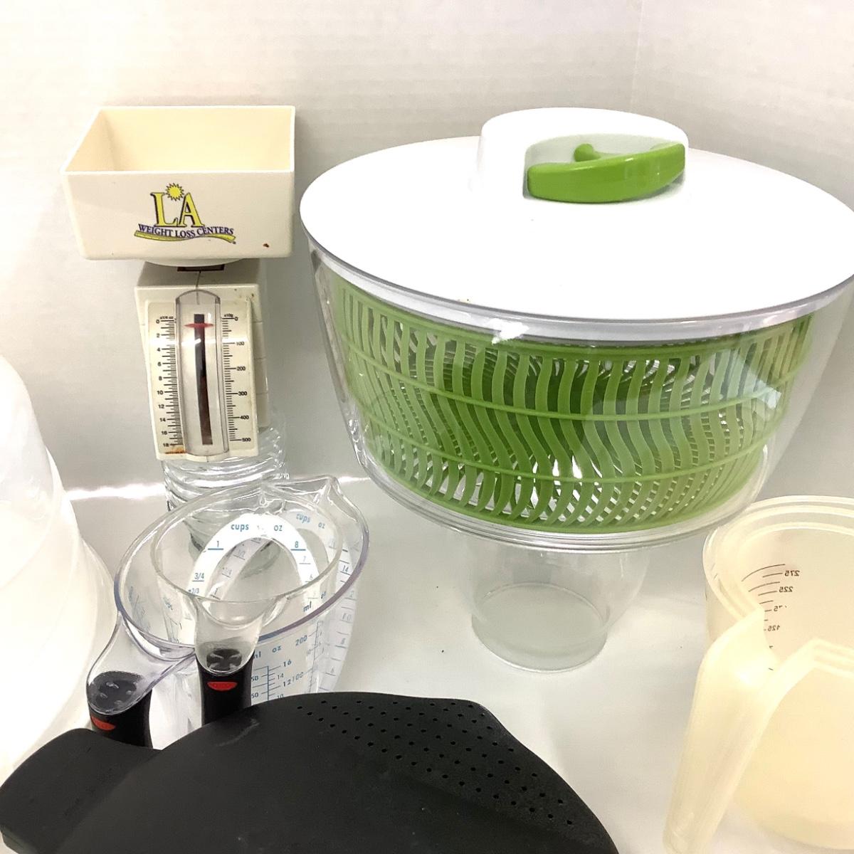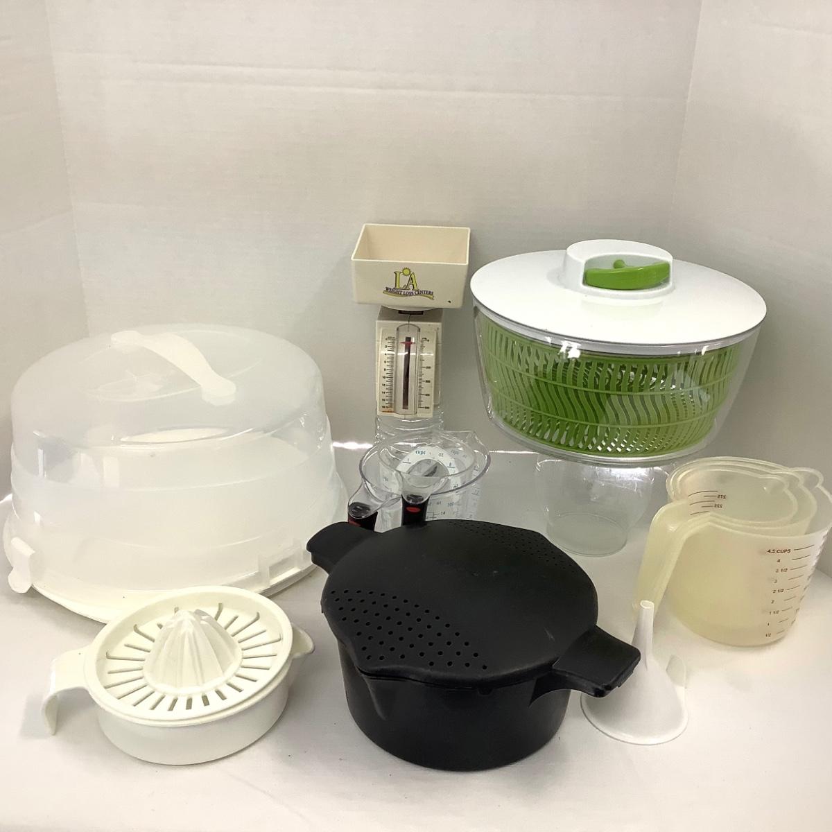 Salad spinner, scale , cake cover, juicer, measuring cups , timer , pampered chef strainer