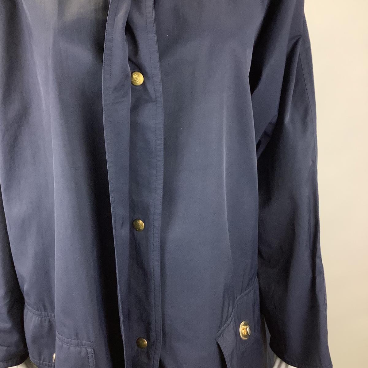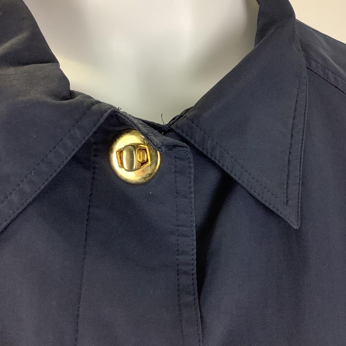 Navy blue coat with gold metal buttons and clips.