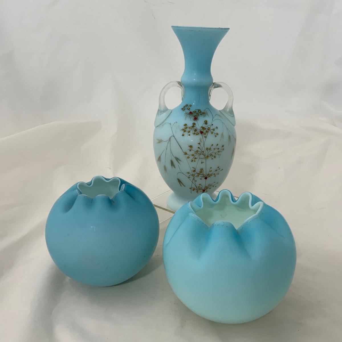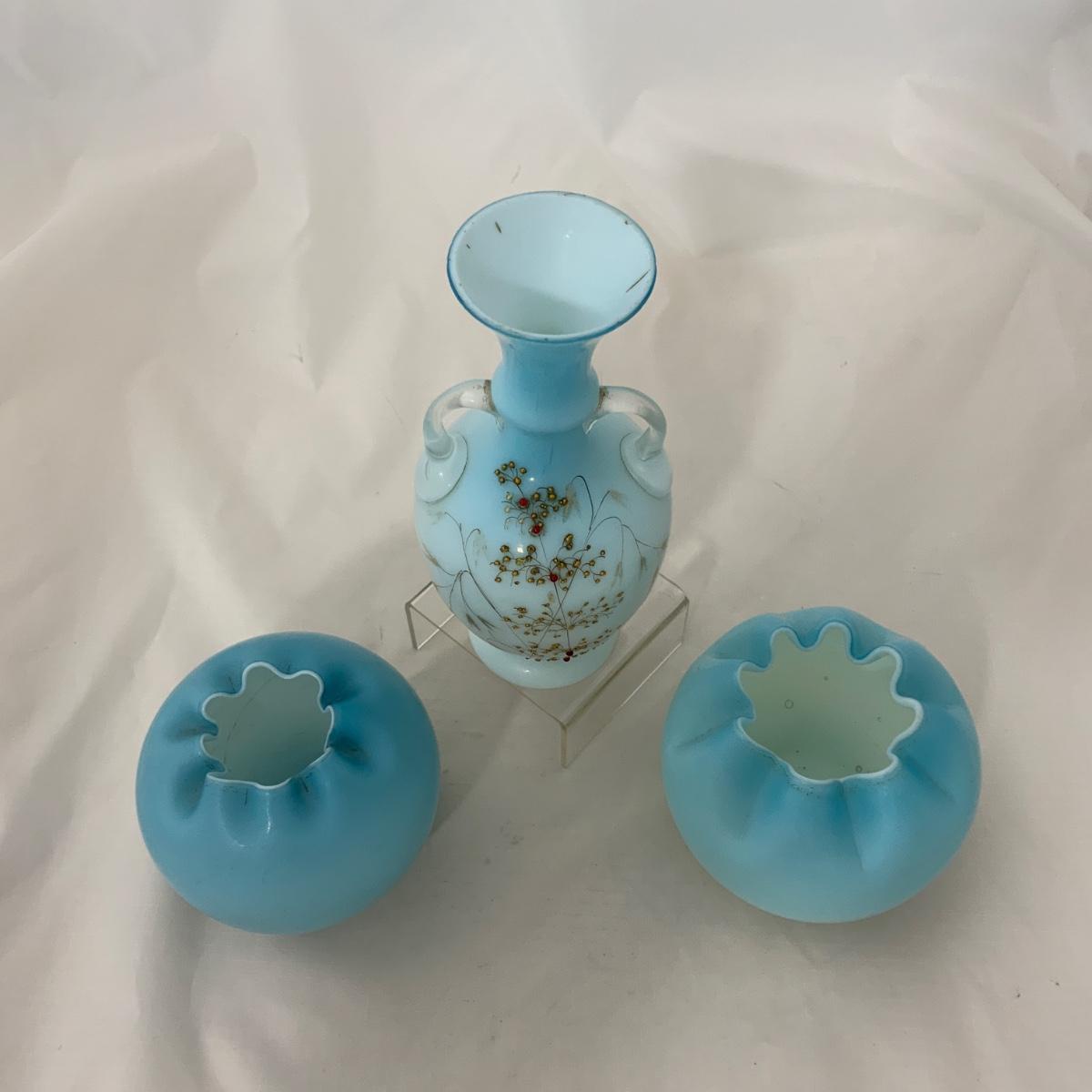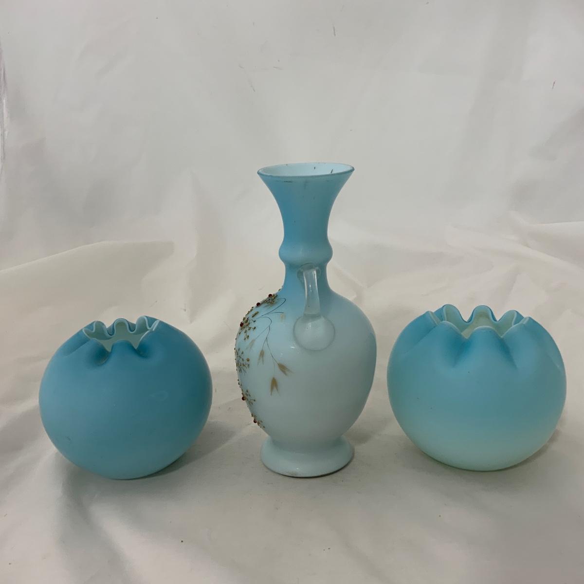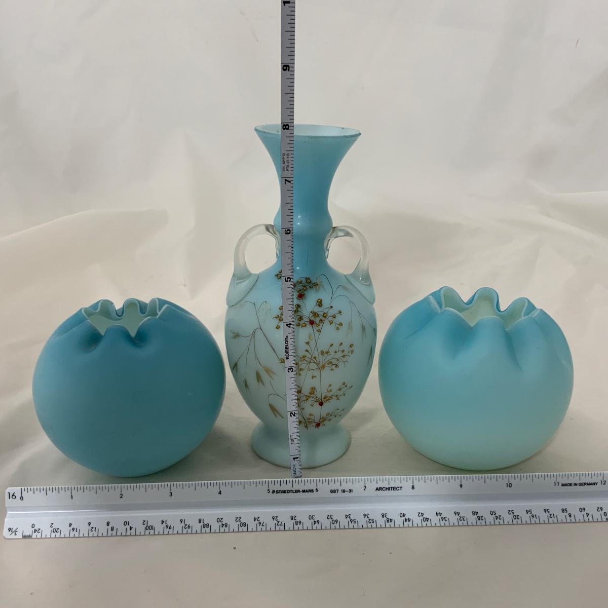 Two gorgeous Blue Satin Glass Rose Bowls and one Blue Satin Glass Double-Handled Hand-Enameled Vase. The raised flowers on the vase are incredibly attractive, don’t you think? If you don’t have something like this in your collection yet, it’s about time you did! All three pieces have some wear due to age, but overall look absolutely fantastic. Please see photos for details and condition. ::: Shipping is available on this lot. If you require shipping you must let us know at the close of the auction. We will coordinate with you after the item has been won. Shipping fees will include insurance up to or exceeding the value of all items being mailed. If you have any questions regarding this lot please contact the auctioneer either via this website, by direct email or by phone. PICK UP TIMES and other important information can be found in the TERMS and DESCRIPTION of the auction. Please take a look for pertinent information. Thanks!