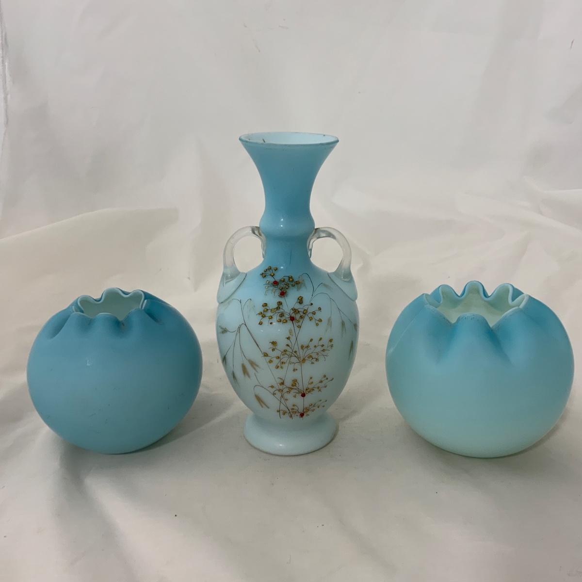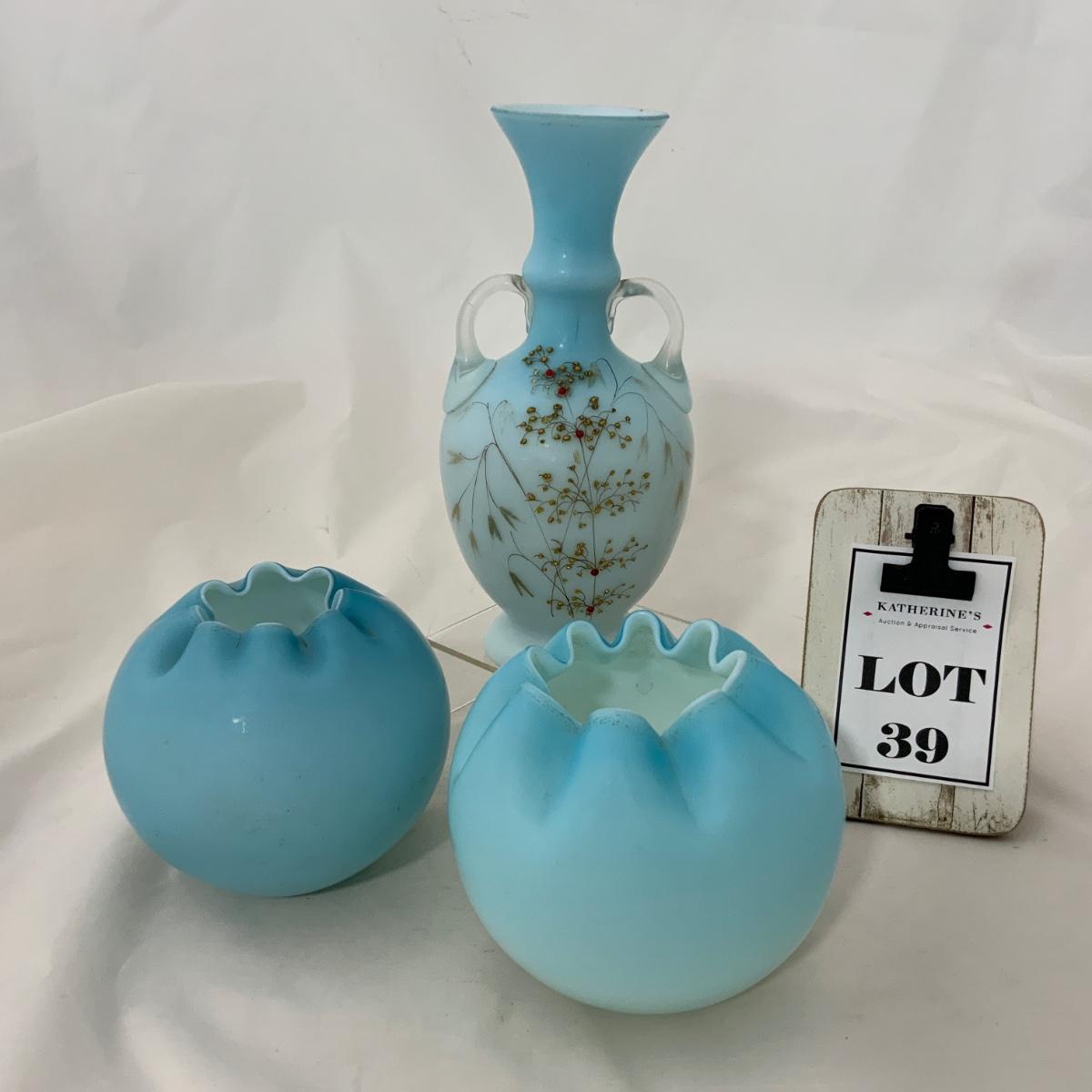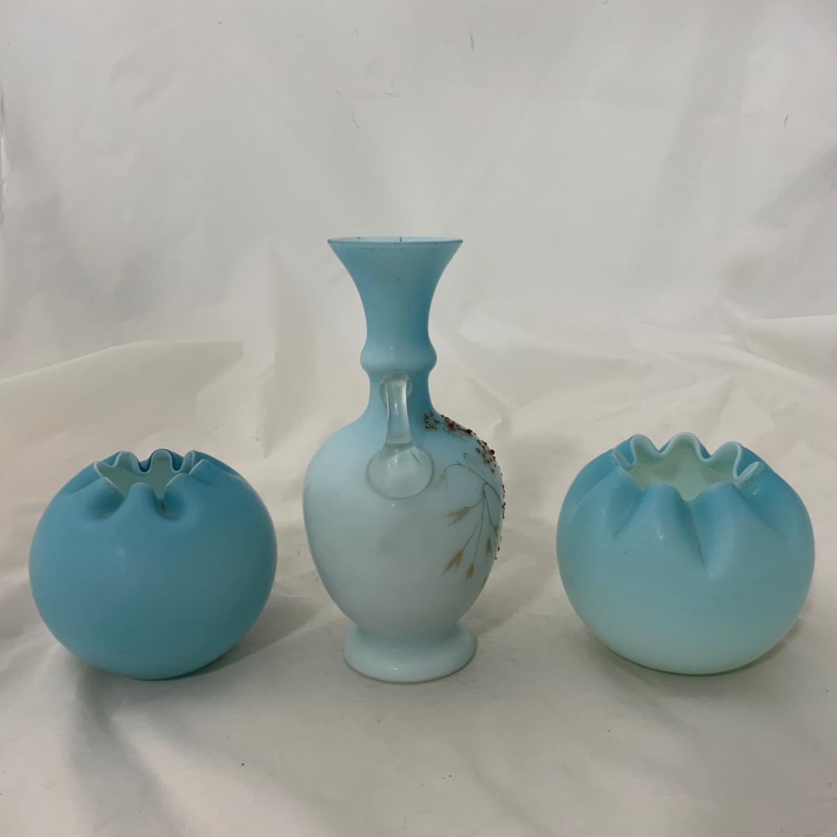 Two gorgeous Blue Satin Glass Rose Bowls and one Blue Satin Glass Double-Handled Hand-Enameled Vase. The raised flowers on the vase are incredibly attractive, don’t you think? If you don’t have something like this in your collection yet, it’s about time you did! All three pieces have some wear due to age, but overall look absolutely fantastic. Please see photos for details and condition. ::: Shipping is available on this lot. If you require shipping you must let us know at the close of the auction. We will coordinate with you after the item has been won. Shipping fees will include insurance up to or exceeding the value of all items being mailed. If you have any questions regarding this lot please contact the auctioneer either via this website, by direct email or by phone. PICK UP TIMES and other important information can be found in the TERMS and DESCRIPTION of the auction. Please take a look for pertinent information. Thanks!