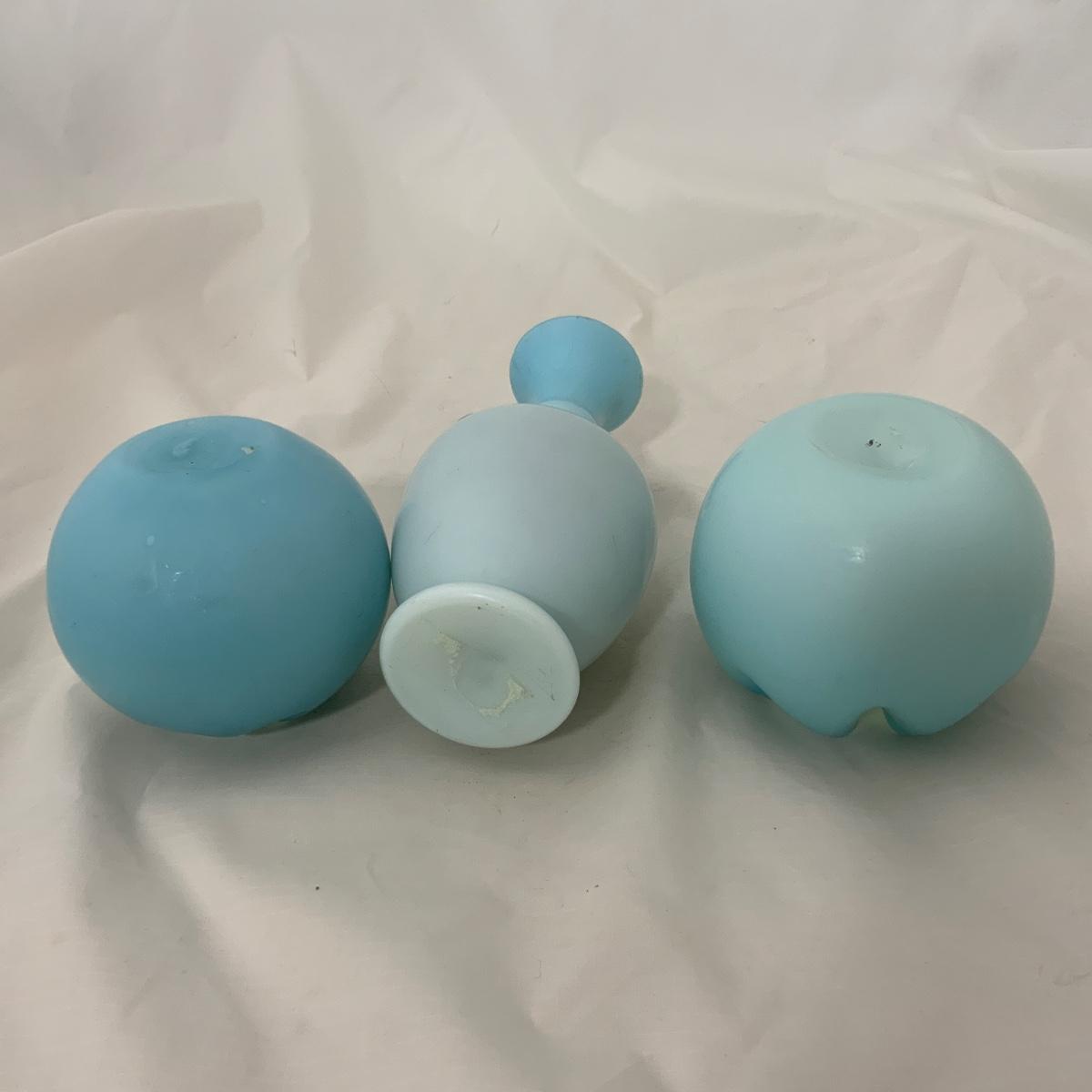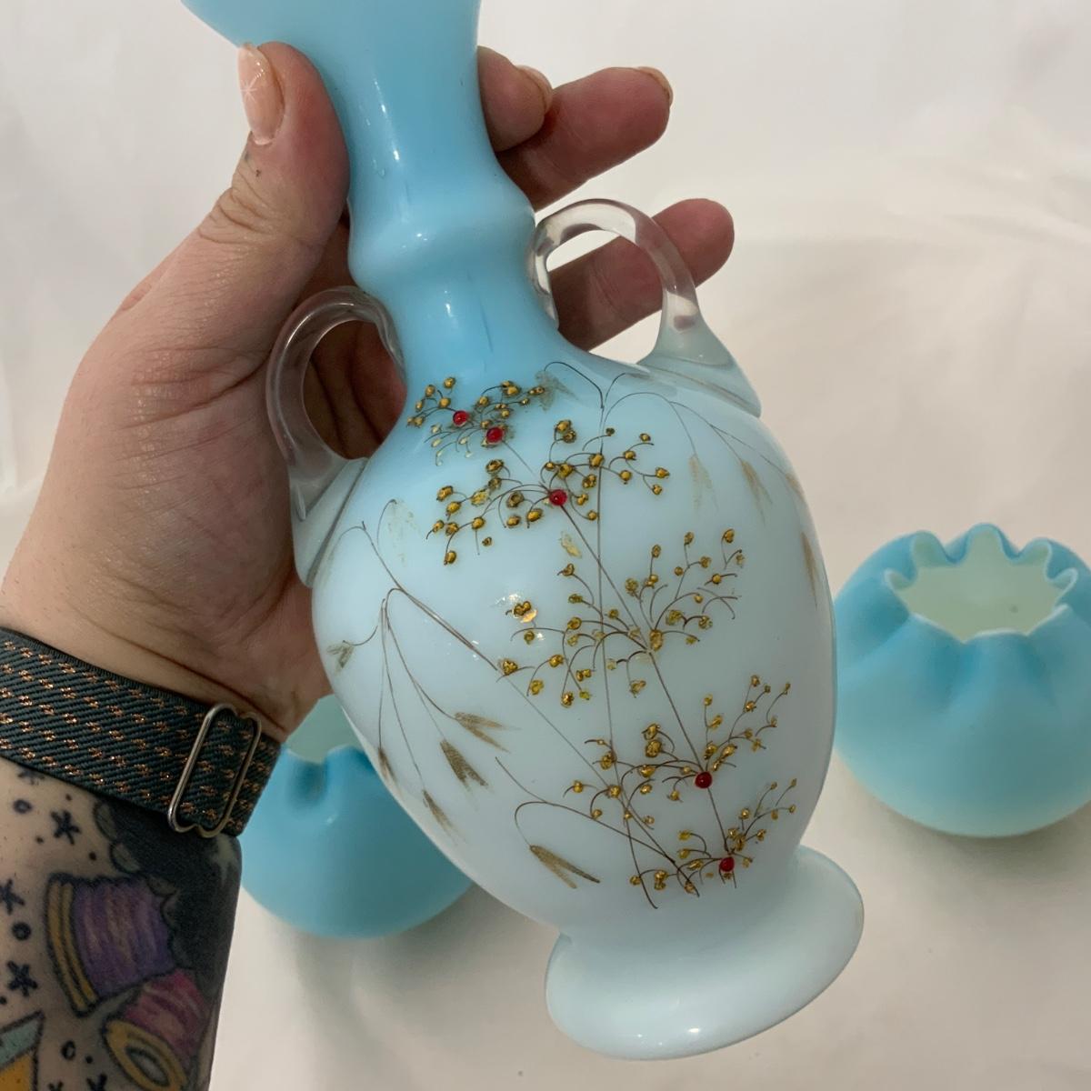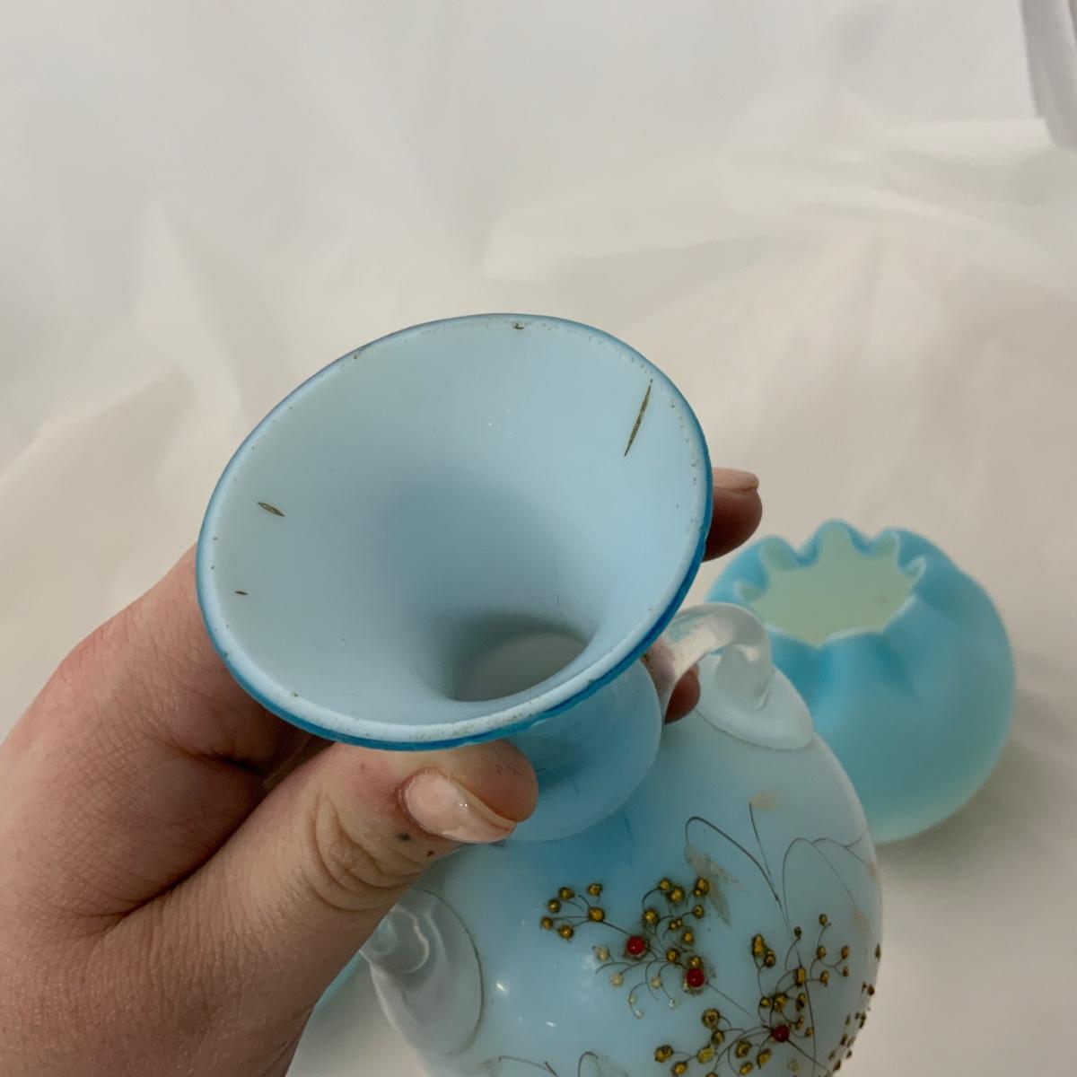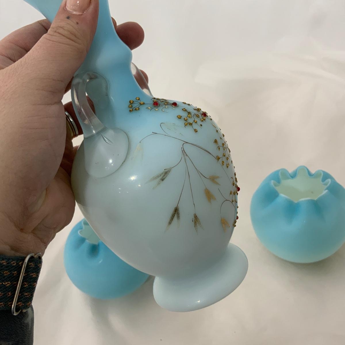 Two gorgeous Blue Satin Glass Rose Bowls and one Blue Satin Glass Double-Handled Hand-Enameled Vase. The raised flowers on the vase are incredibly attractive, don’t you think? If you don’t have something like this in your collection yet, it’s about time you did! All three pieces have some wear due to age, but overall look absolutely fantastic. Please see photos for details and condition. ::: Shipping is available on this lot. If you require shipping you must let us know at the close of the auction. We will coordinate with you after the item has been won. Shipping fees will include insurance up to or exceeding the value of all items being mailed. If you have any questions regarding this lot please contact the auctioneer either via this website, by direct email or by phone. PICK UP TIMES and other important information can be found in the TERMS and DESCRIPTION of the auction. Please take a look for pertinent information. Thanks!