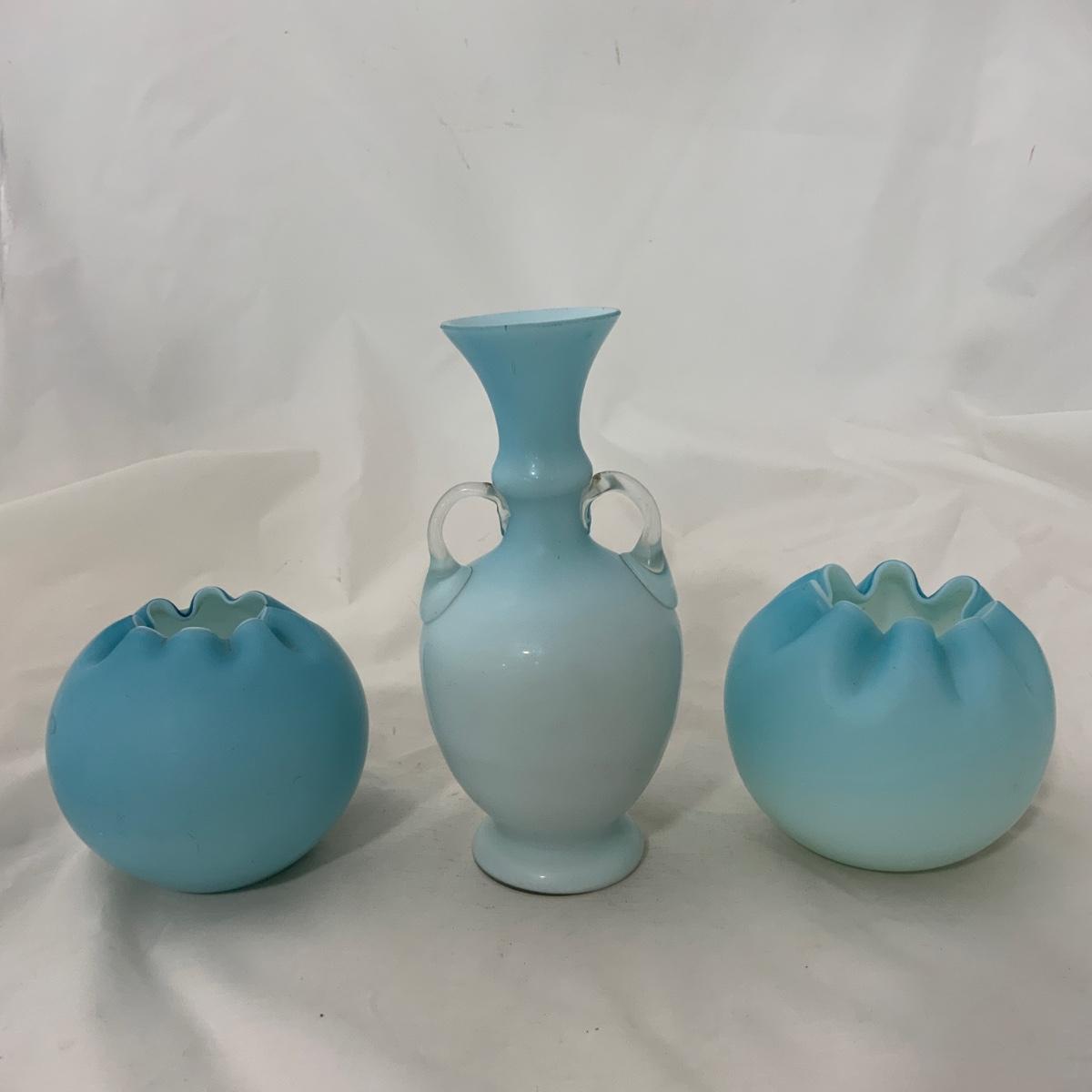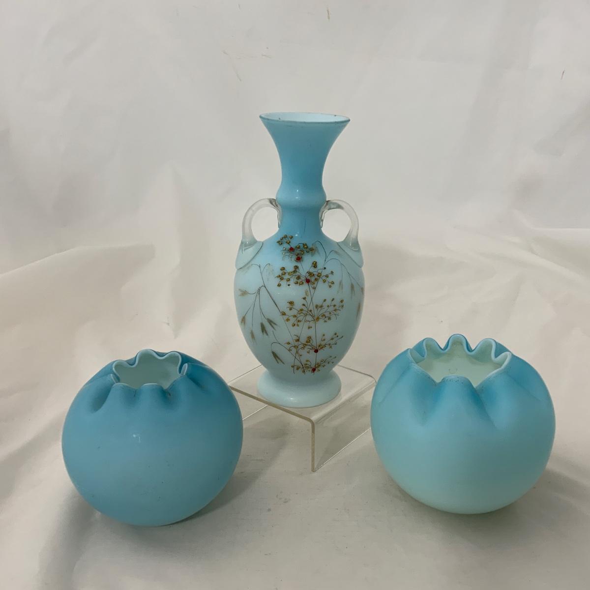 .39. Blue Satin Glass Rose Bowls | Double-Handled Vase | c. 1890