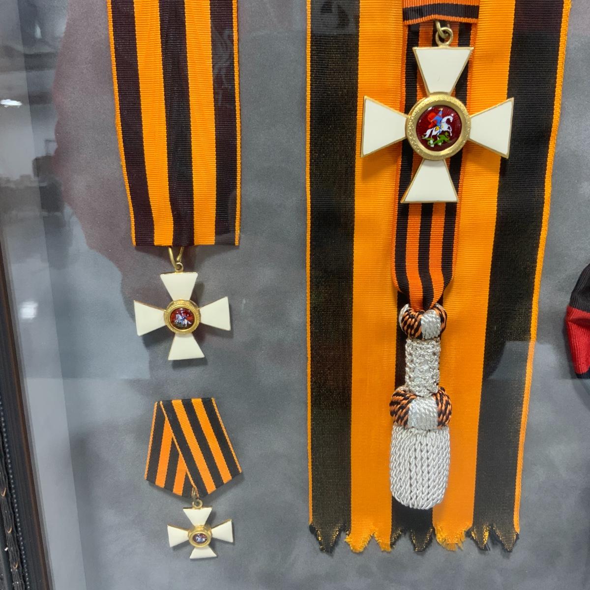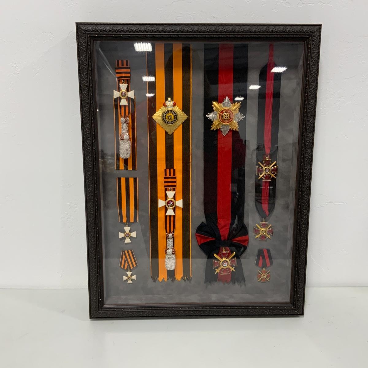 From the Estate of Peter Radovanovich: Elegantly Framed Medals from the Russian Federation in their different iterations depending on rank. On the Left are medals from the Order of St George awarded for Service and Courage. On the Right are medals from The Order of St. Vladimir as issued by the Russian Empire. All Medals are excellent reproductions. They are framed behind conservation glass by a reputable local frame shop. Frame measures 27” x 20.5”. Please see photos for details and condition. ::: Shipping is available on this lot. If you require shipping you must let us know at the close of the auction. We will coordinate with you after the item has been won. Shipping fees will include insurance up to or exceeding the value of all items being mailed. If you have any questions regarding this lot please contact the auctioneer either via this website, by direct email or by phone. PICK UP TIMES and other important information can be found in the TERMS and DESCRIPTION of the auction. Please take a look for pertinent information. Thanks!