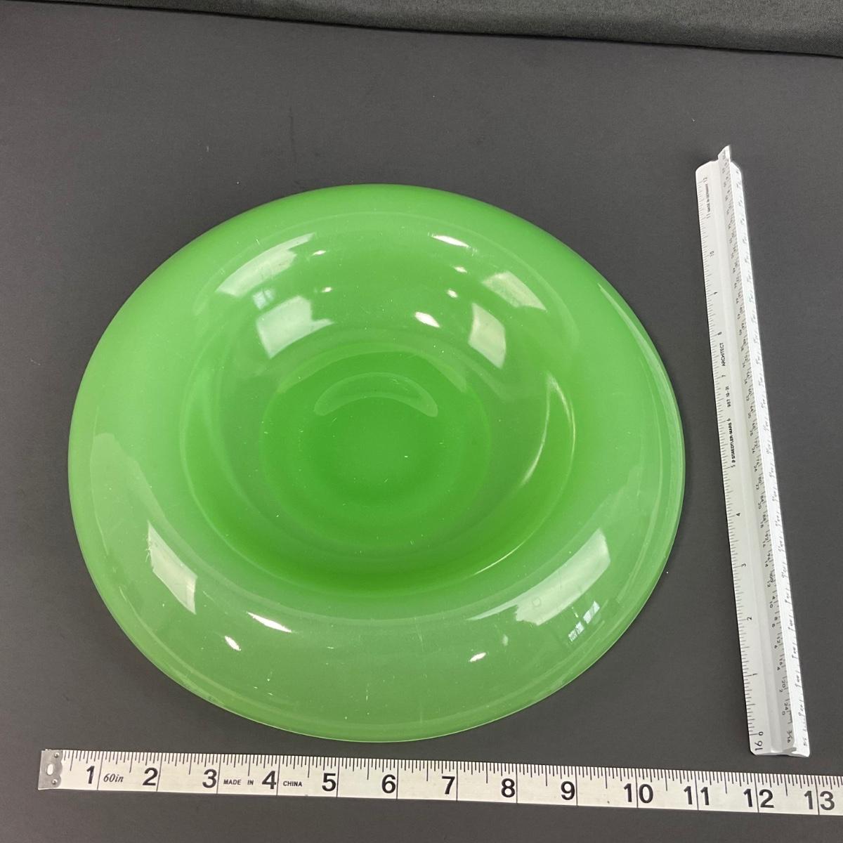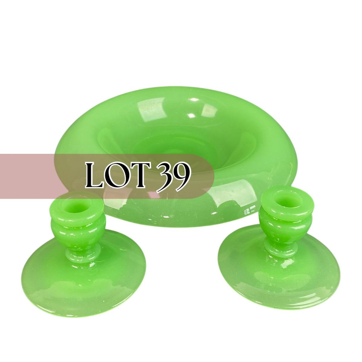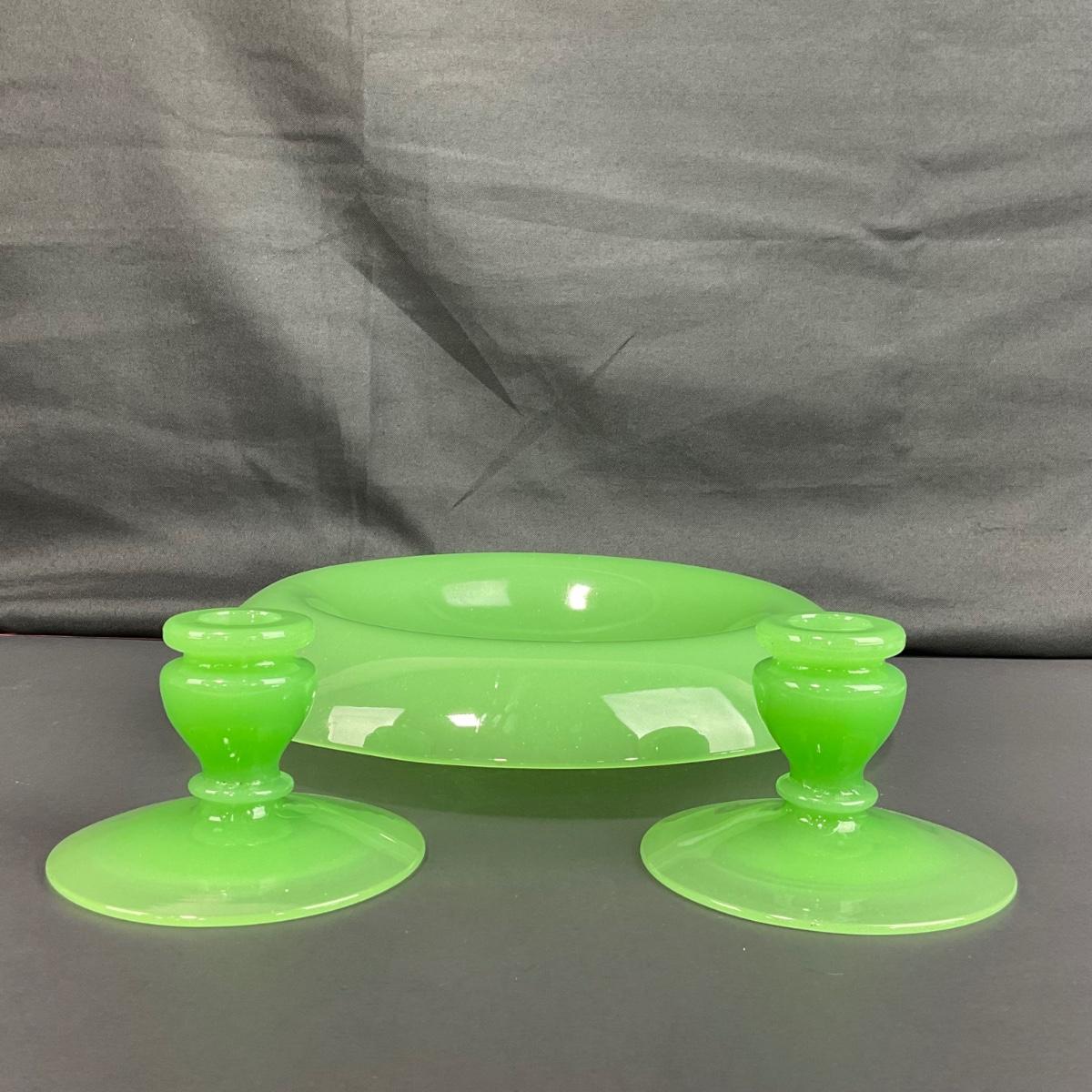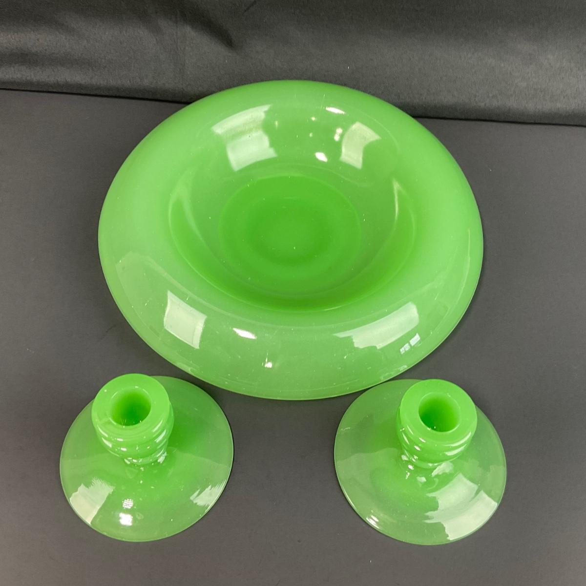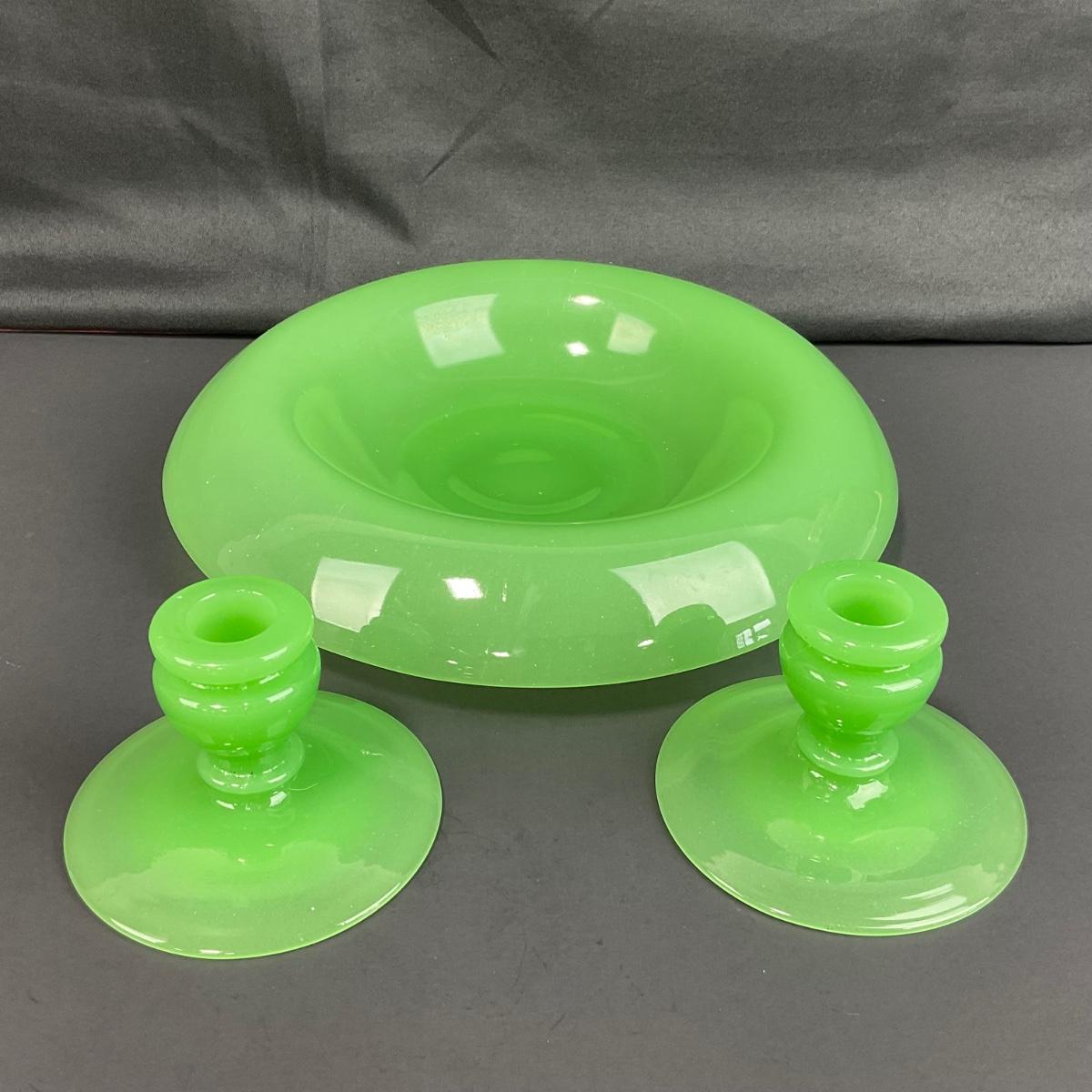 -39- FENTON | Jade Green Rolled Rim Console Bowl & Candle Stick Holders