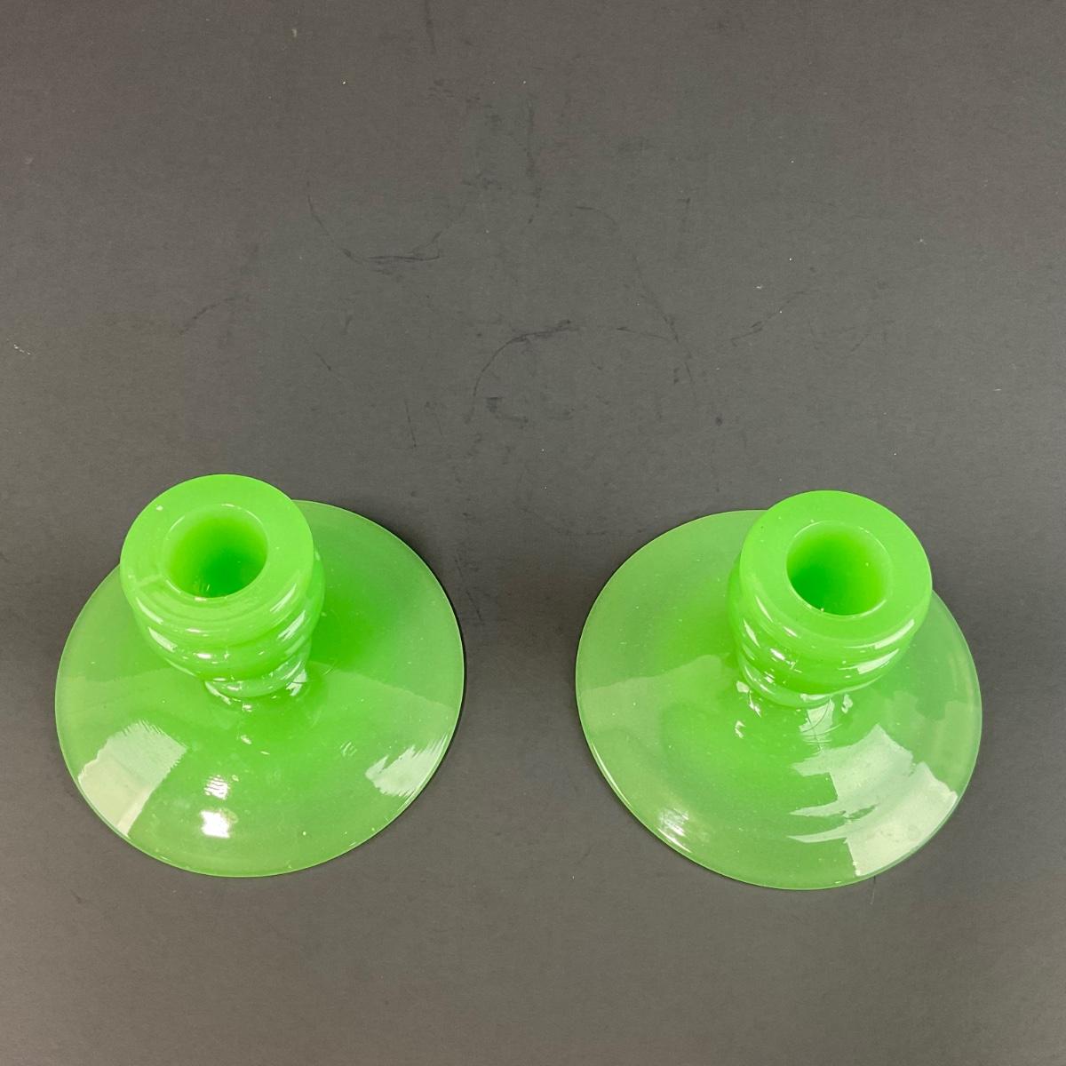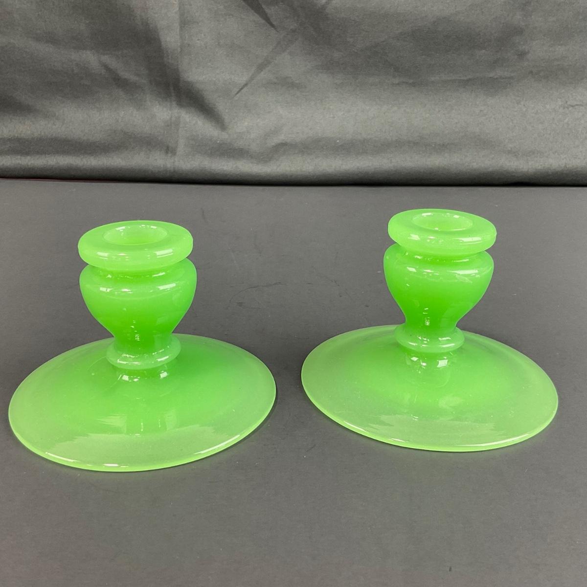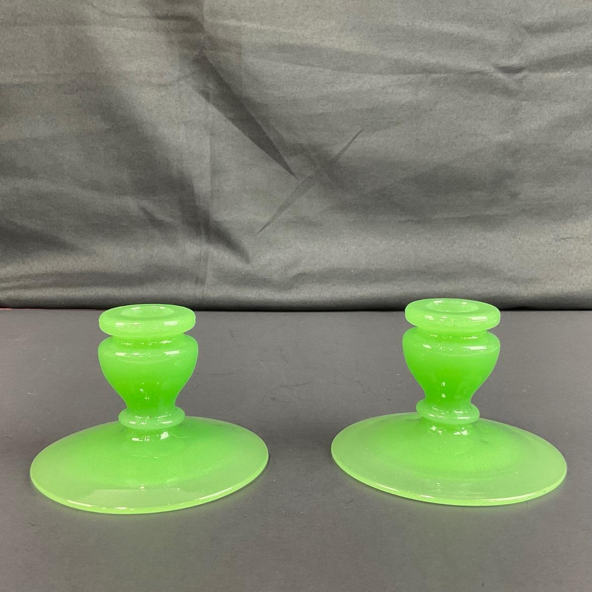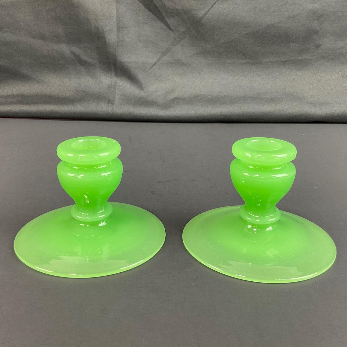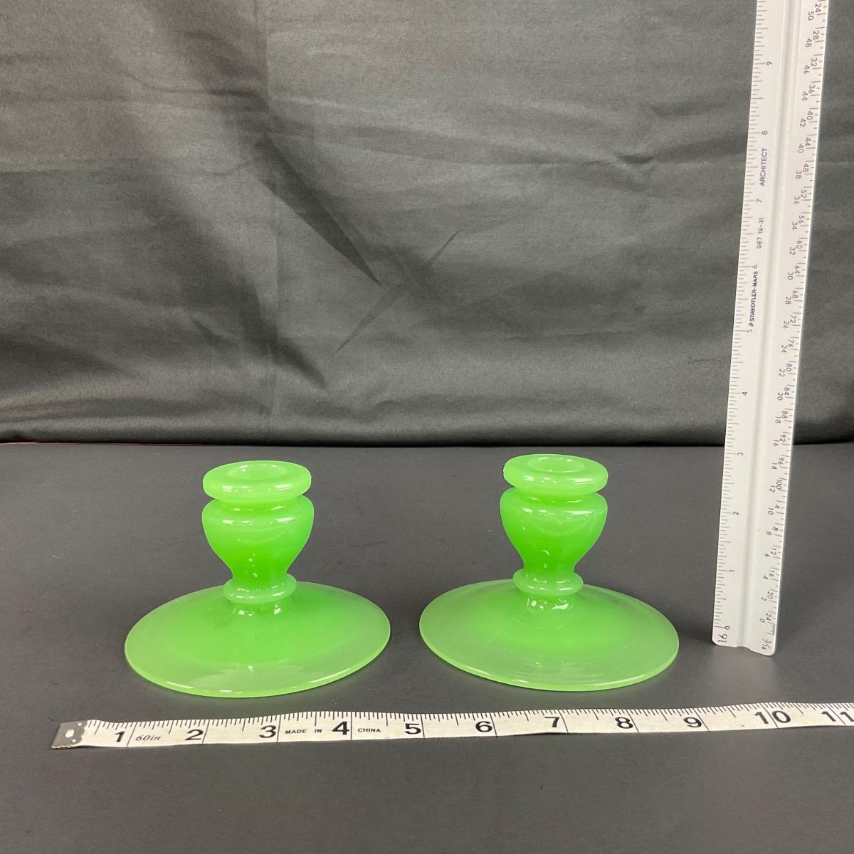 Three piece set of Fenton jade green rolled rim console bowl and pair of candle holders. This piece does have some scuffs, scratches, marks, or slight damage, but otherwise appears to be in great shape and is from the 1930’s. Please see photos for details and condition. Any condition statement is given as a courtesy to a client, is an opinion, and should not be treated as a statement of fact. Reference to condition written, oral or within a condition report shall not be regarded as a full account of condition and may not include all defects, alterations, or restorations. Absence of a condition report does not imply a lot is flawless or lacking imperfections or damage. Katherine’s Auction & Appraisal Service shall have no responsibility for any error or omission. Returns shall not be accepted on the basis of condition. ::: Shipping is available on this lot. If you require shipping you must let us know at the close of the auction. We will coordinate with you after the item has been won. Shipping fees will include insurance up to or exceeding the value of all items being mailed. If you have any questions regarding this lot please contact the auctioneer either via this website, by direct email or by phone. PICK UP TIMES and other important information can be found in the TERMS and DESCRIPTION of the auction. Please take a look for pertinent information. Thanks!