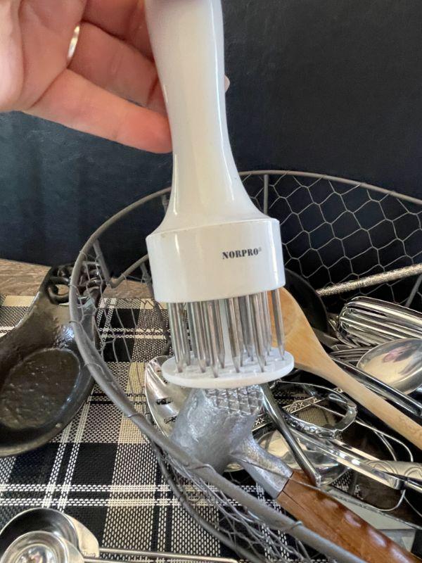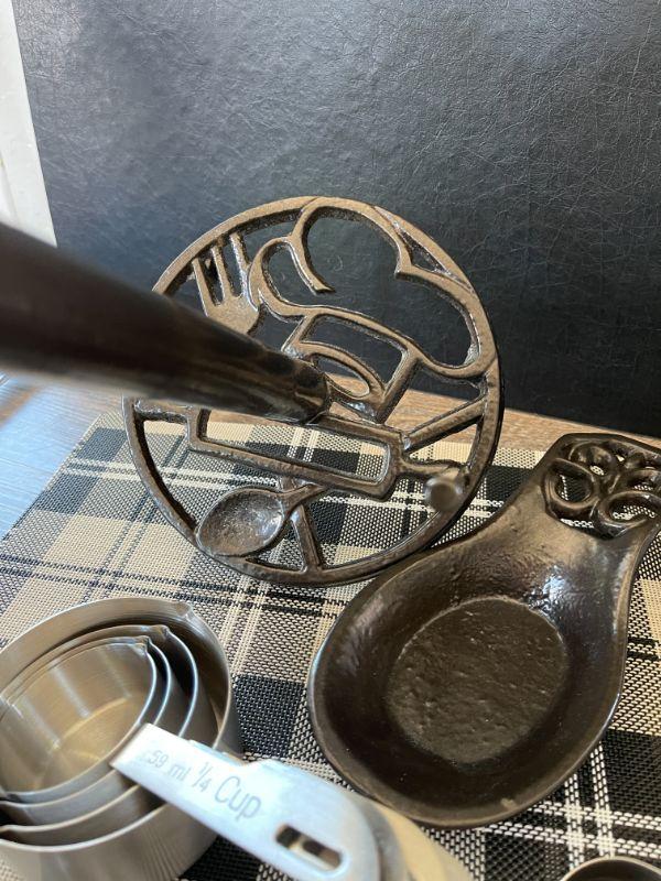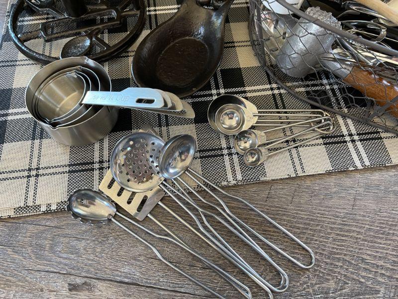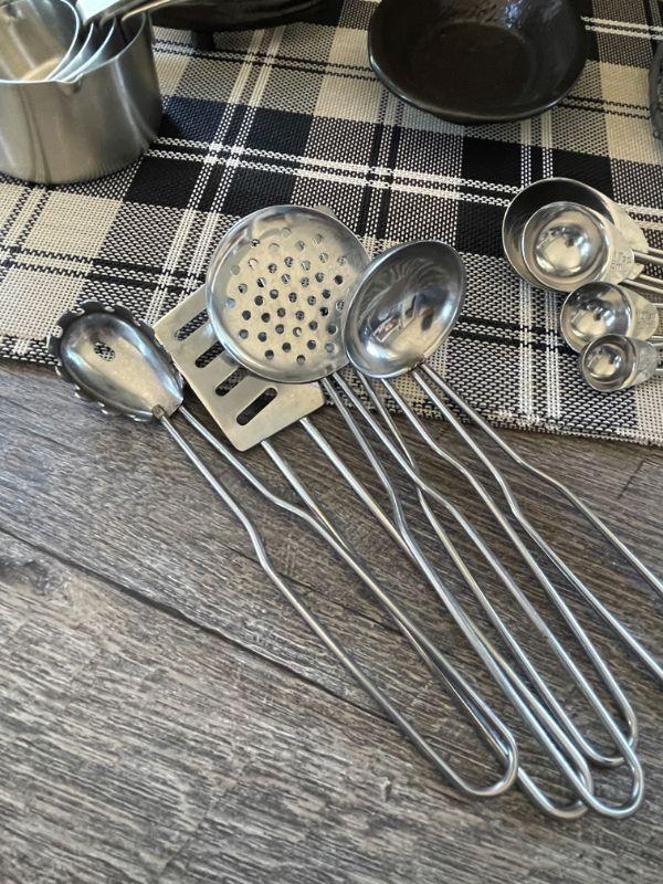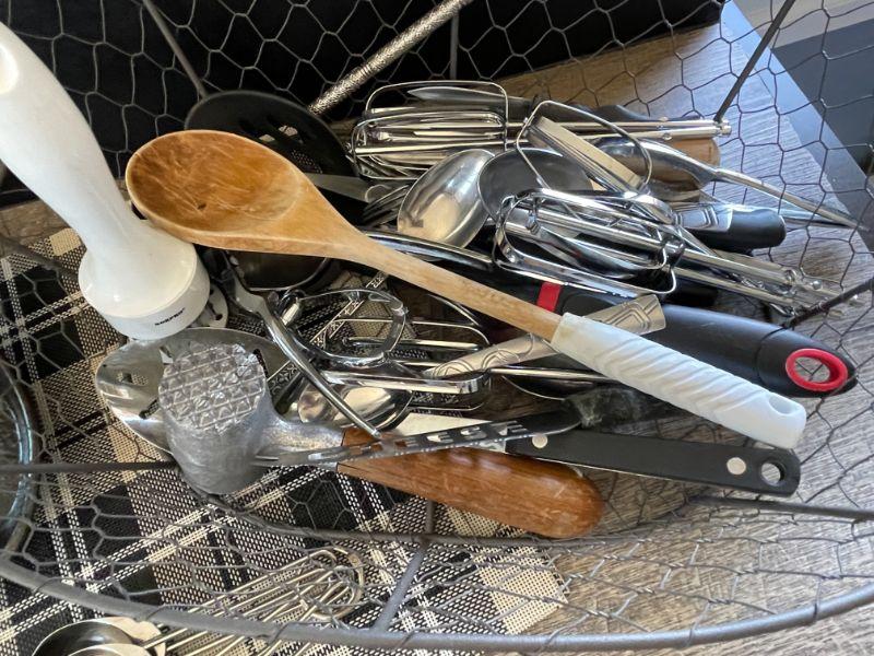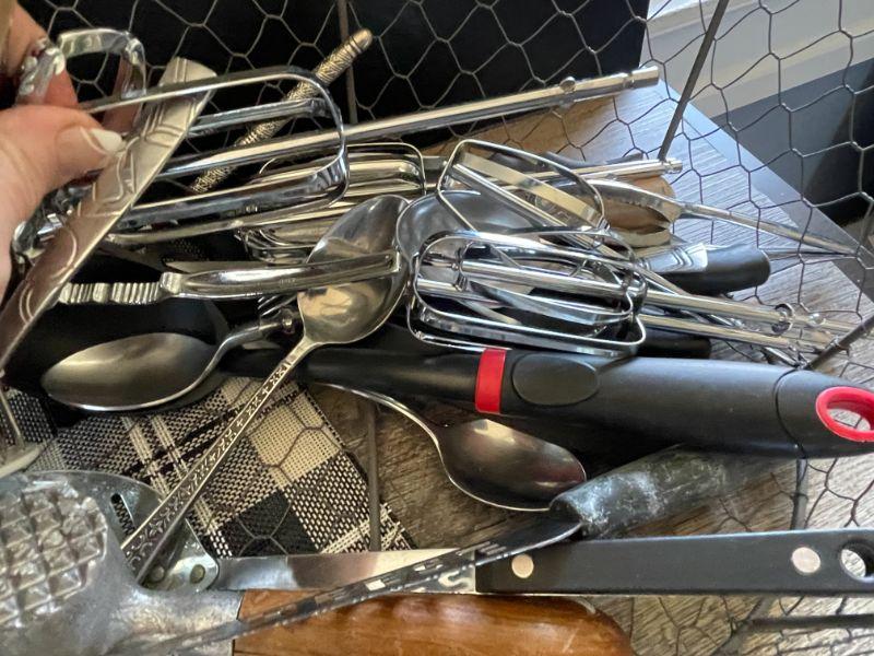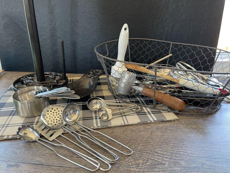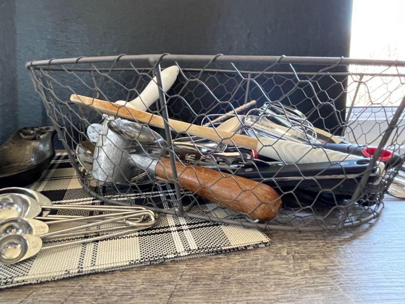 Chicken wire basket, utensils and tools, 8 plastic placemats.