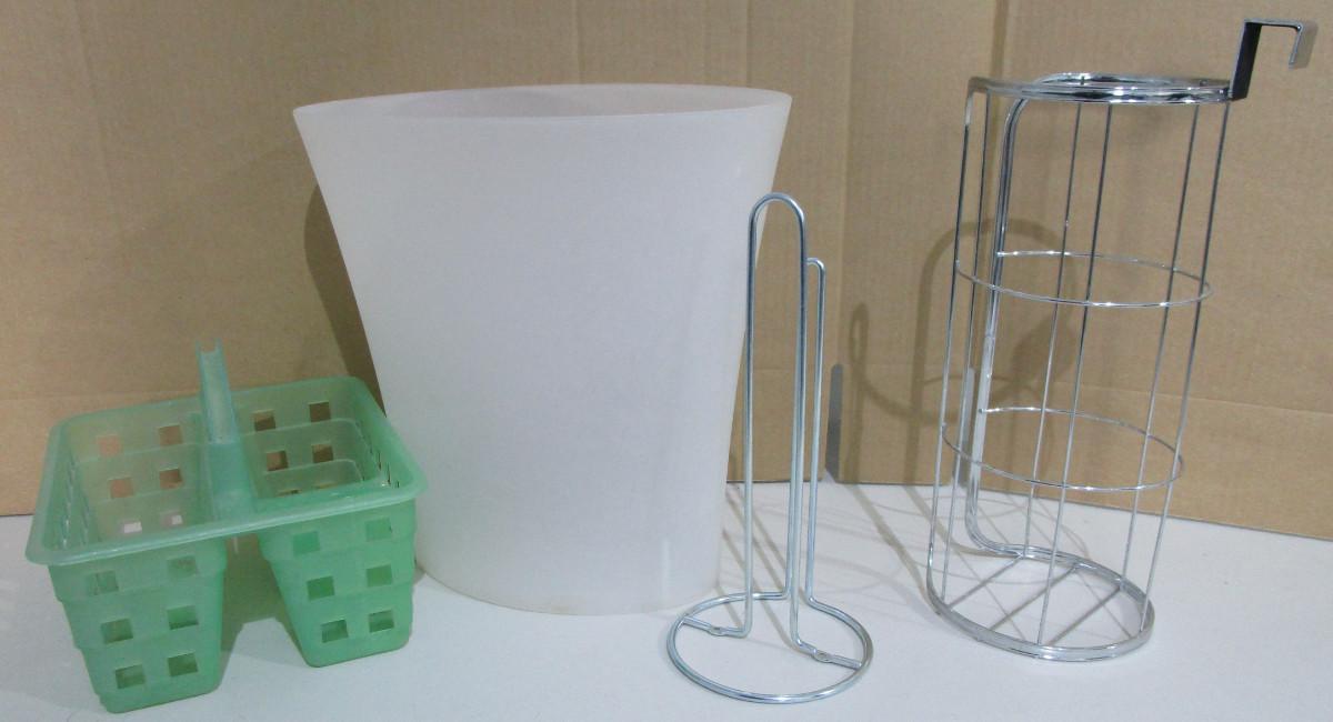 trash can, paper towel holder, toliet paper holder, shower caddy