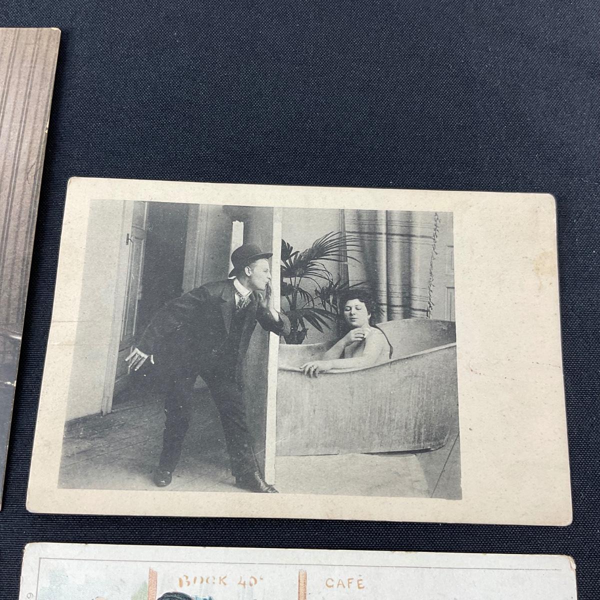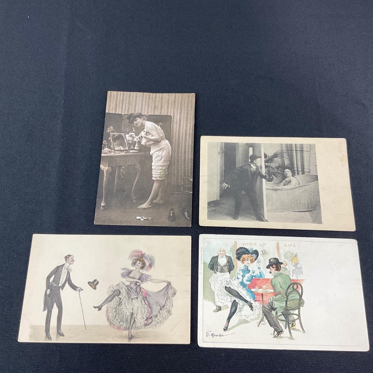 Four assorted vintage risqué ladies postcards. Please see photos for details and condition. Any condition statement is given as a courtesy to a client, is an opinion, and should not be treated as a statement of fact. Reference to condition written, oral or within a condition report shall not be regarded as a full account of condition and may not include all defects, alterations, or restorations. Absence of a condition report does not imply a lot is flawless or lacking imperfections or damage. Katherine’s Auction & Appraisal Service shall have no responsibility for any error or omission. Returns shall not be accepted on the basis of condition. ::: Shipping is available on this lot. If you require shipping you must let us know at the close of the auction. We will coordinate with you after the item has been won. Shipping fees will include insurance up to or exceeding the value of all items being mailed. If you have any questions regarding this lot please contact the auctioneer either via this website, by direct email or by phone. PICK UP TIMES and other important information can be found in the TERMS and DESCRIPTION of the auction. Please take a look for pertinent information. Thanks!