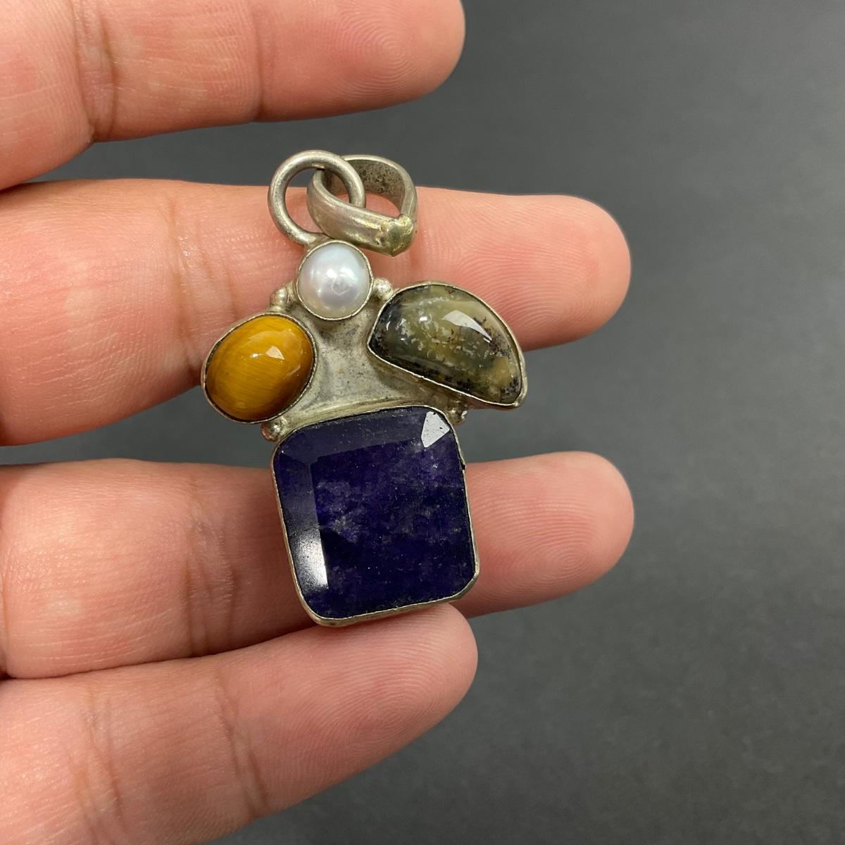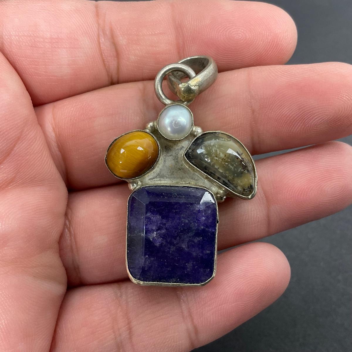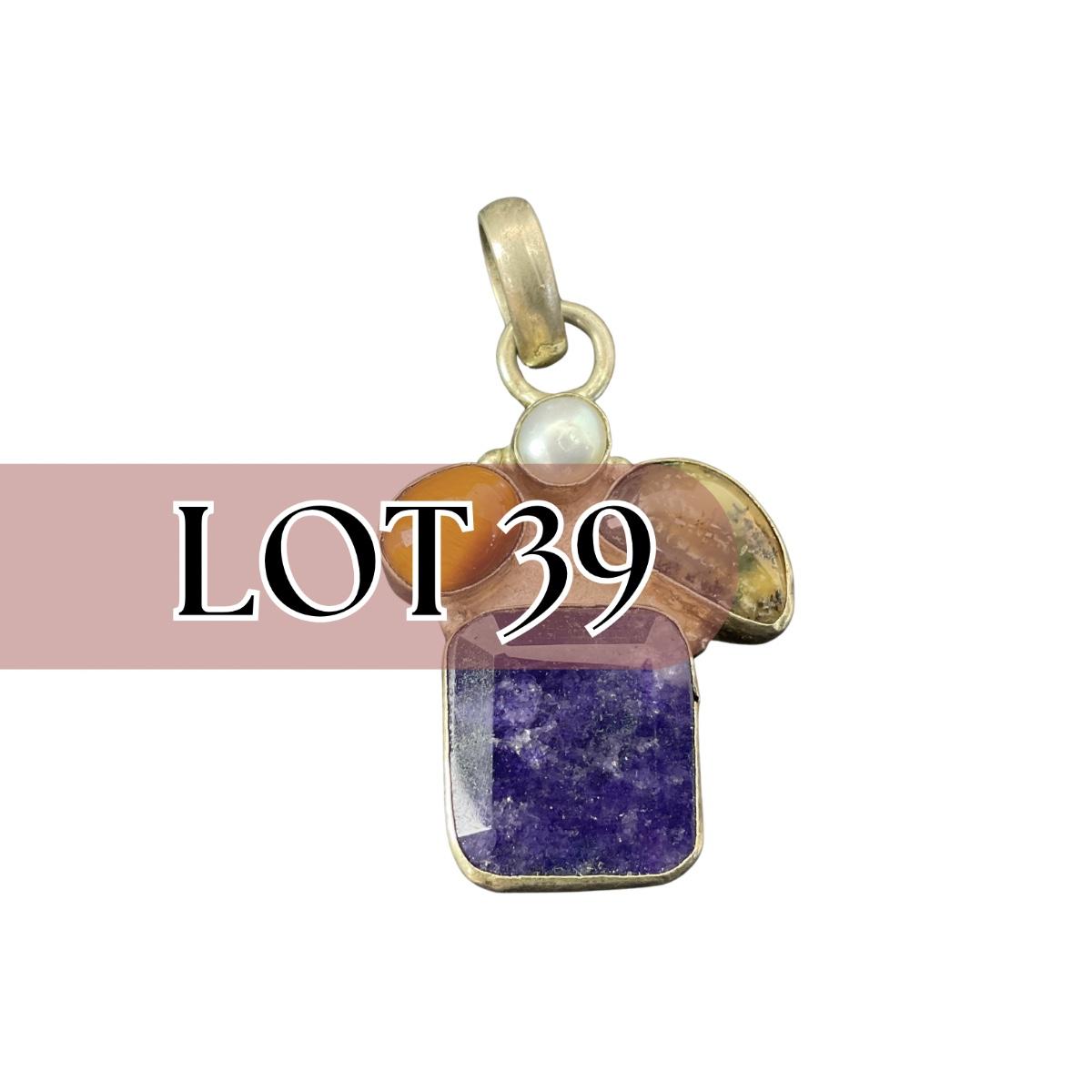 -39- SILVER | 925 Sterling Necklace Pendant & Polished Stones | Marked