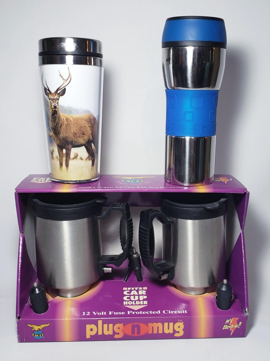 NIB pair of portable heated mugs, along with 2 other travel mugs