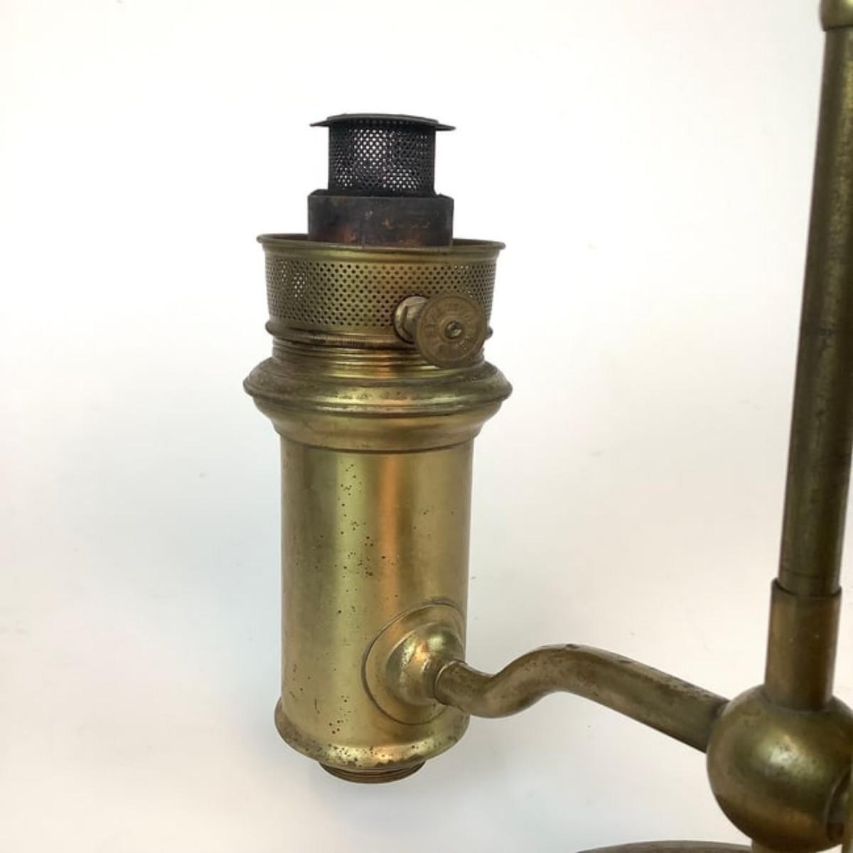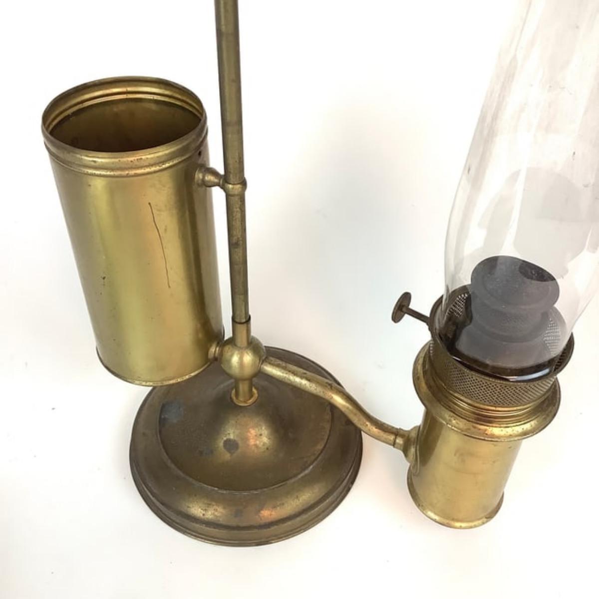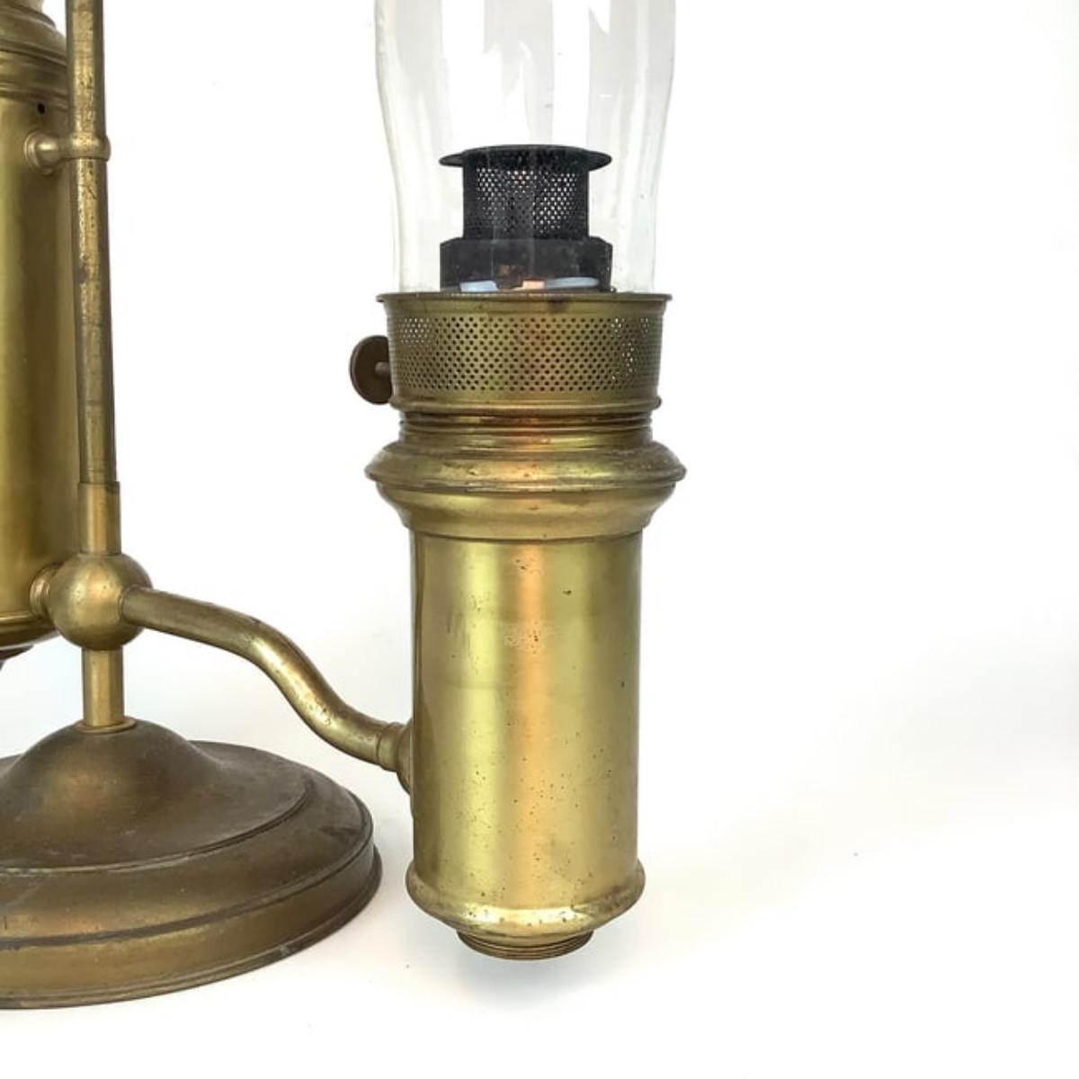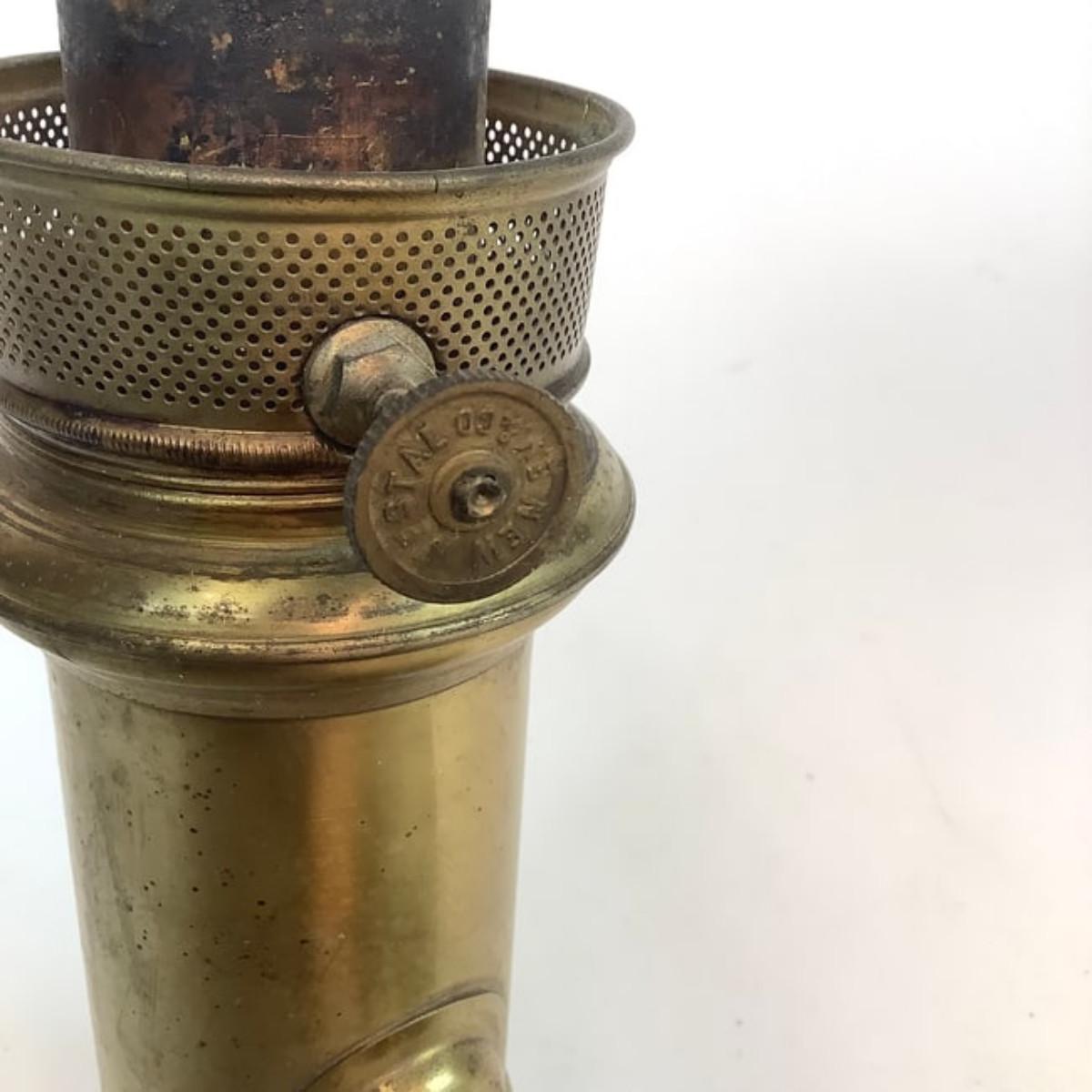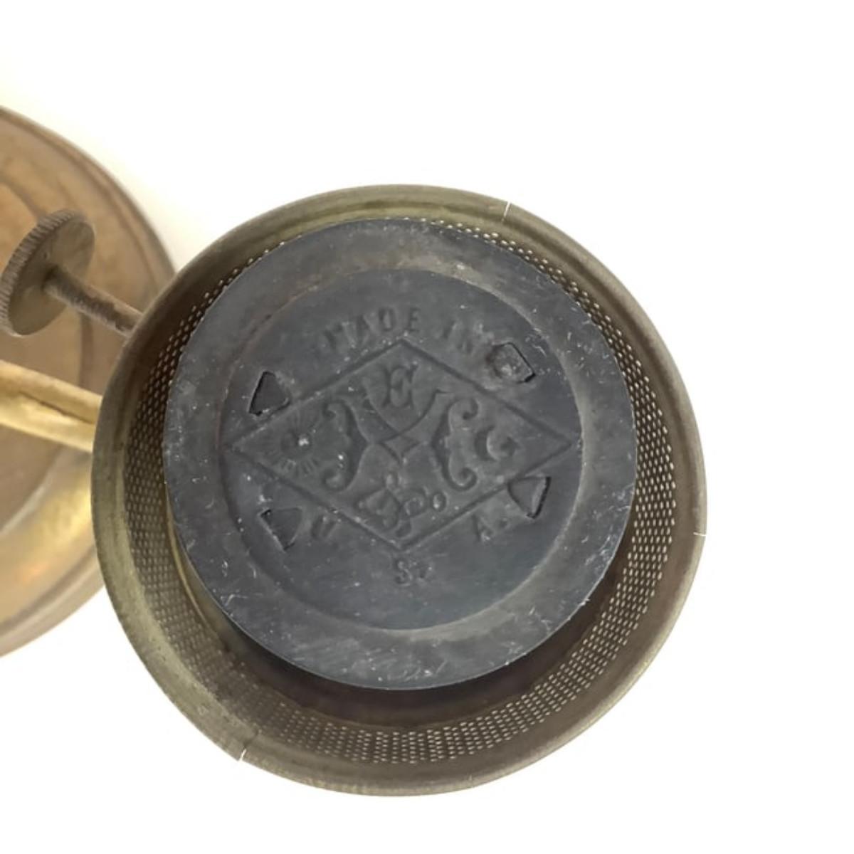This is an old, heavy brass oil lamp made by Miller. It has a tarnished brass finish and a turnable body. The glass globe is an Aladdin brand and has a small chip on the bottom that's hidden when attached. The word "Miller" is stamped on the bottom and "E.M. & Co. New Stal" stamped on burner knob. Lamp measures 21"H x 12"W with a base measuring 7"Diameter.