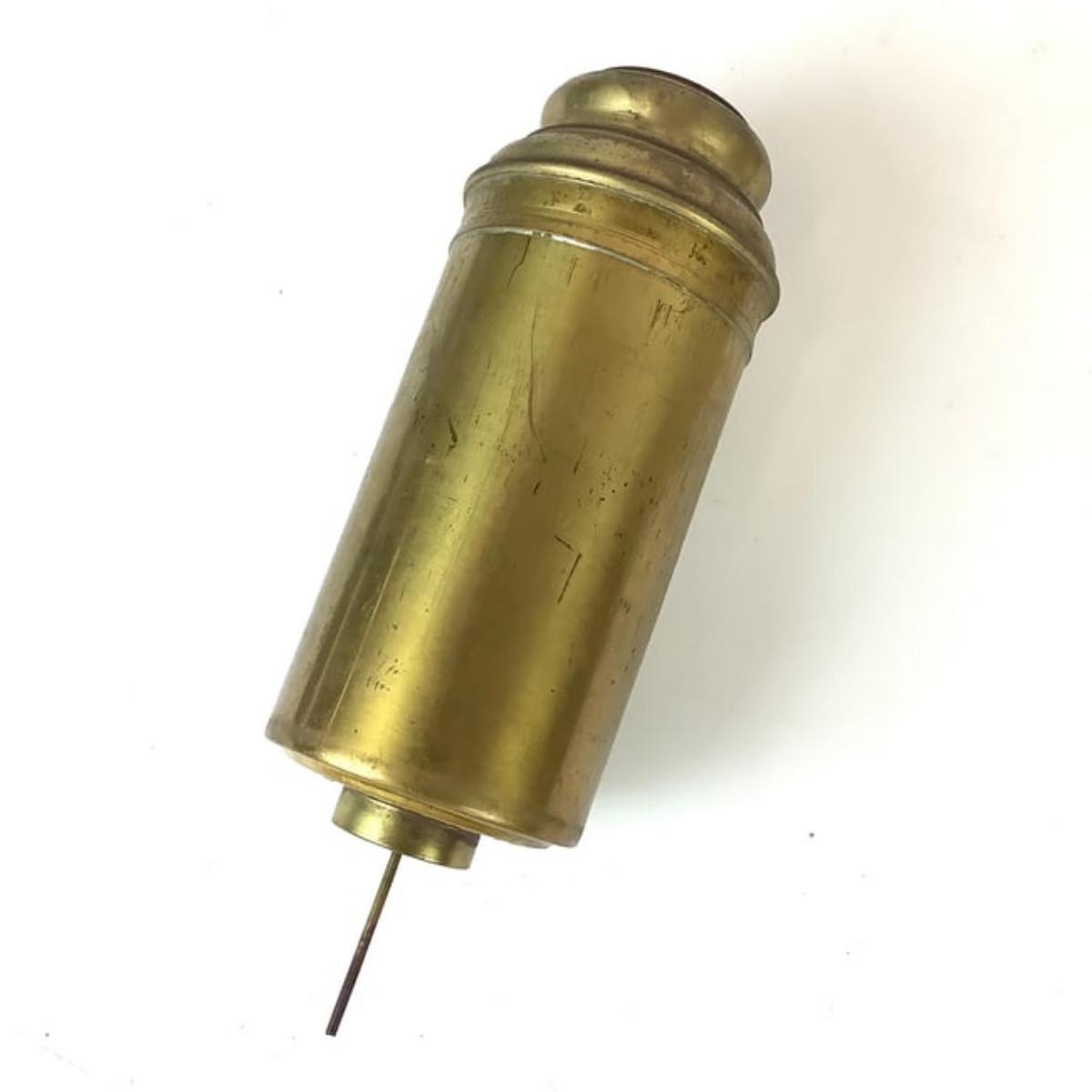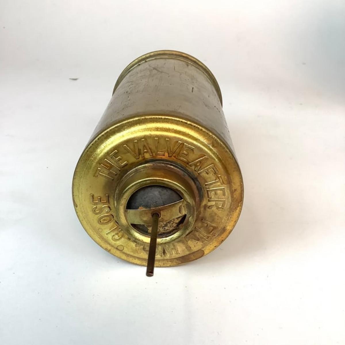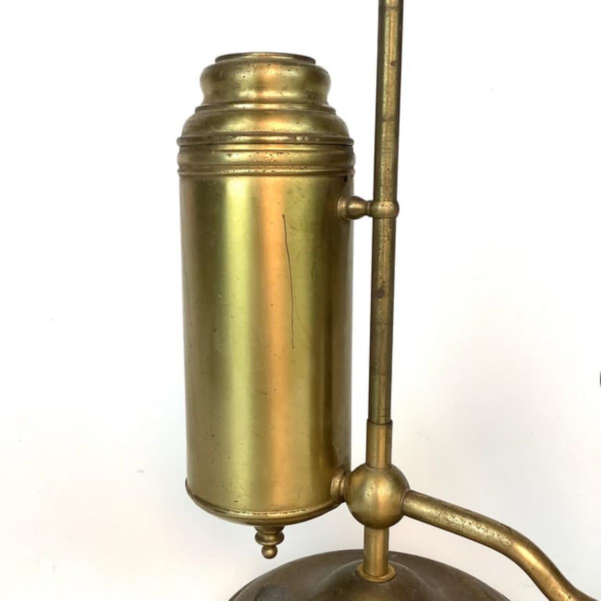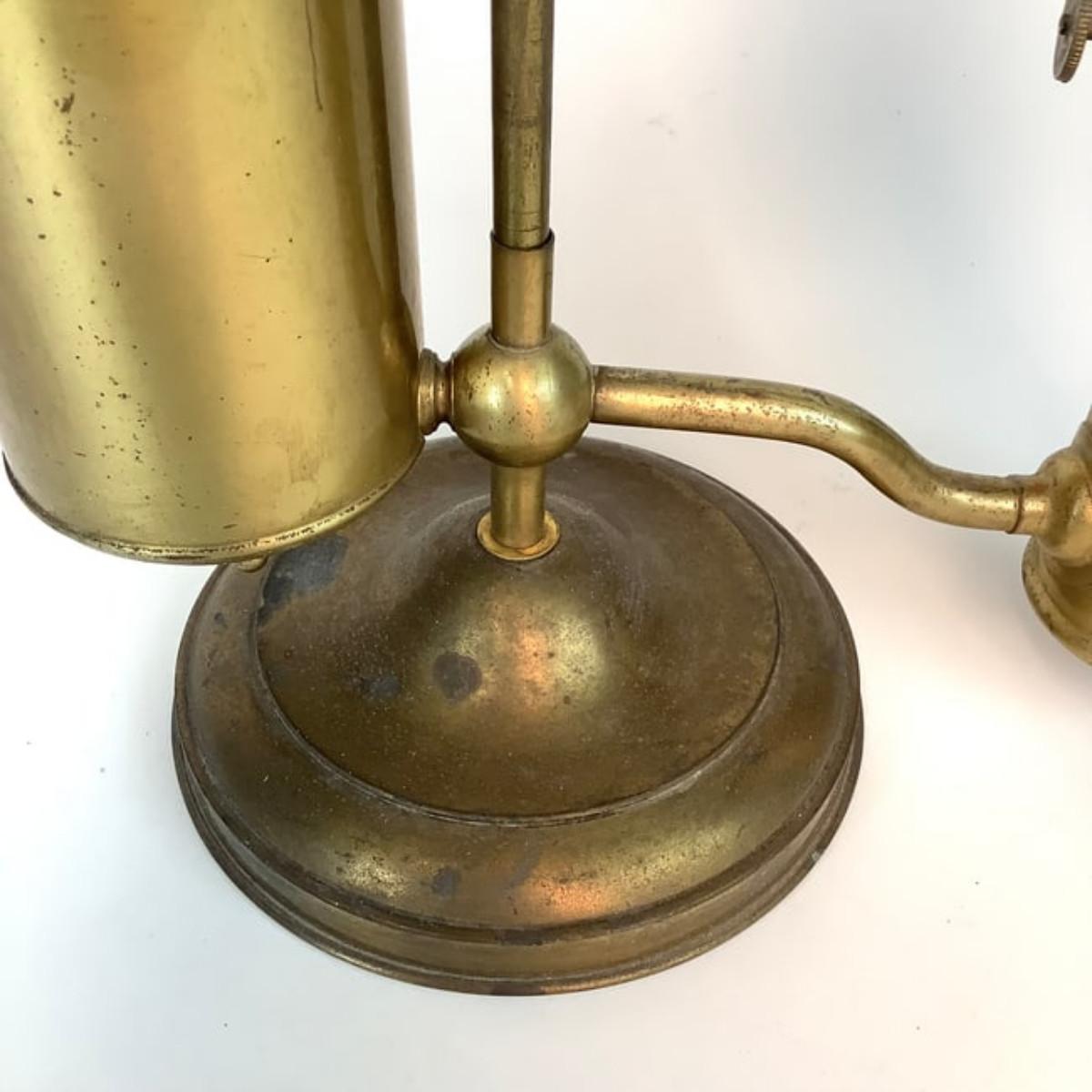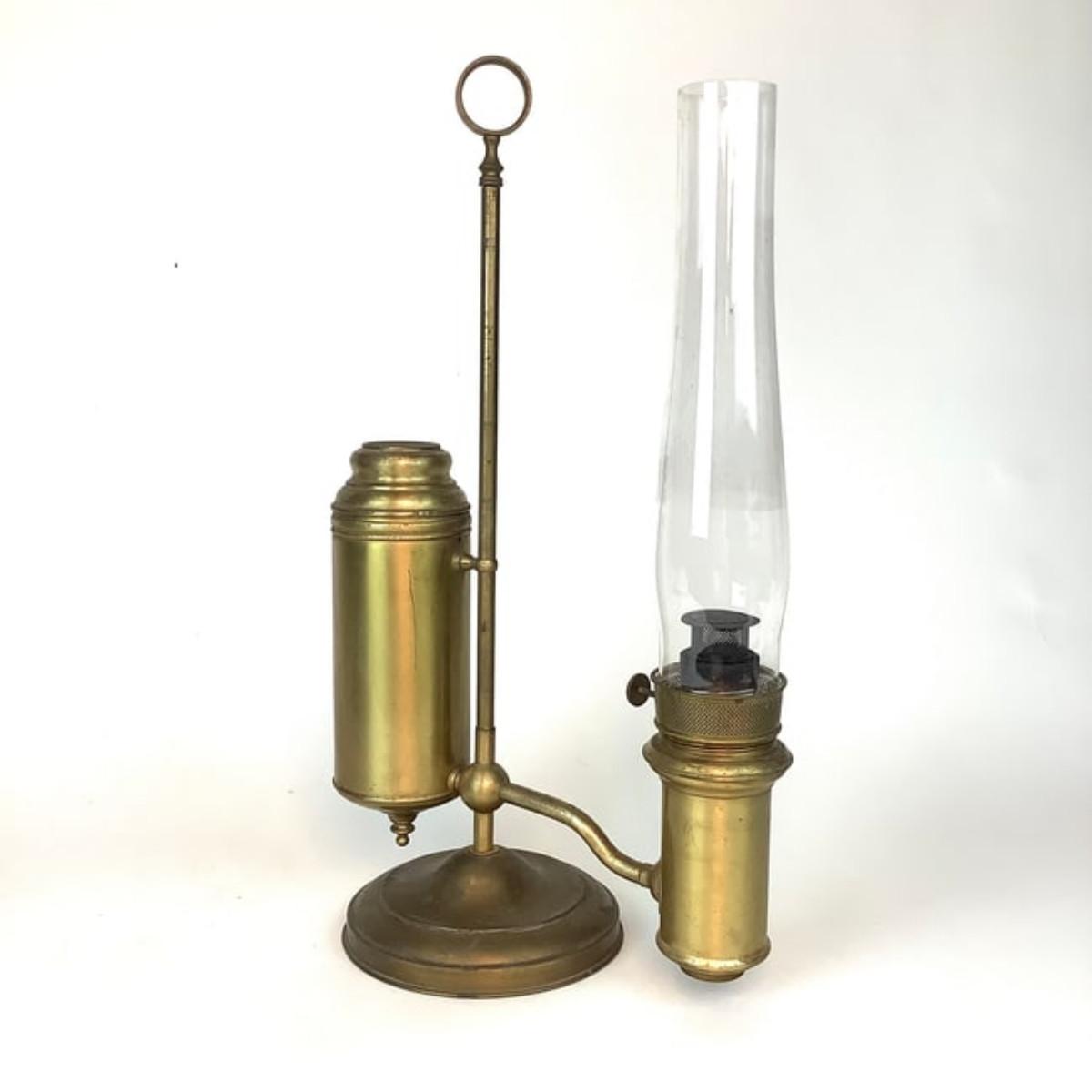 This is an old, heavy brass oil lamp made by Miller. It has a tarnished brass finish and a turnable body. The glass globe is an Aladdin brand and has a small chip on the bottom that's hidden when attached. The word "Miller" is stamped on the bottom and "E.M. & Co. New Stal" stamped on burner knob. Lamp measures 21"H x 12"W with a base measuring 7"Diameter.