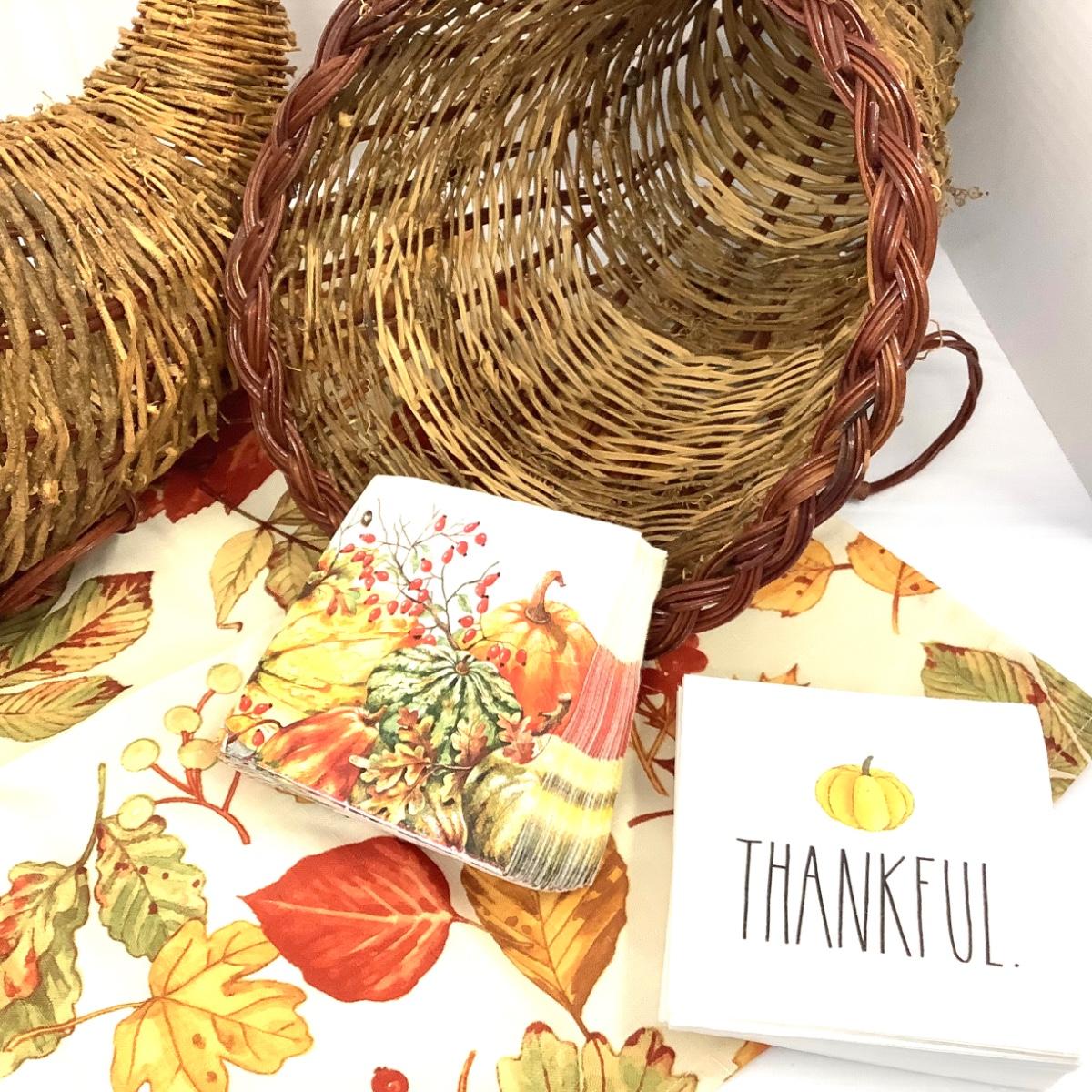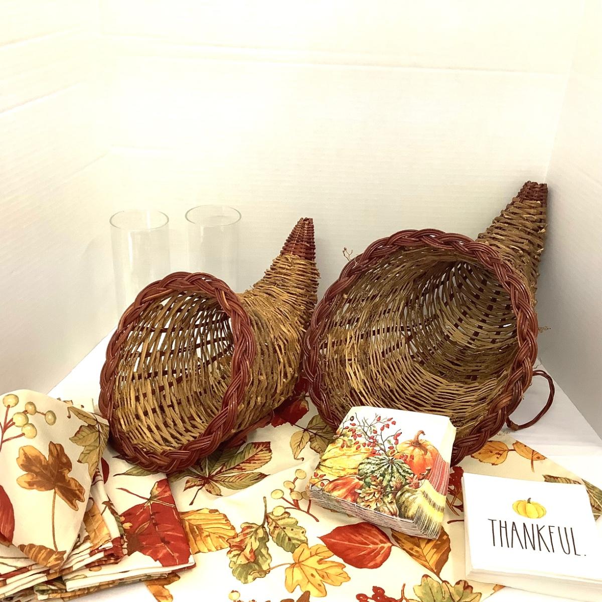 8- fall napkins, Rae Dumm Paper Napkins , 2 candle holders, 8" x 3" , 12" x 8" diameter cornucopia, 18" x 10" diameter