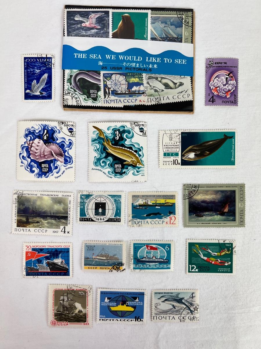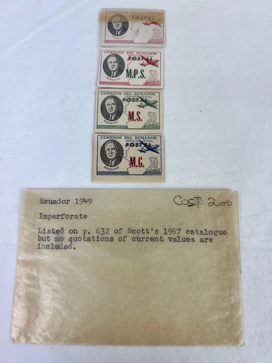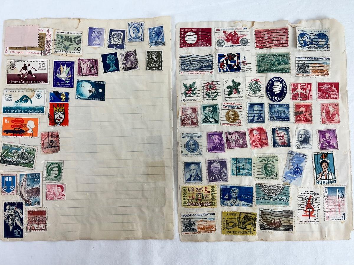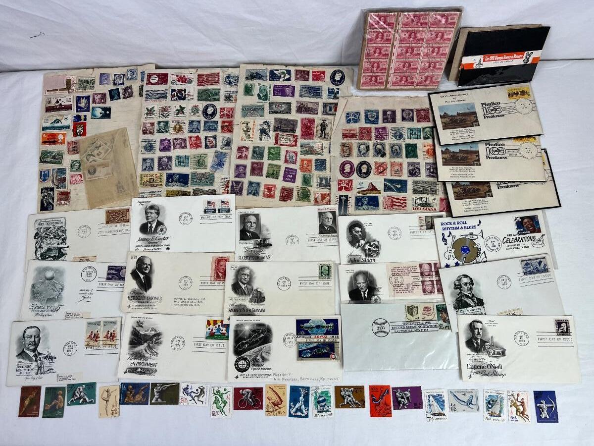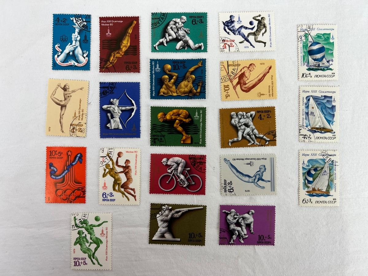 Lot collection of antique/vintage stamps. 1980s Olympic Games in Moscow stamps, Scott’s 1967s Catalog from Ecuador stamps, vintage nautical stamps, then odds and ends.