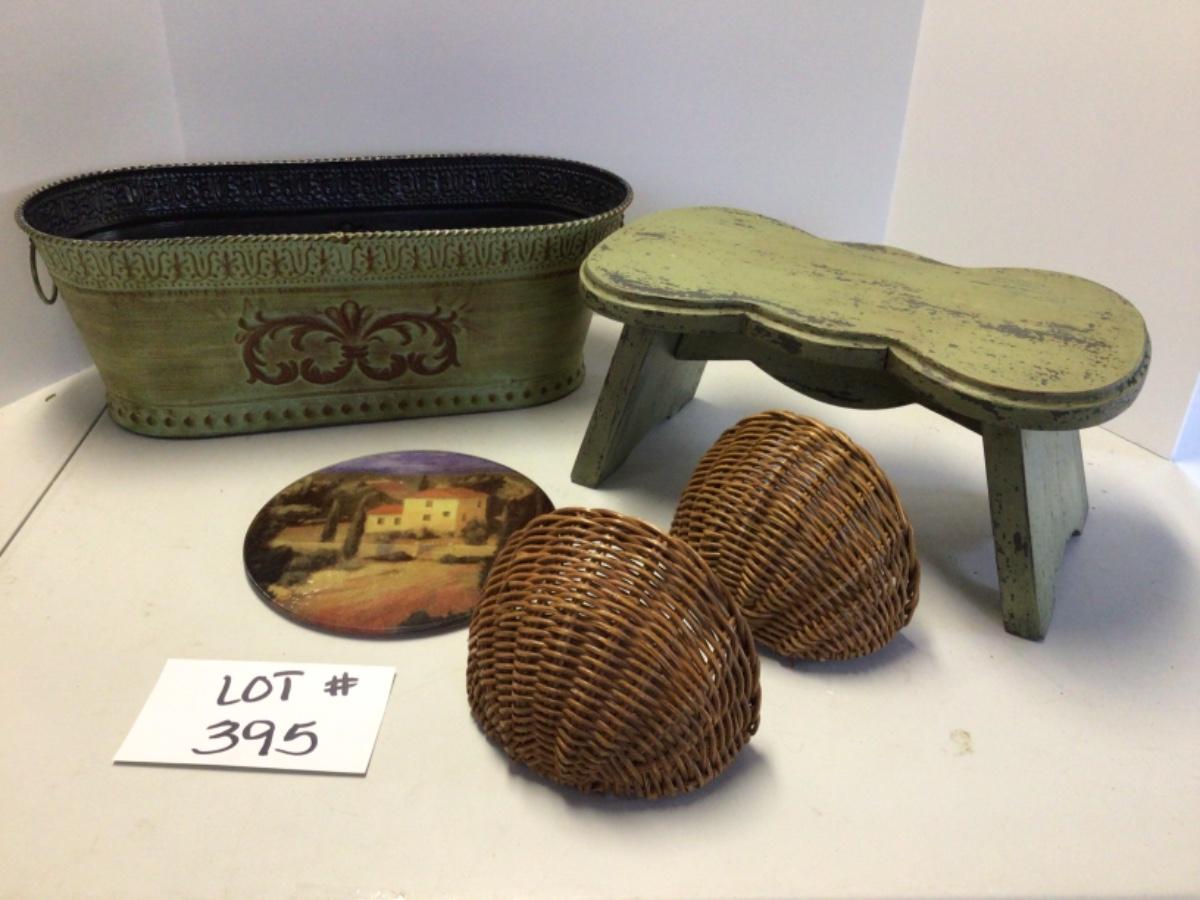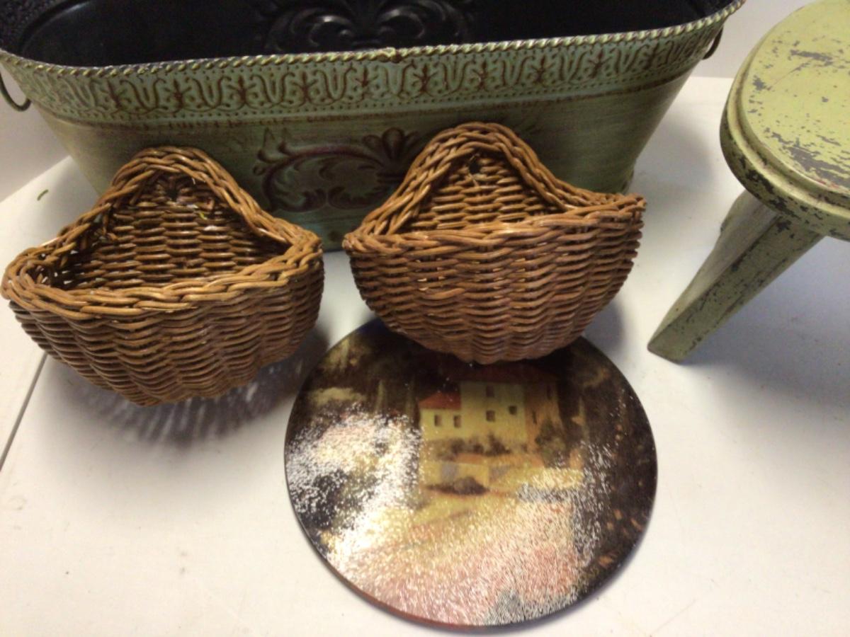 395 Green Stool, Planter, with Basket Wall Pockets , trivet