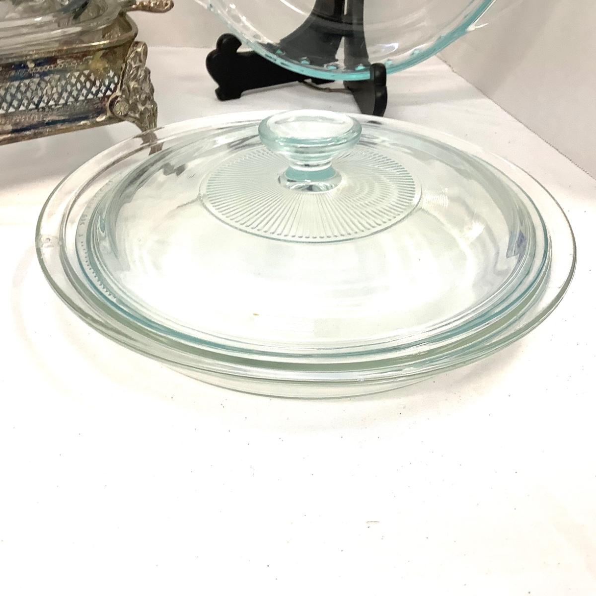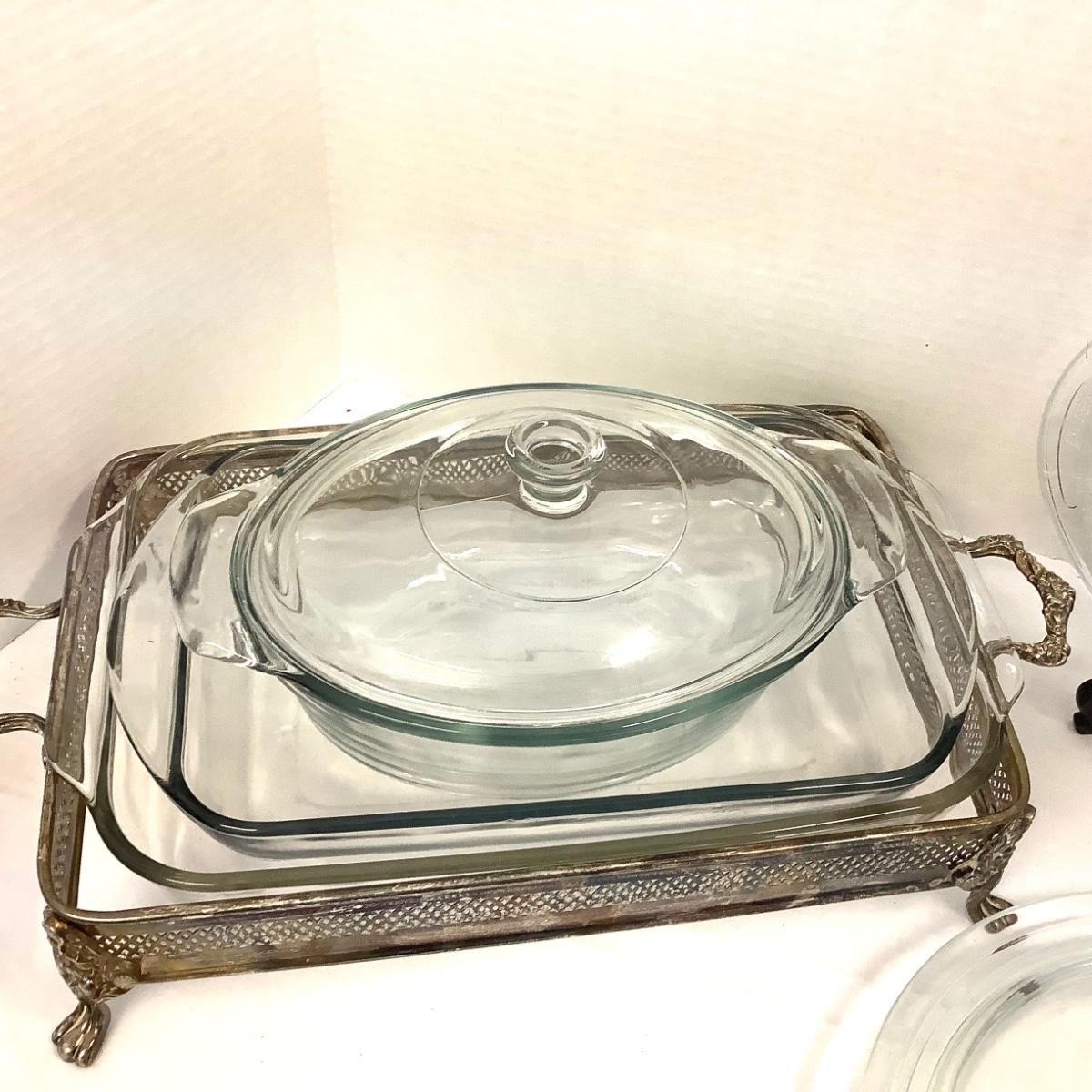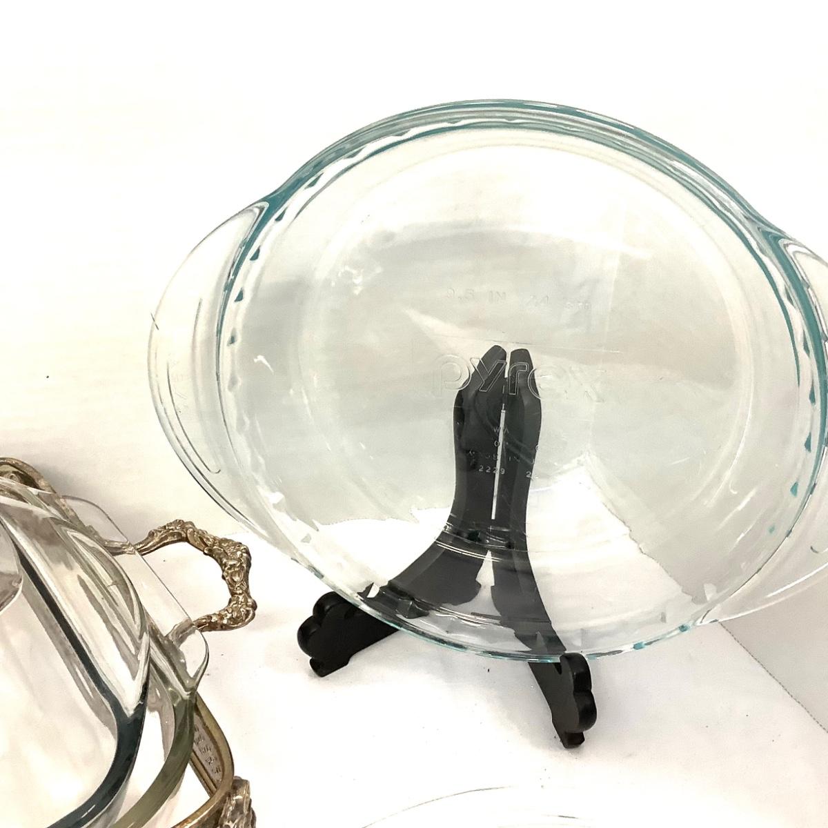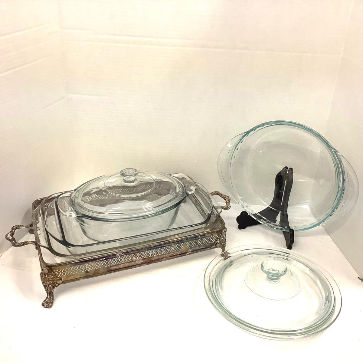 397 Pyrex Pie Dishes , Casserole Dishes, Covered Casserole , Silver Plate Holder