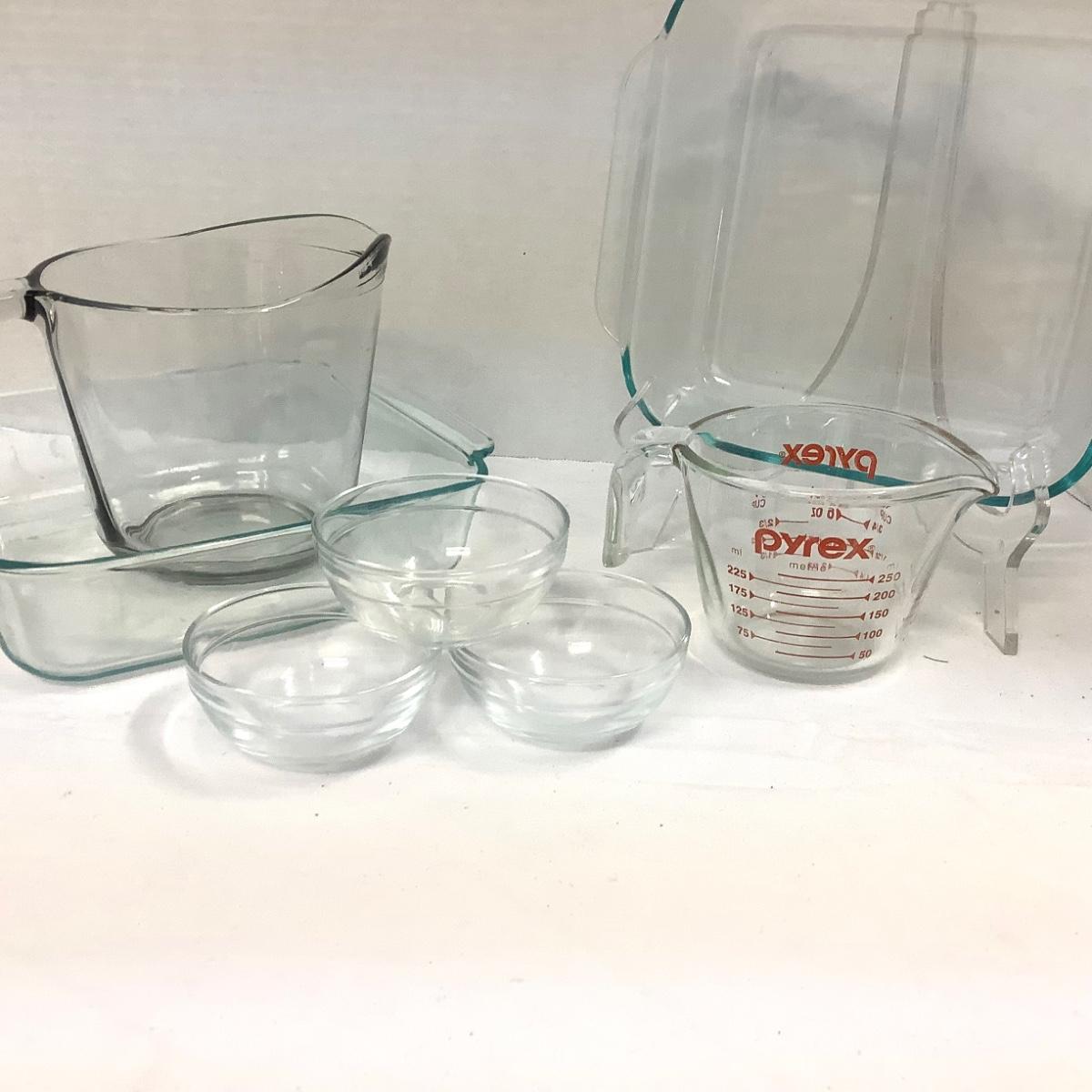 Set of 3 small round prep bowls, two 8"x 8" square baking dish and two measuring cups