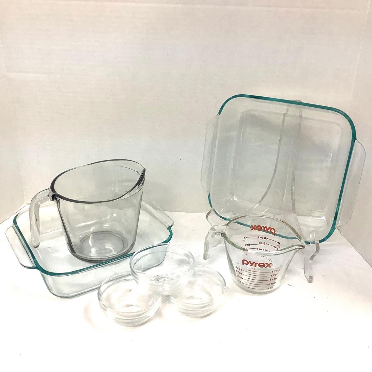 398 Lot of Square Pyrex Baking Dishes, and measuring cups