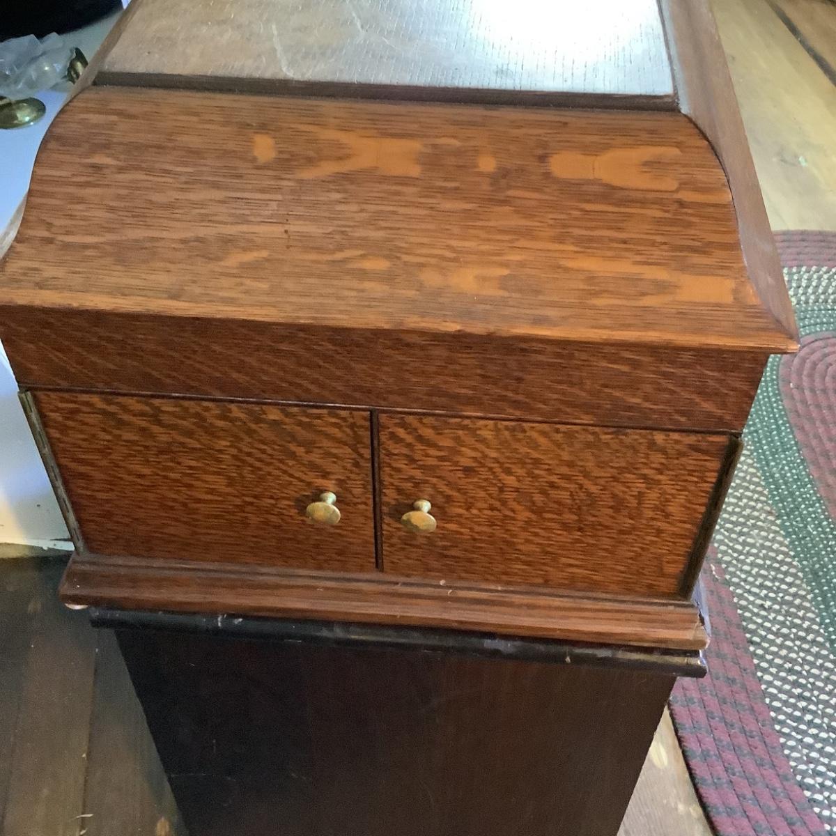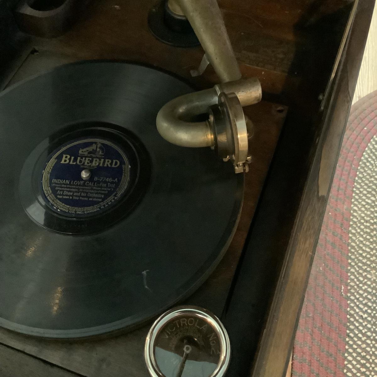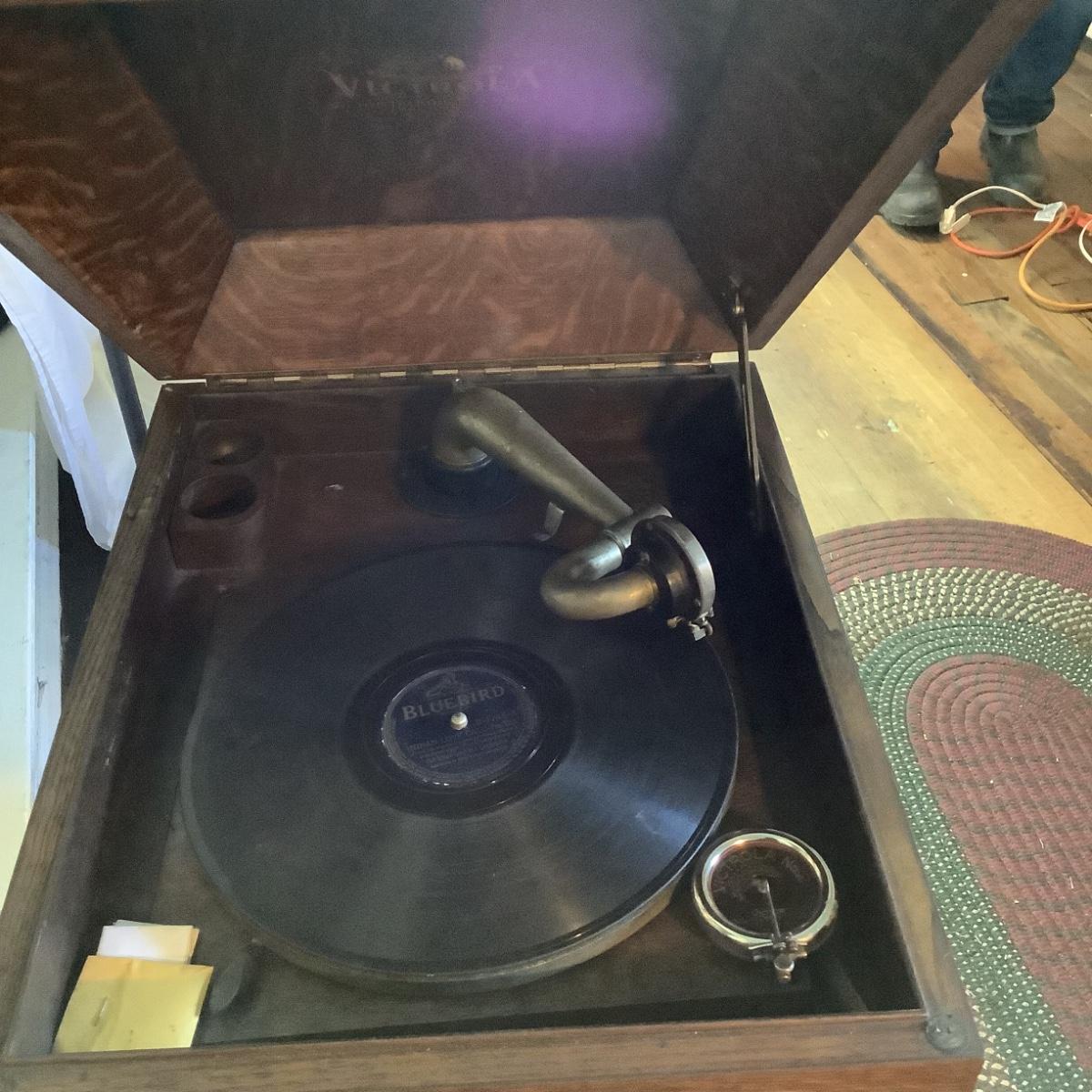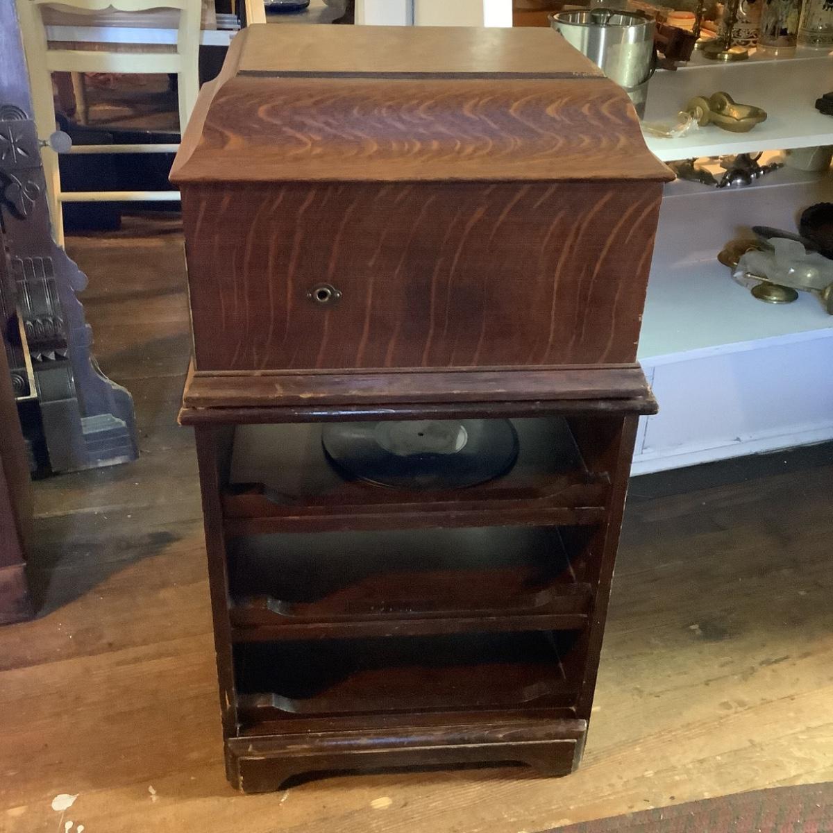 Missing the arm for cranking. Comes with few records and sheet music cabinet. Cabinet measures 19.5" wide x 14.5" deep x 22.5" high
