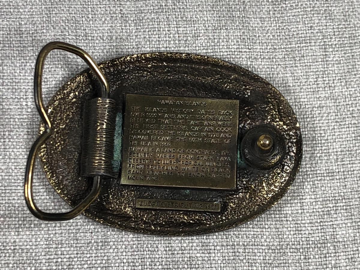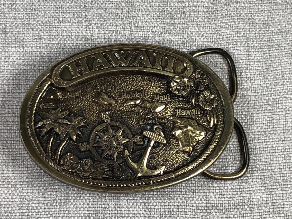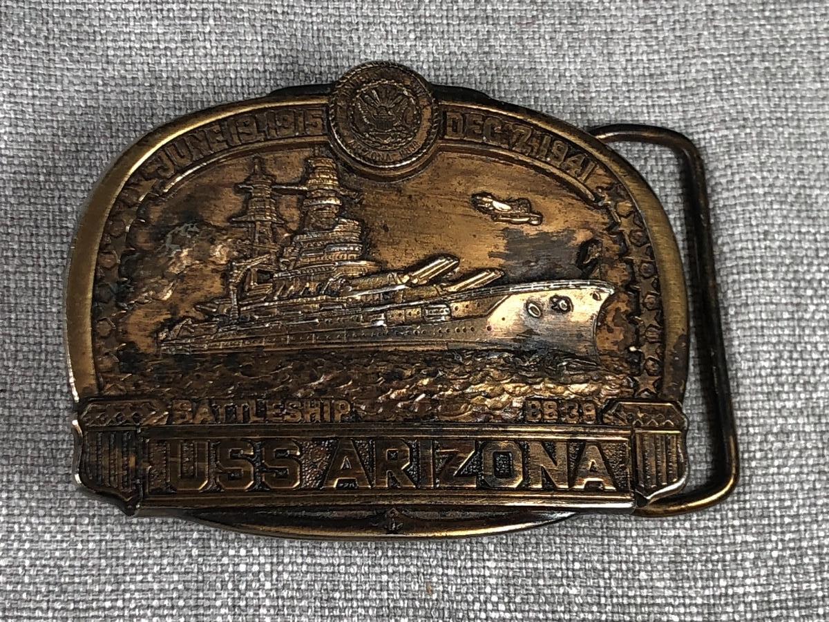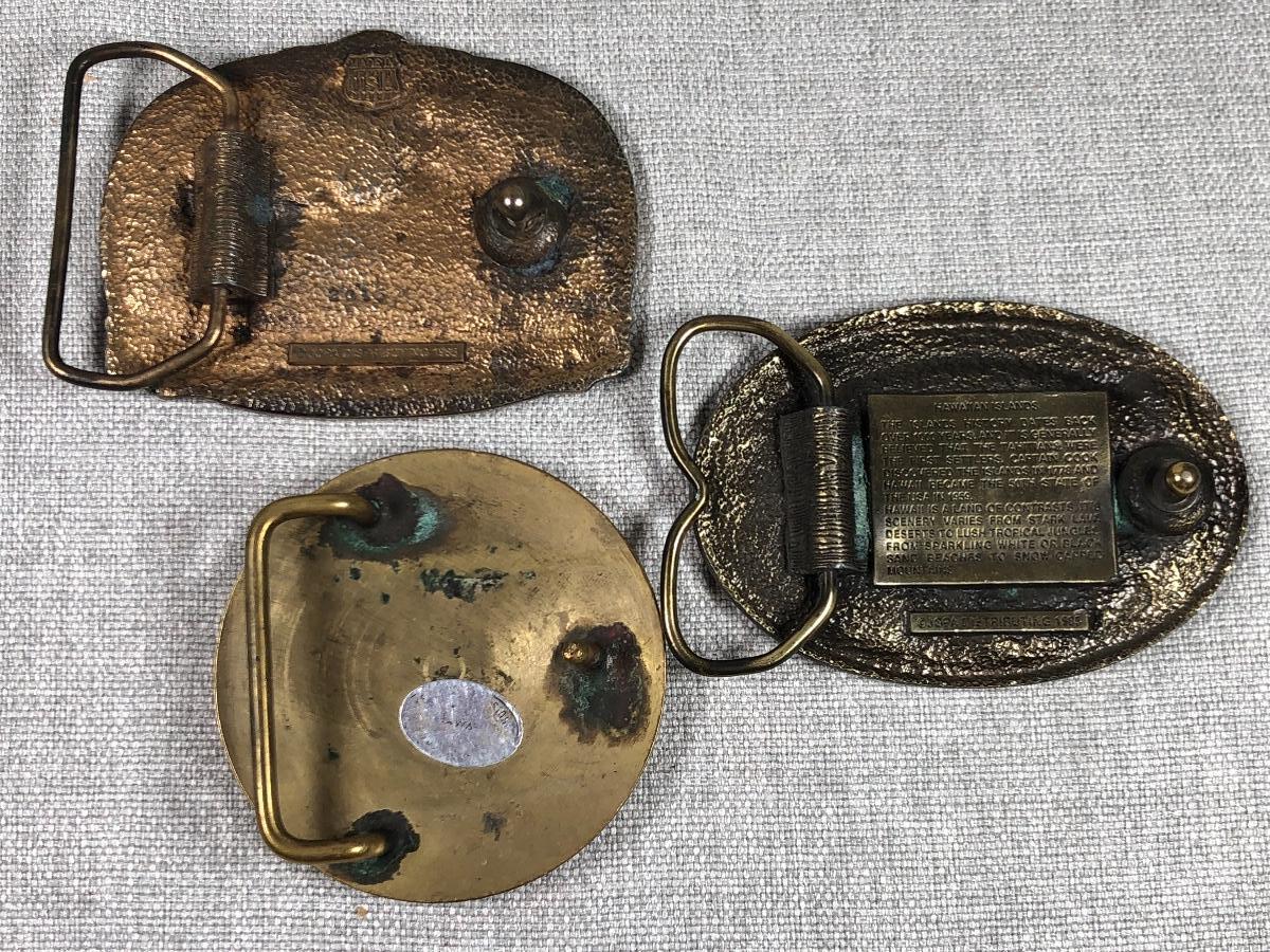 Set of 3 brass tone belt buckles. Coast Guard, USS Arizona and Hawaii themed buckles. Good vintage condition