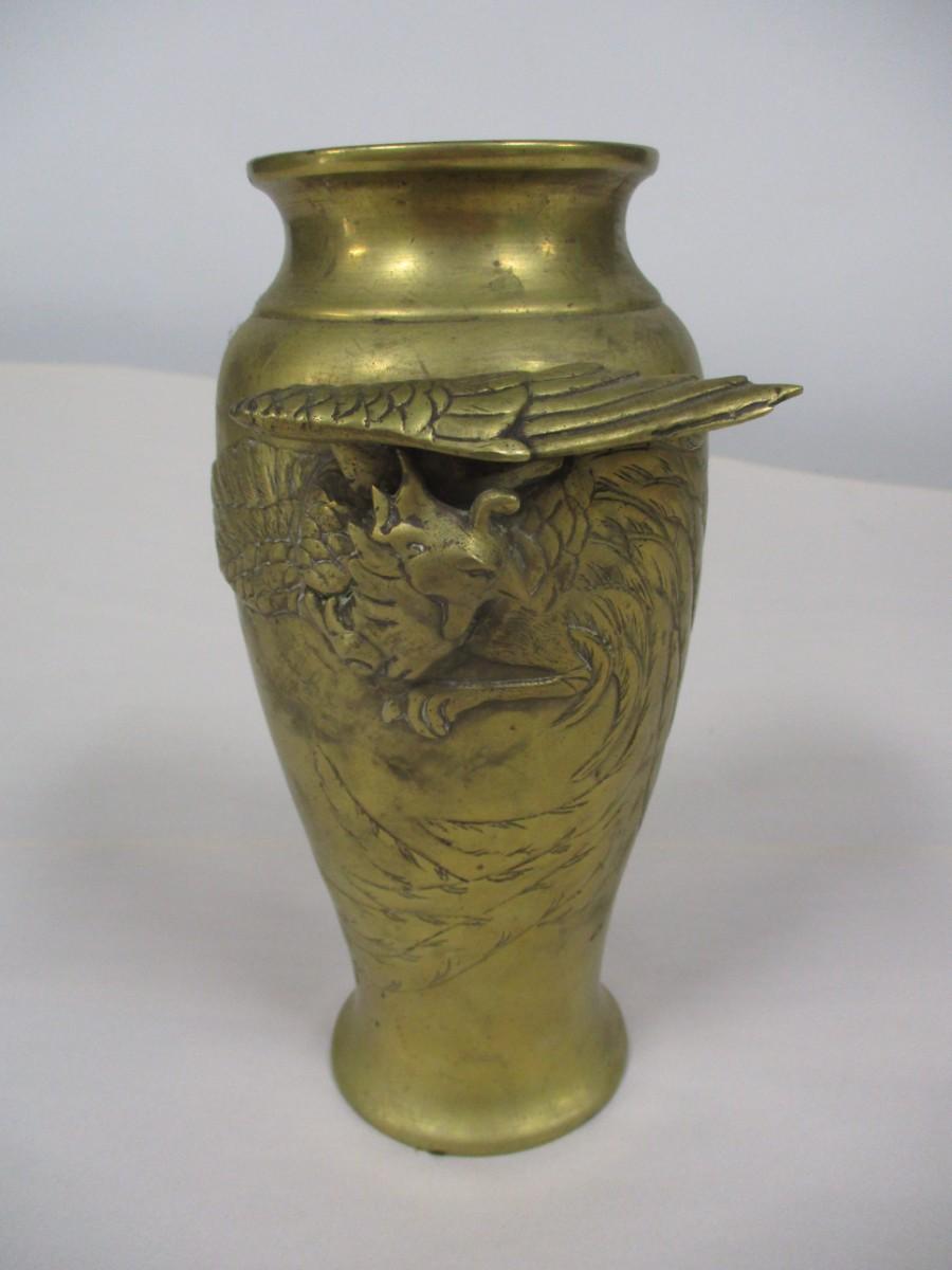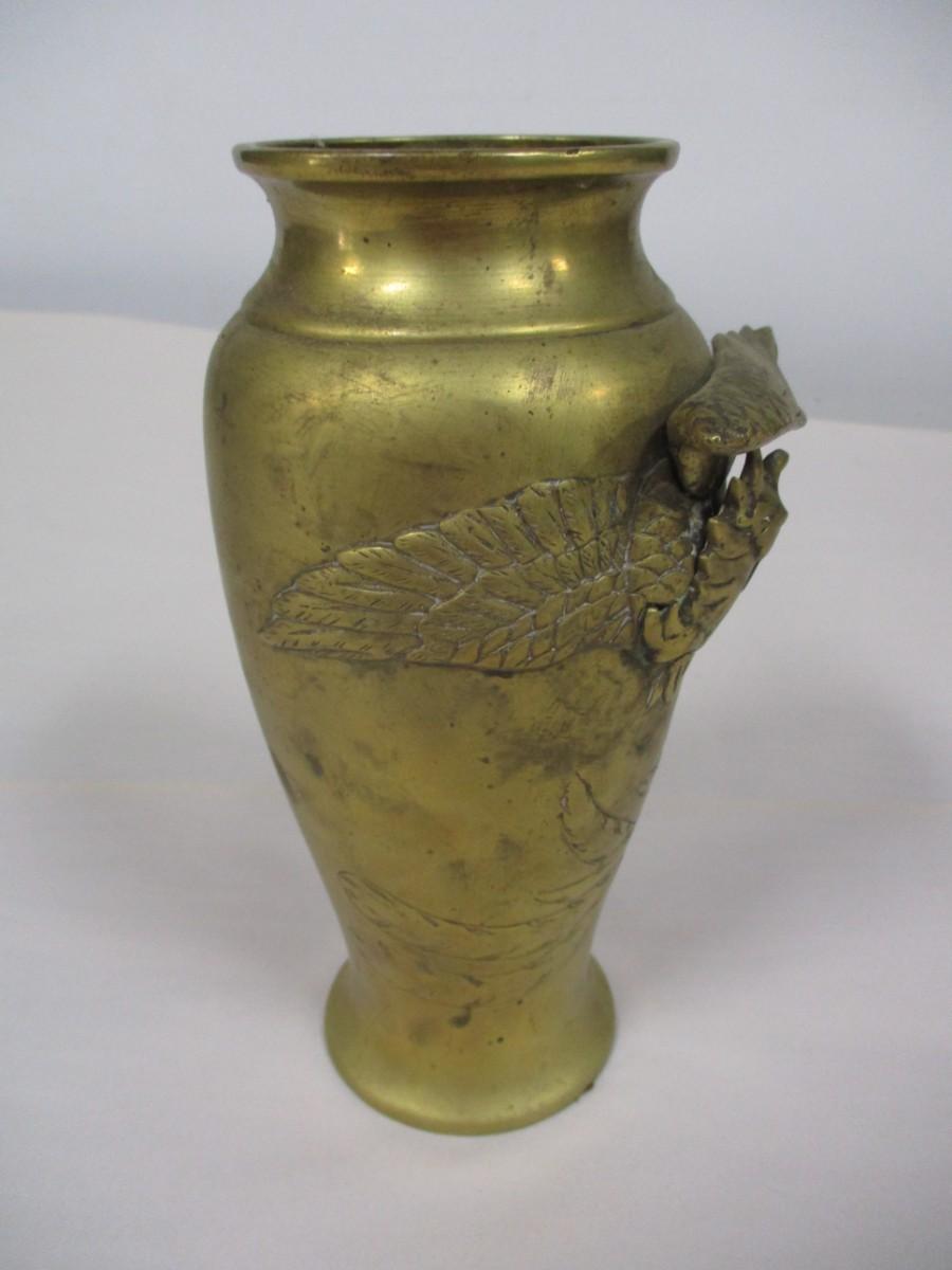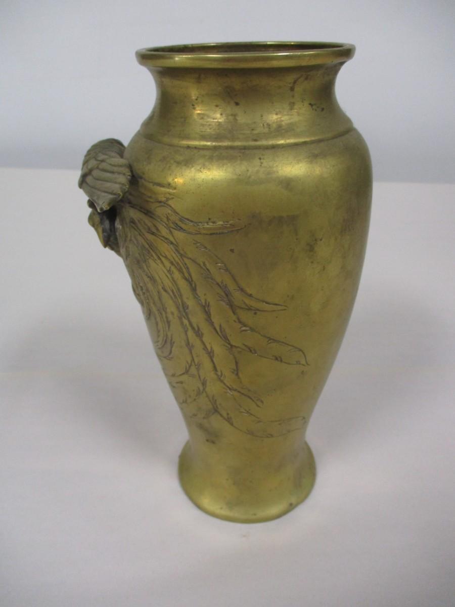 Antique Three-Dimensional Brass Vase with Japanese Fighting Rooster