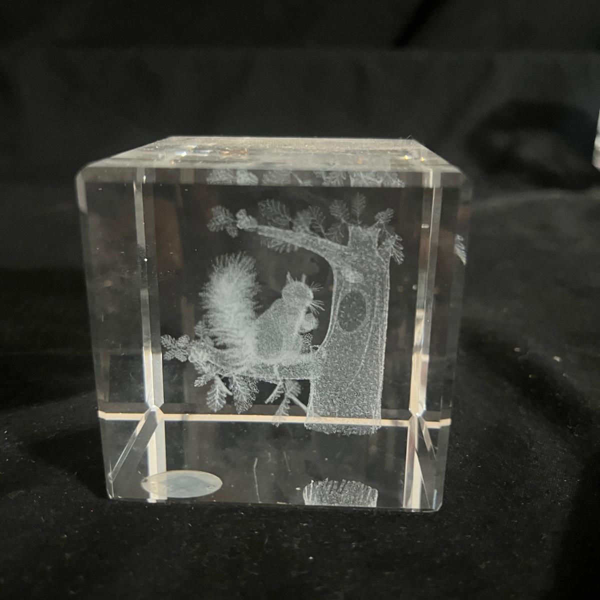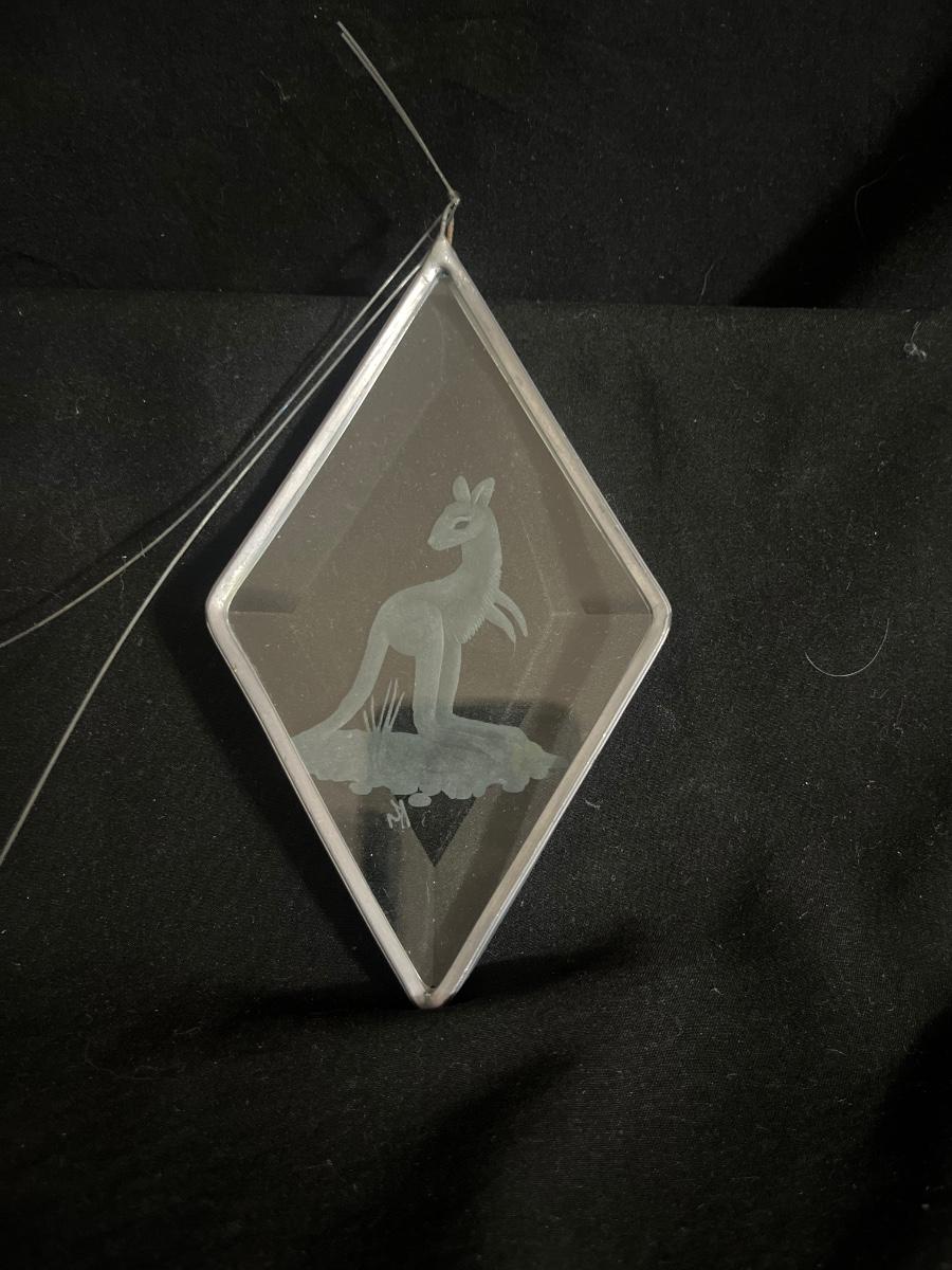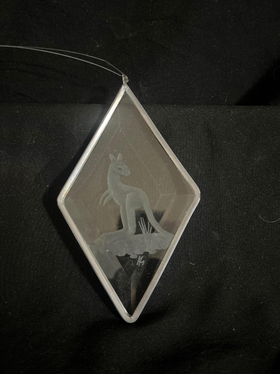 Lot includes a 3D etched glass hummingbird, squirrel, glass bird and a glass diamond shaped hanging ornament with metal edge with a kangaroo etched in the glass. Largest piece measures 2.5” x 2.5” x 4”H.
