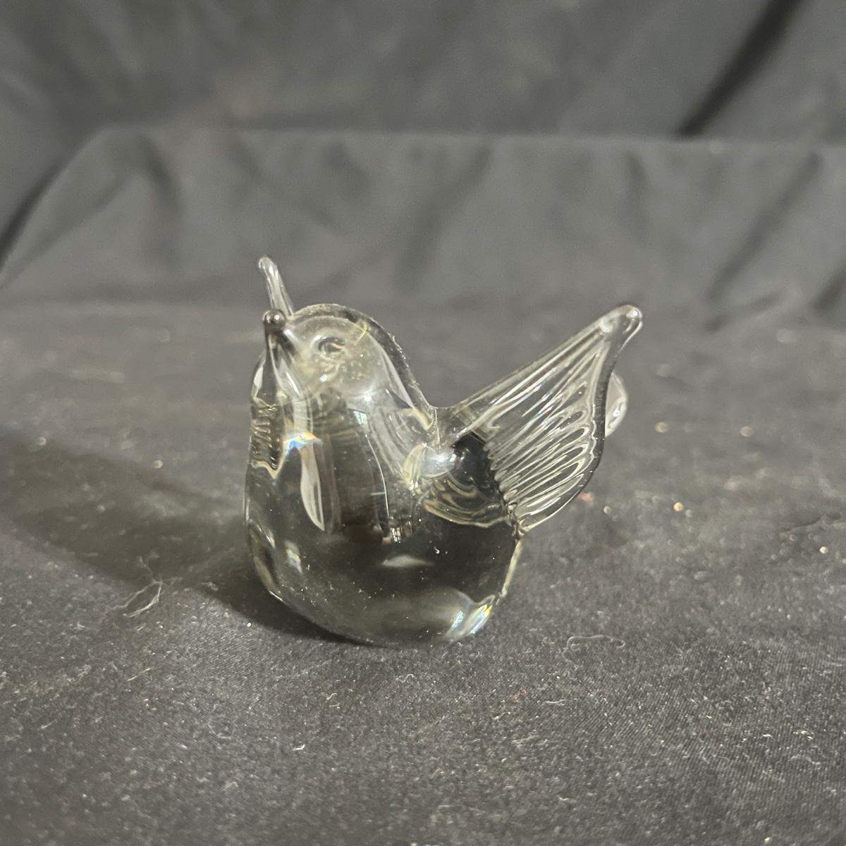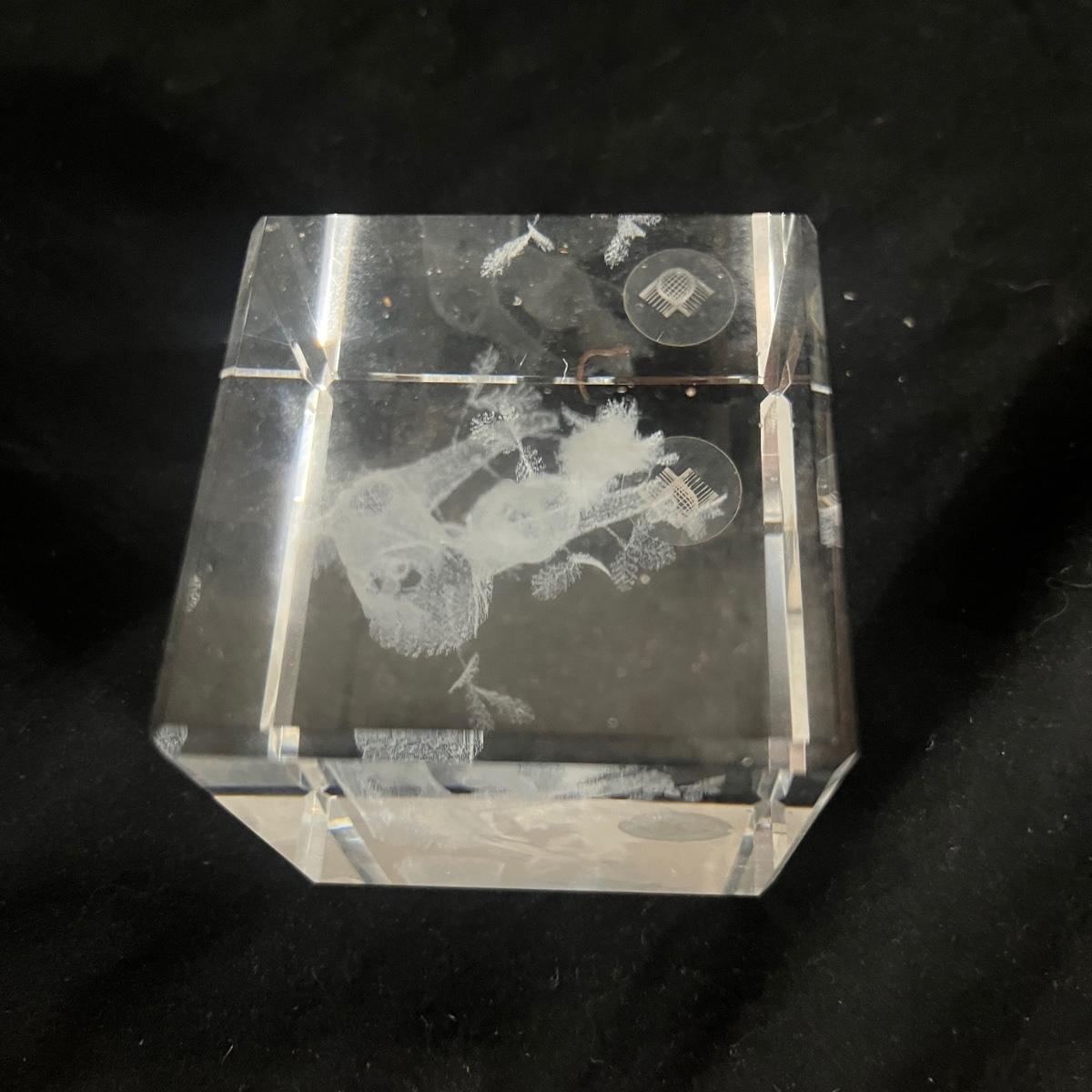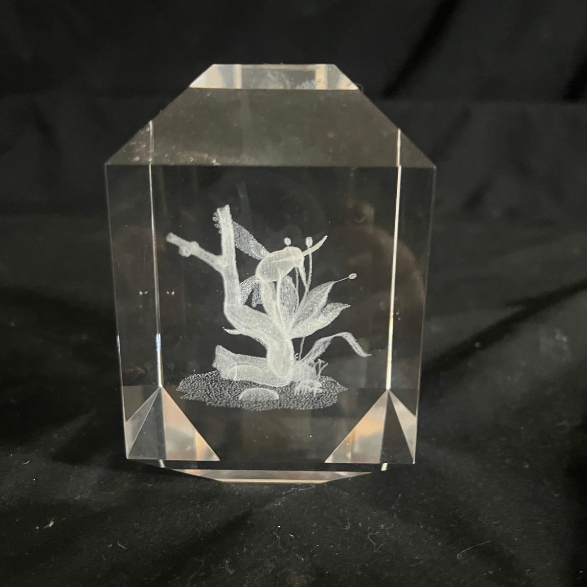 Lot includes a 3D etched glass hummingbird, squirrel, glass bird and a glass diamond shaped hanging ornament with metal edge with a kangaroo etched in the glass. Largest piece measures 2.5” x 2.5” x 4”H.
