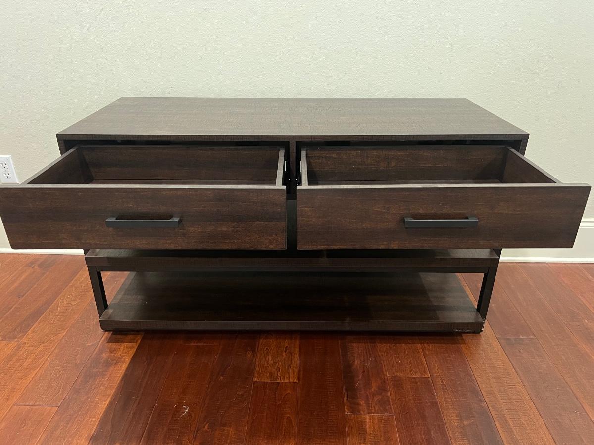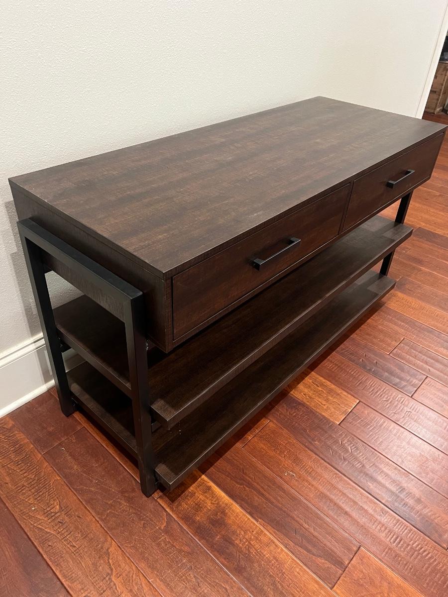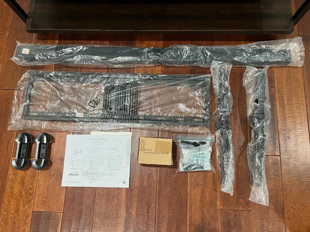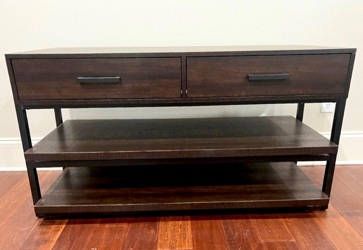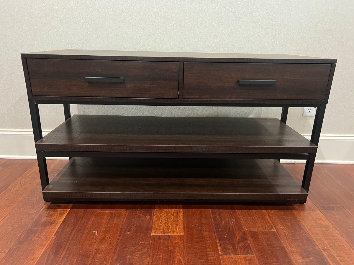Nice solid/heavy TV stand. Great condition. Comes with all brackets and parts to use the tv stand any of the 3 options it shows on the instructions(see pictures). 48”W x 18.5”D x 26”T
