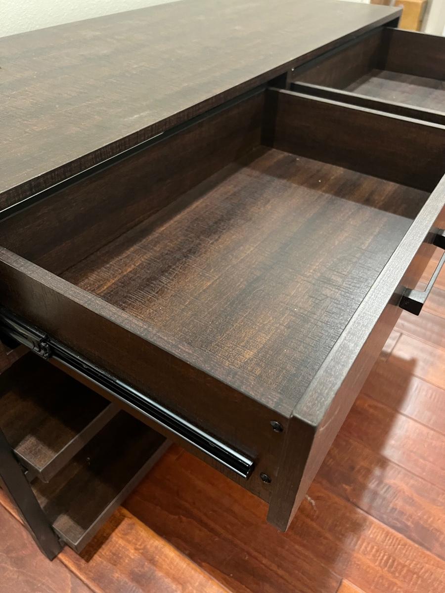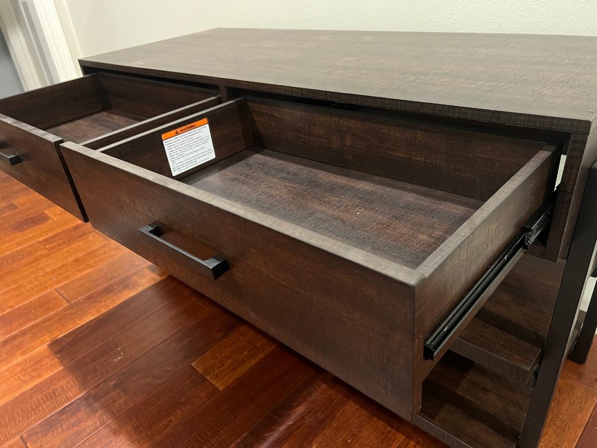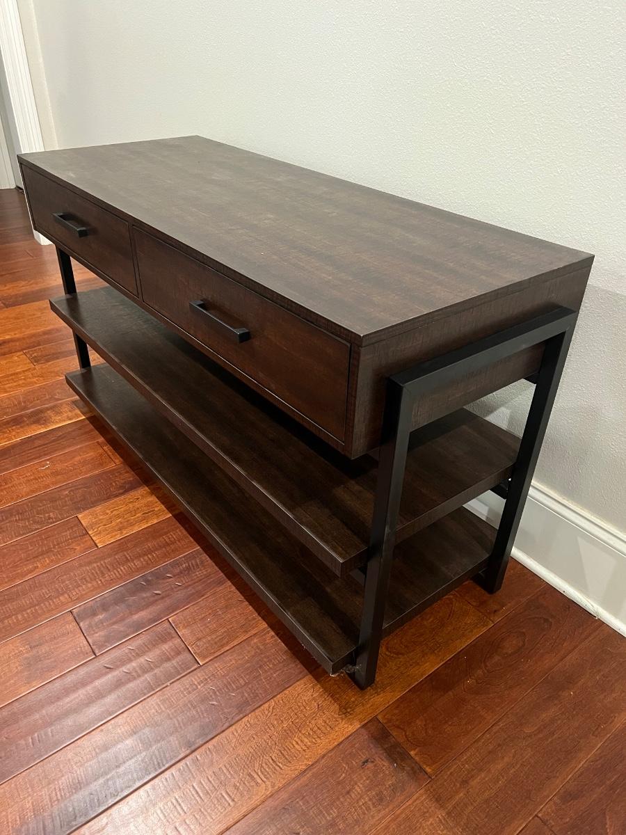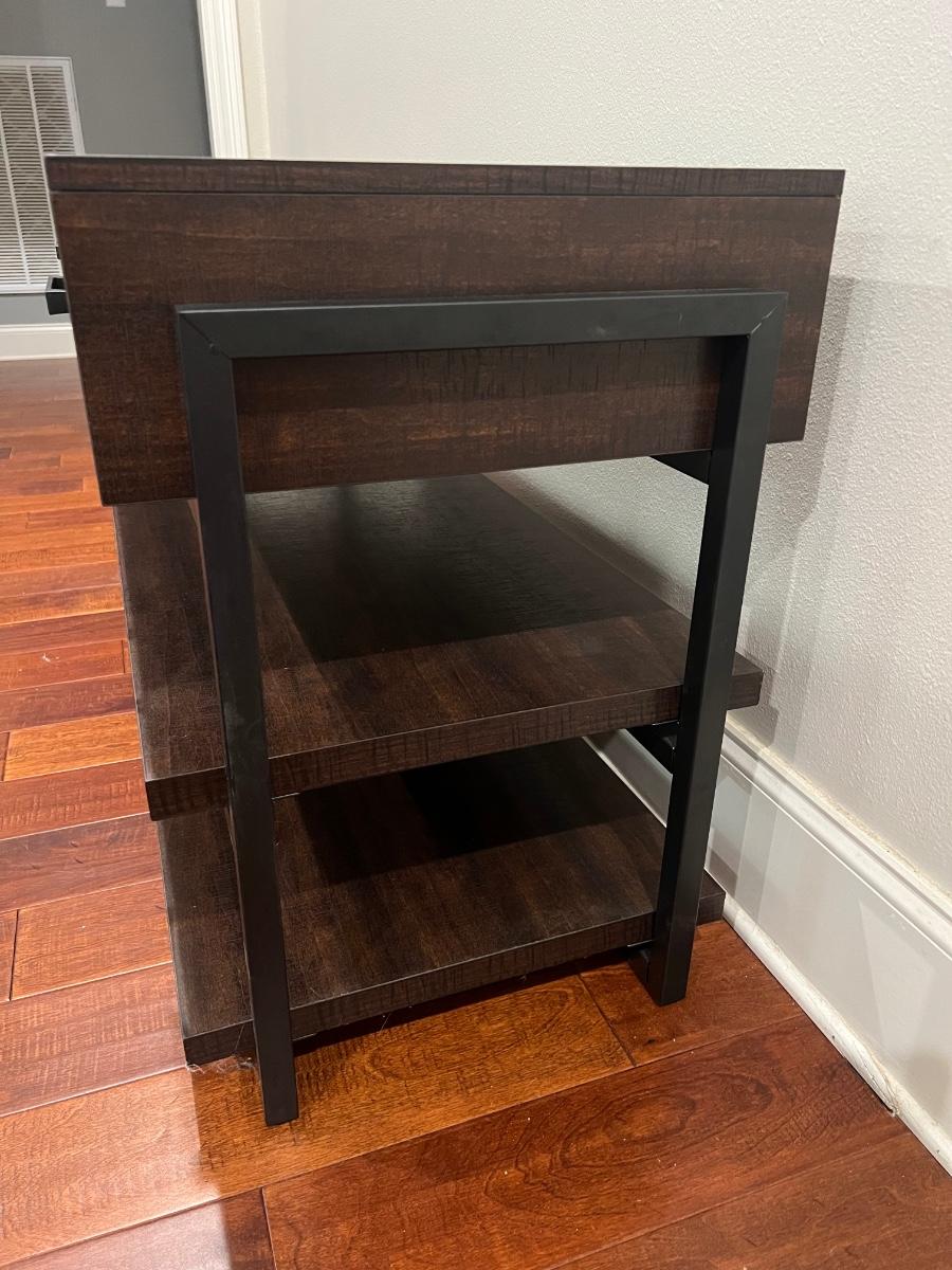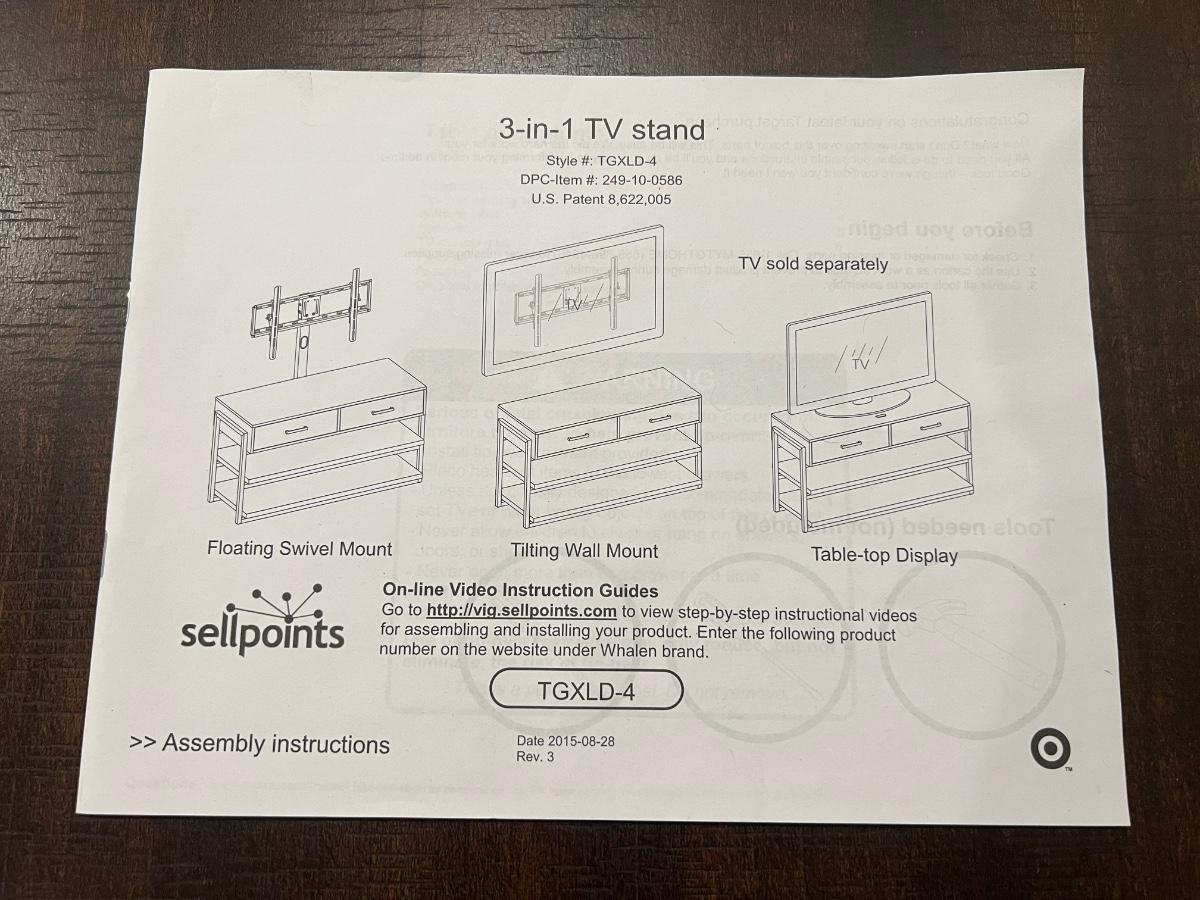 Nice solid/heavy TV stand. Great condition. Comes with all brackets and parts to use the tv stand any of the 3 options it shows on the instructions(see pictures). 48”W x 18.5”D x 26”T