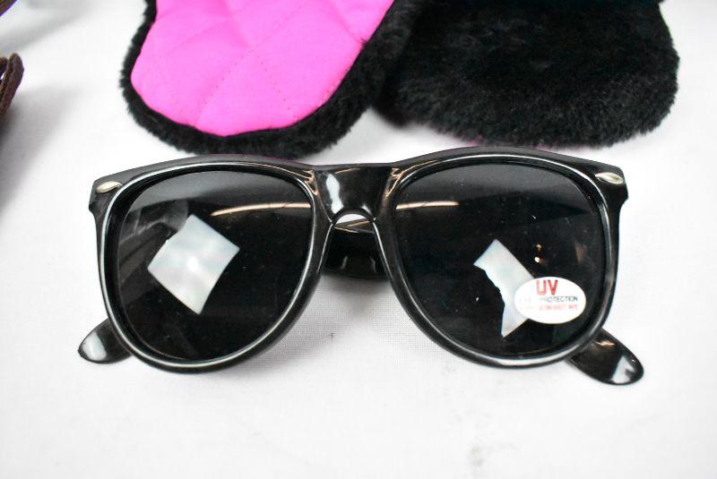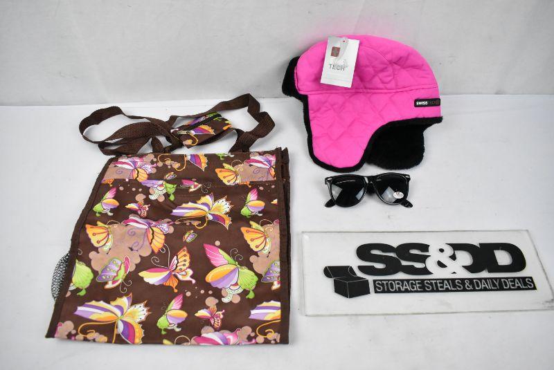 3 pc Apparel: Butterfly Tote Bag, Black & Pink Winter Hat, Black Sunglasses - New