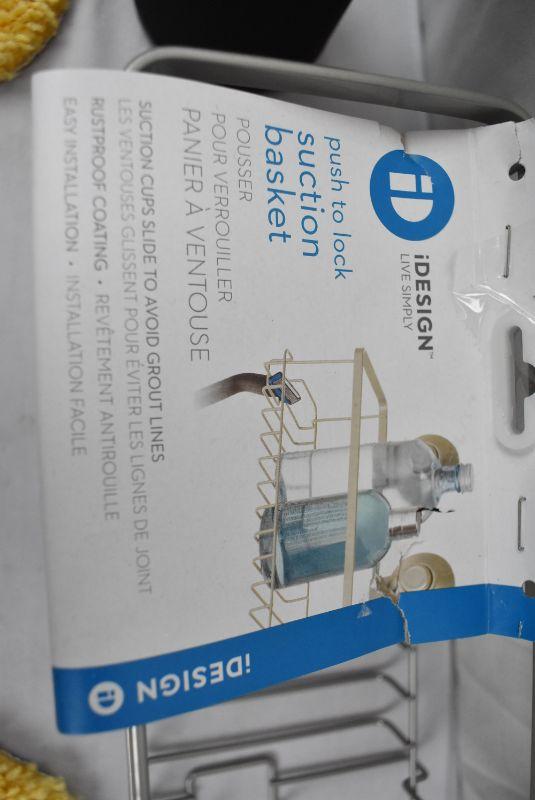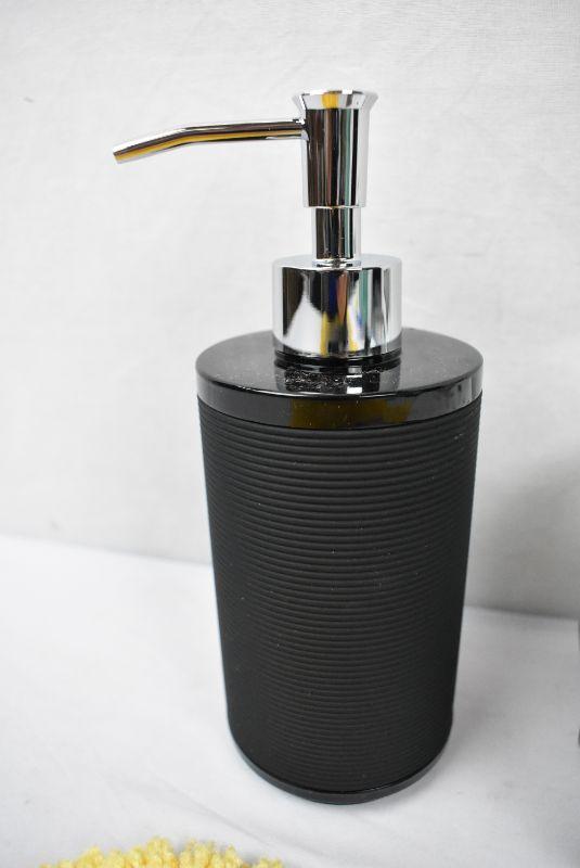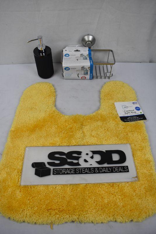 3 pc Bathroom Accessories: Black Lotion Pump, Suction Basket, Yellow Contour Rug - New