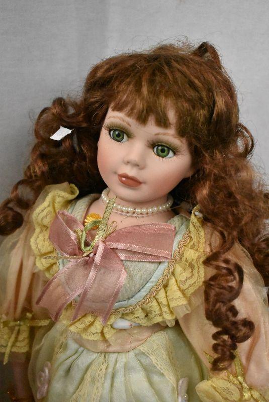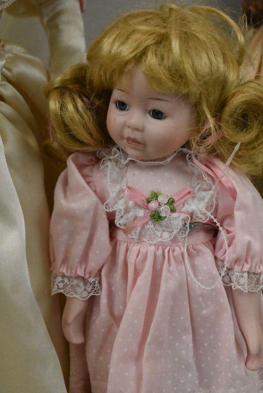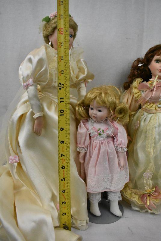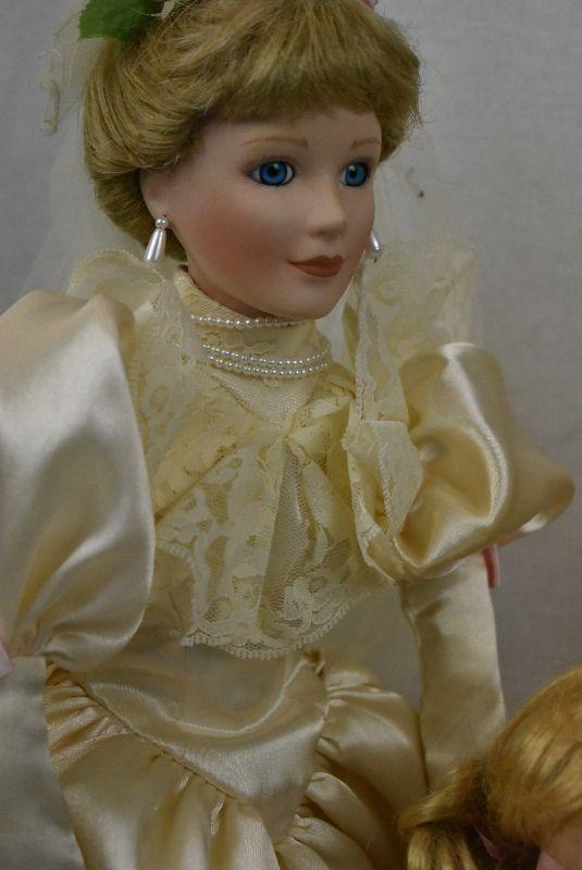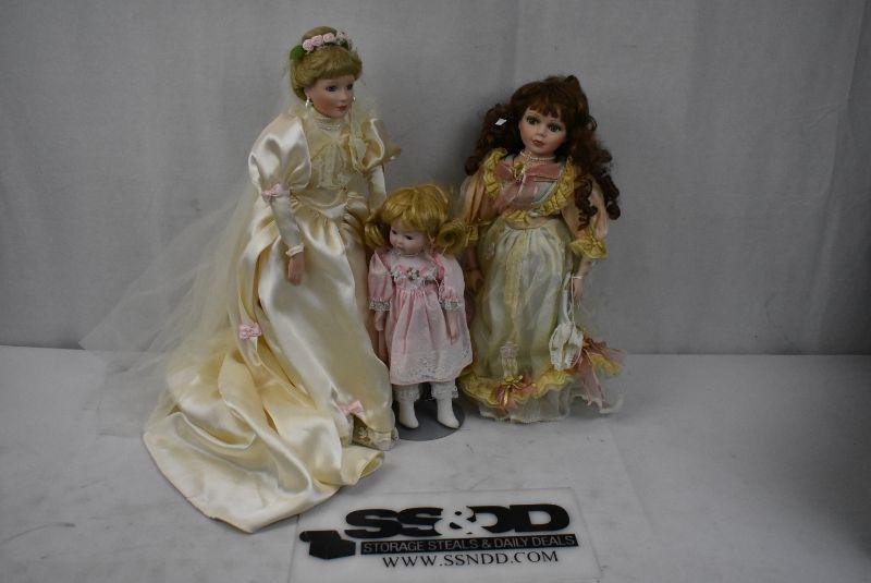 3pc Dolls - Bride, Emerald, Baby w/ Stands - New Old Stock