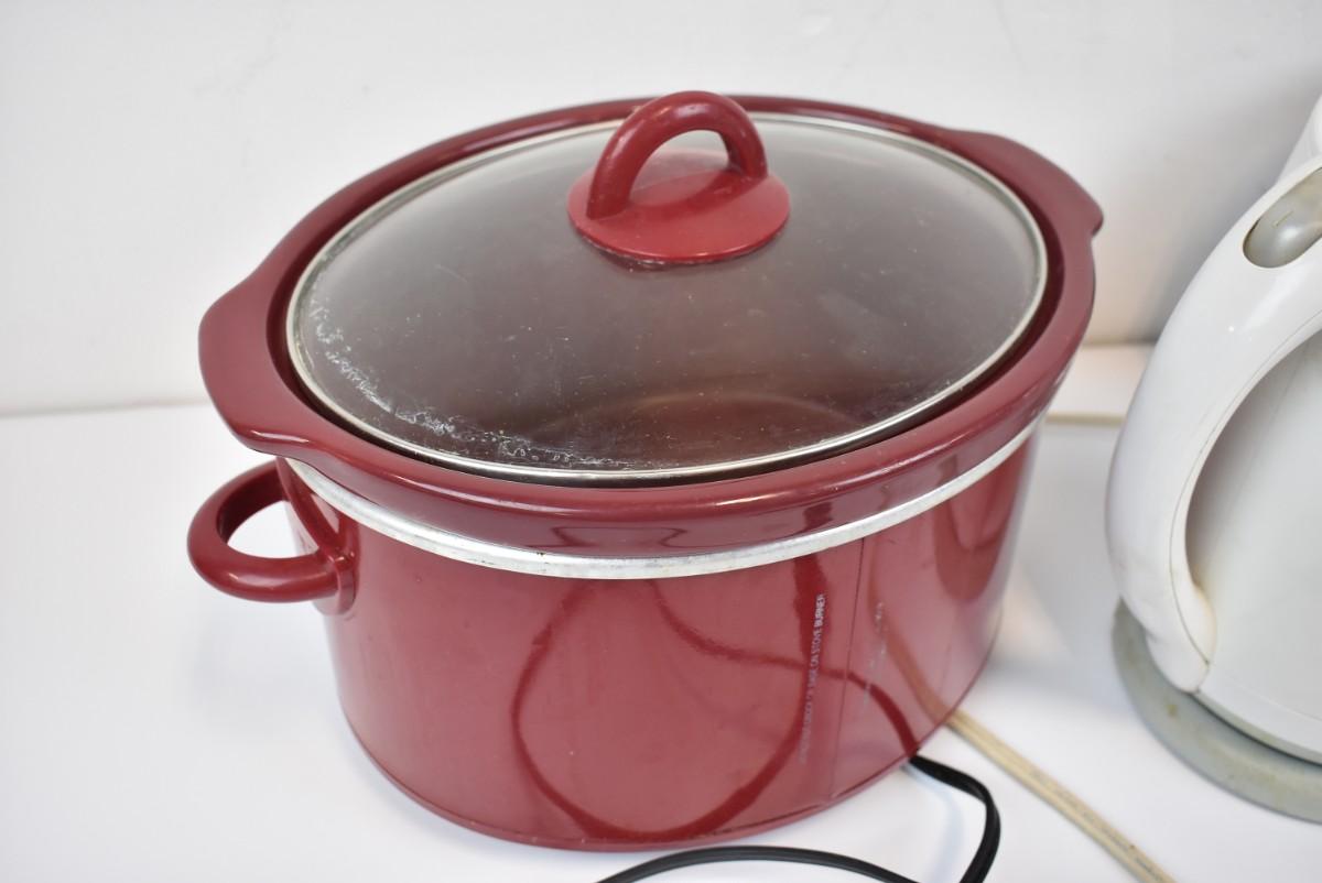3pc Kitchen: Mini Deep Fryer, Electric Kettle, Red Crockpot
