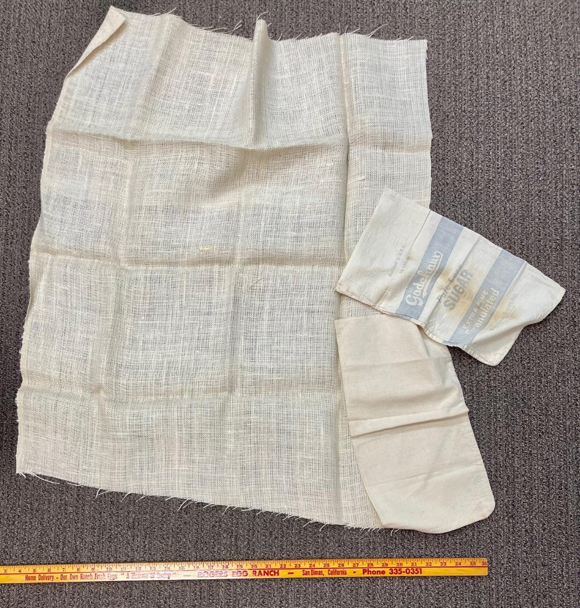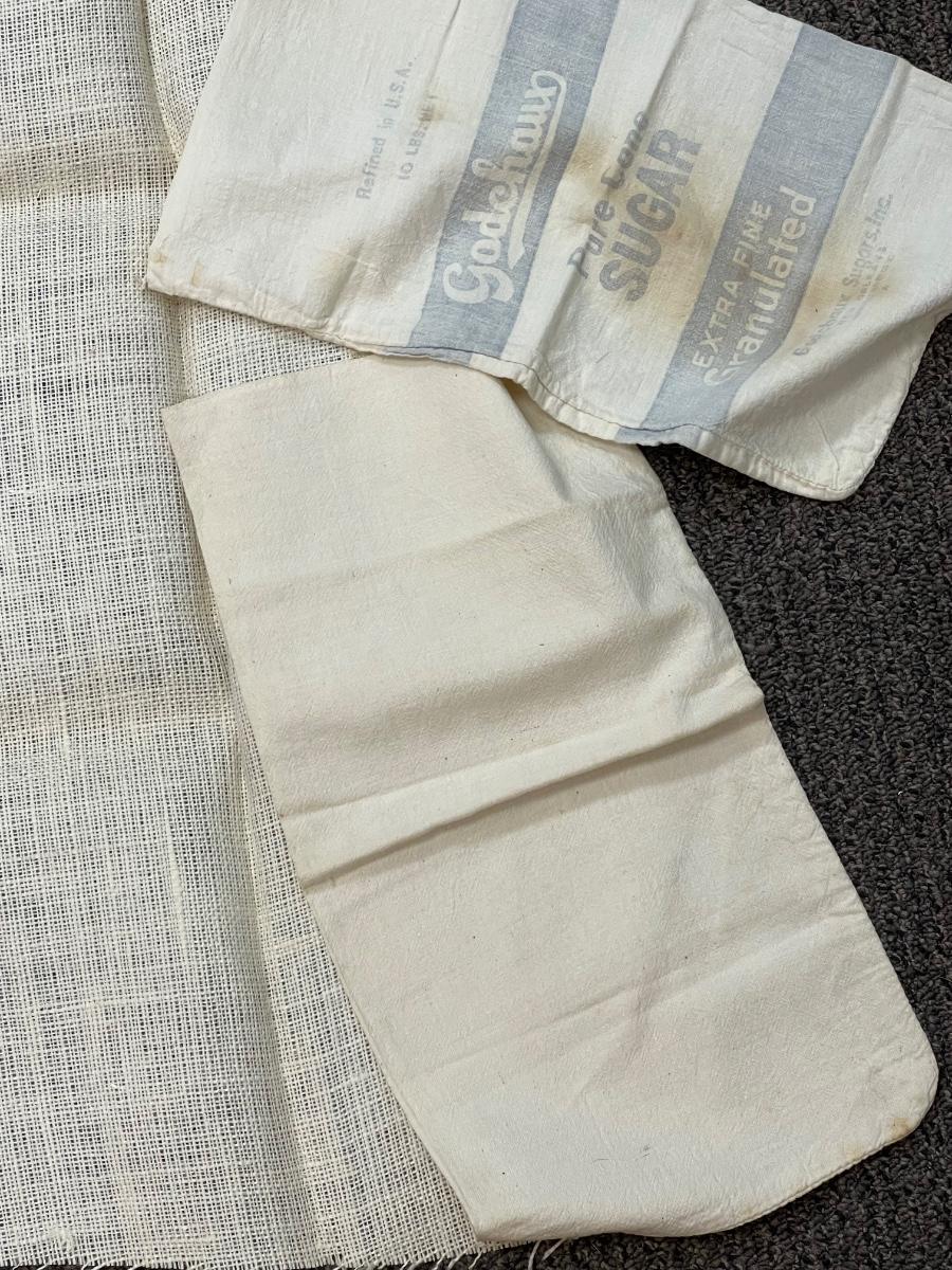 3pc lot- burlap fabric remnant and two flour sac fabric dry goods bags