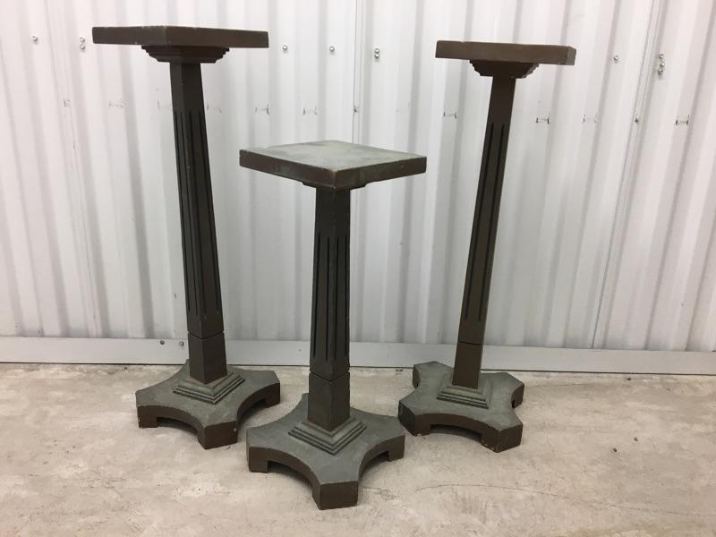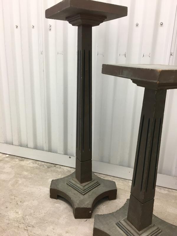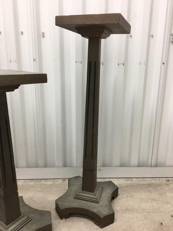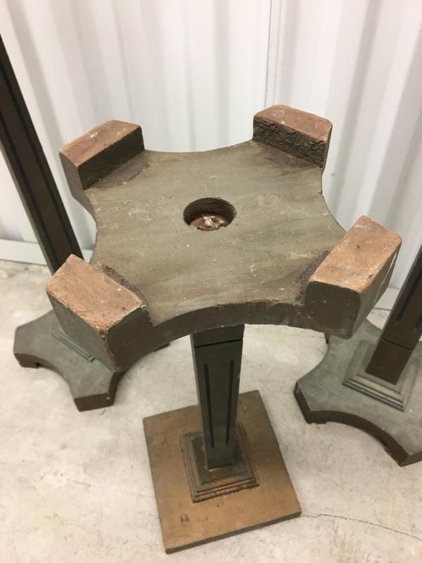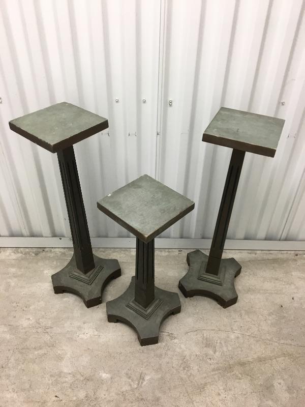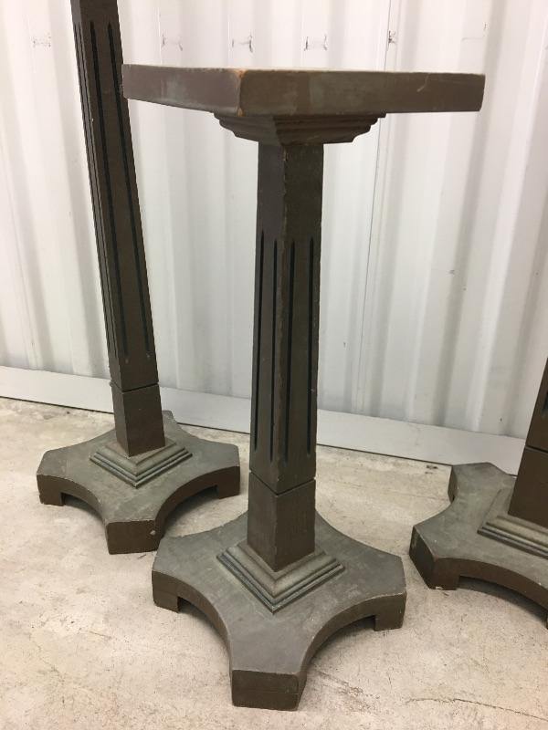 Includes three wooden pedestal stands. Vintage olive paint. Good overall condition. The two taller ones measure 25”h. The shorter one measures 18”h. The square platforms on top measure 7”x7”.