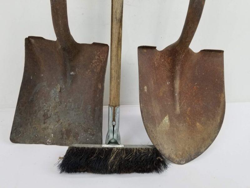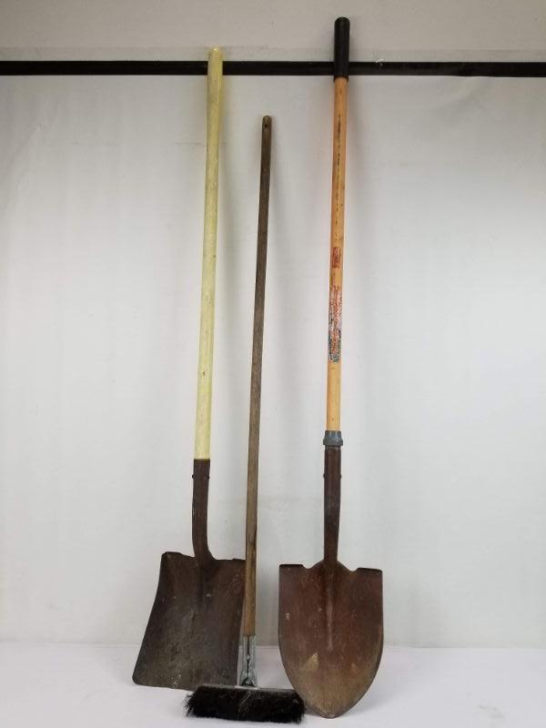 3pc Yard Tools Lot: Spade, Flat Nose Shovel, Small Push Brush/Broom