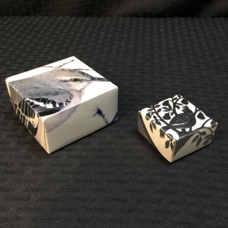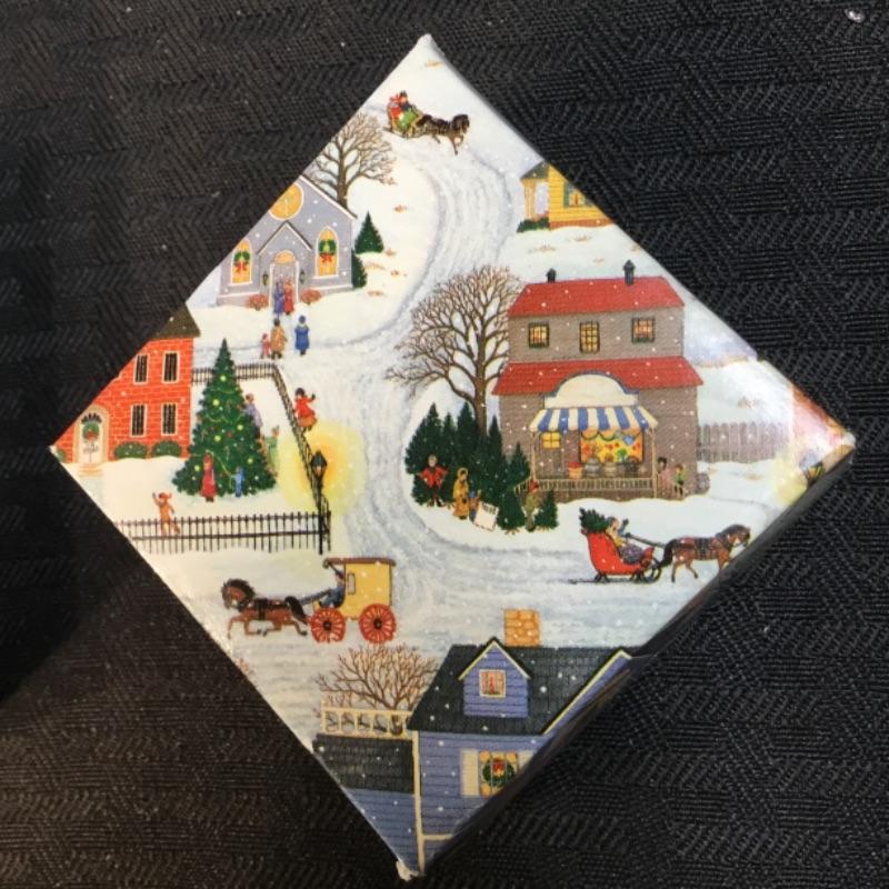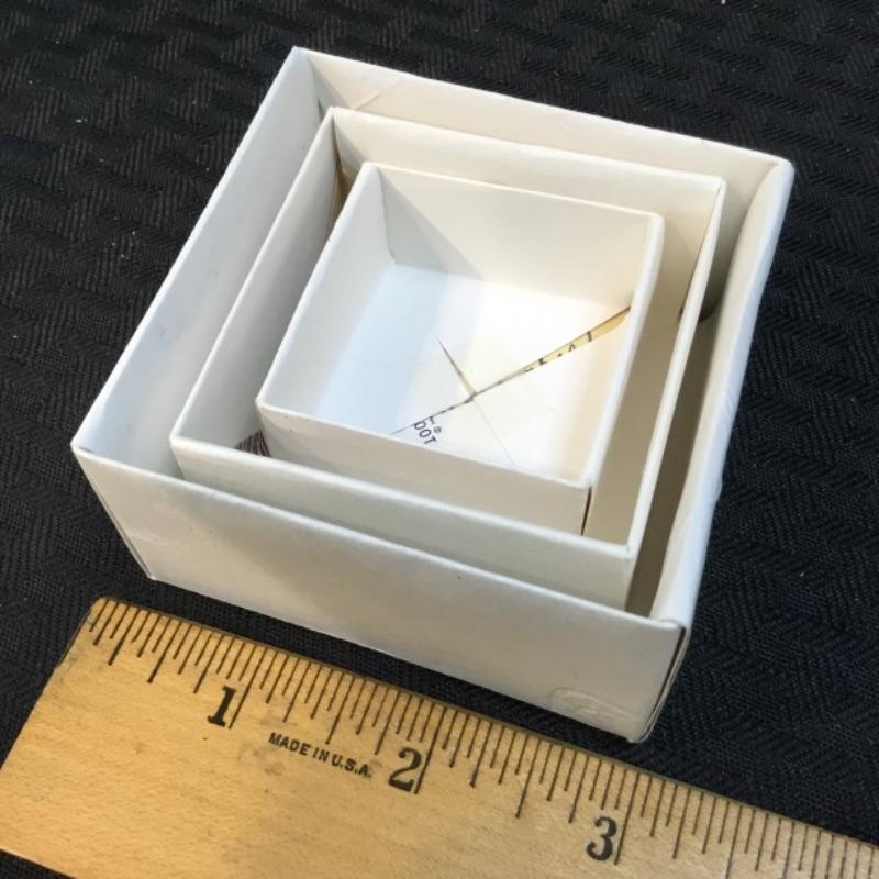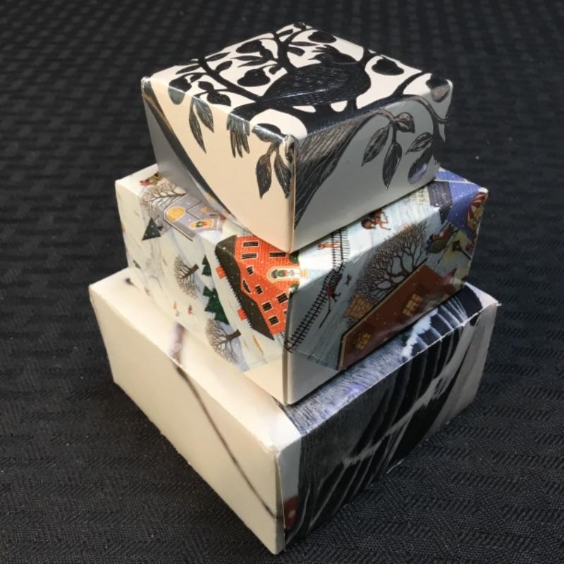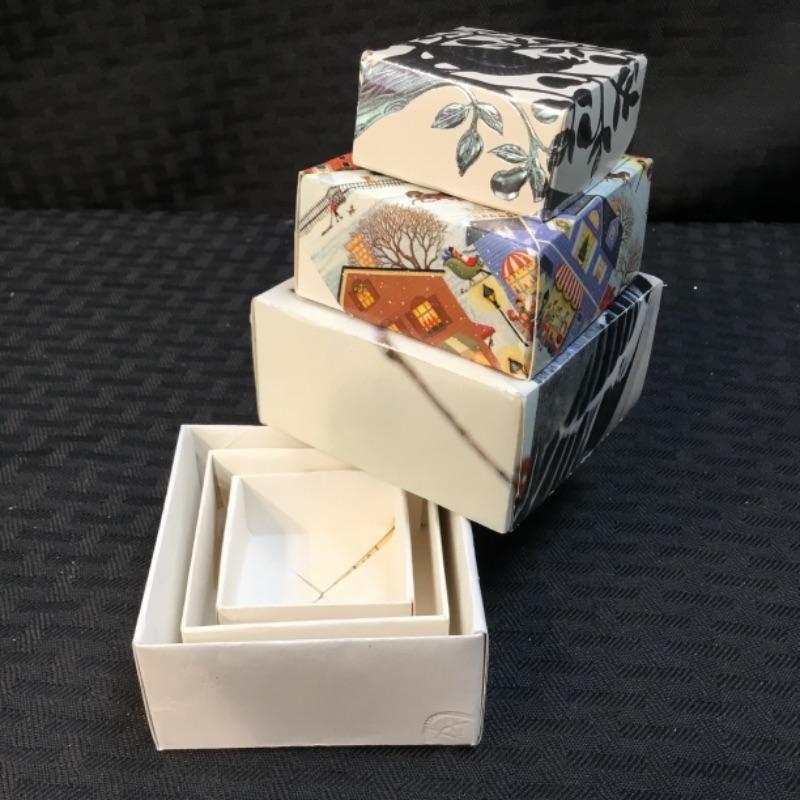 A small 3-piece gift box set. The smaller primary & secondary boxes allocate into the tertiary, largest-sized box. All boxes include lids. Each box is printed with a festive holiday inspired theme. The last picture is the smallest box next to the largest box. See pictures.