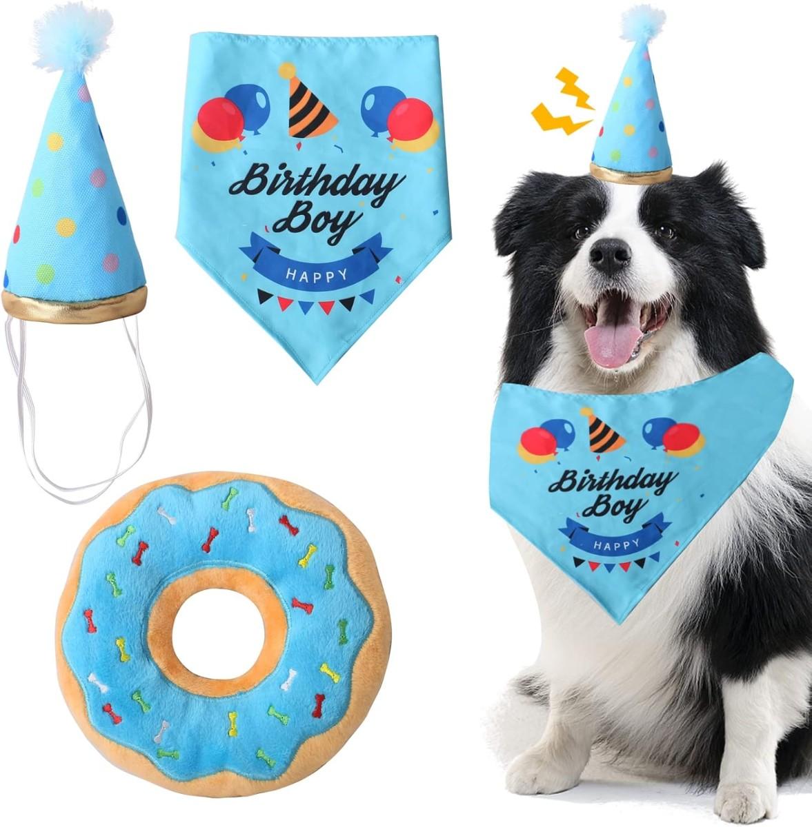 3-Piece Dog Birthday Party Supplies, Dog First Birthday Bandana, Squeaky Dog Birthday Hat, Cute Puppy Toy Donut