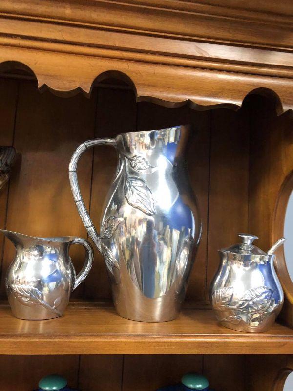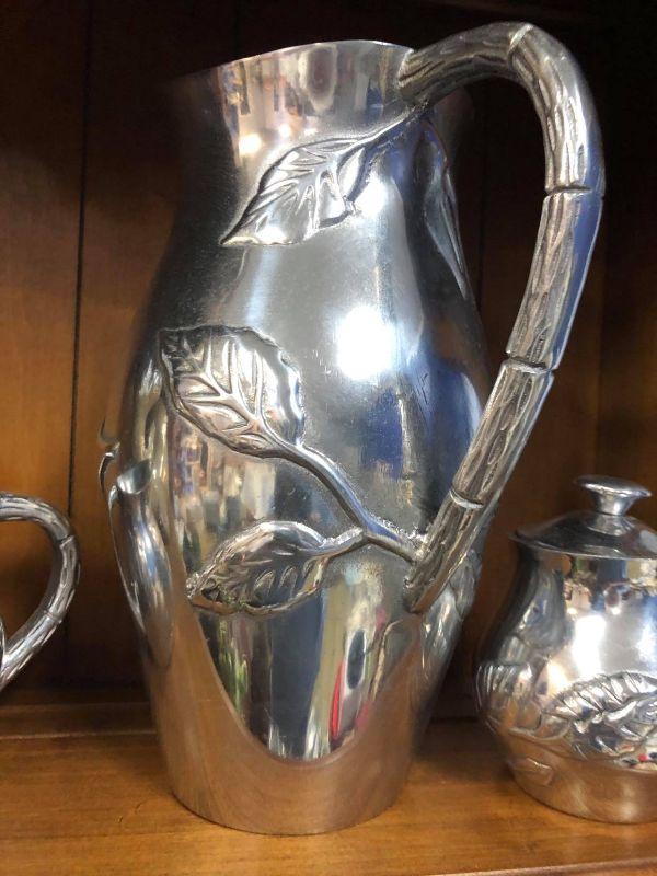 NEW 3-piece set, Polished Cast Aluminum Charter Club 10" tall Pitcher Eden Grove Floral pattern NEW. Also, matching cream and sugar. Polished on the outside. Branch and leaf design. All NEW.