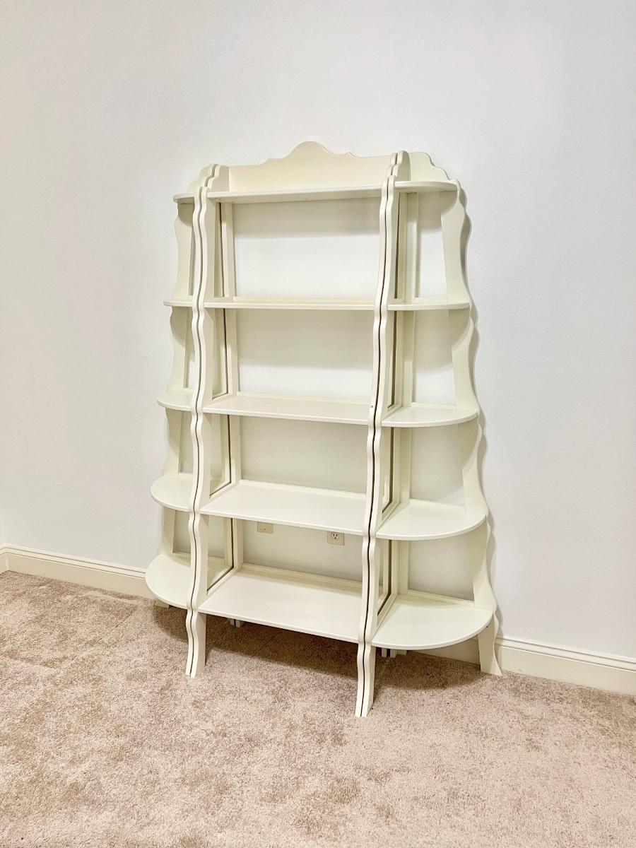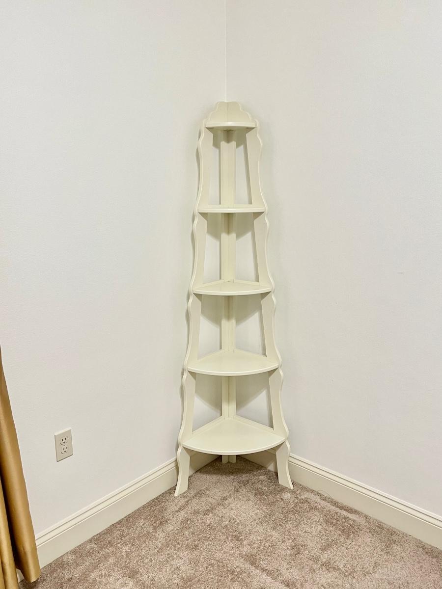 Side pieces can be used in corners, see photos ~ No name brand found ~ Middle piece = 72” H x 25” W x 16” D ~ Top shelf = 6” D ~ Bottom shelf = 14” D ~ Both side pieces = 70” H x 23” W x 13.5” D ~ Top shelves = 6” D ~ Bottom shelves = 13” D
