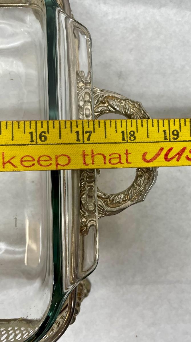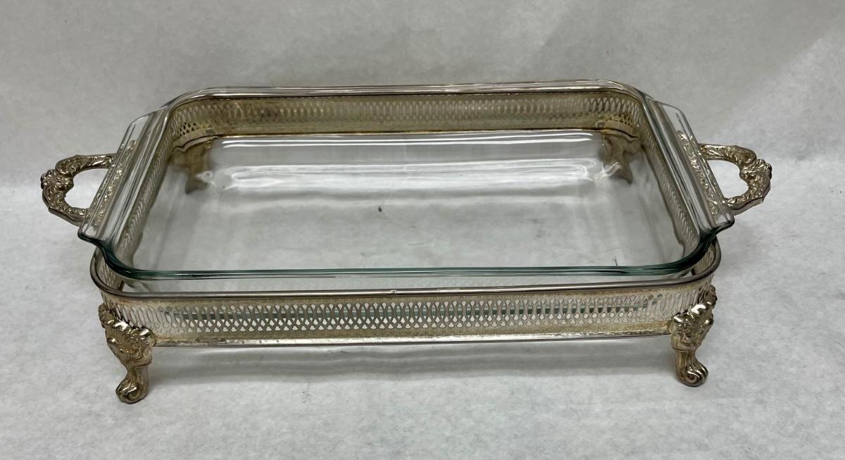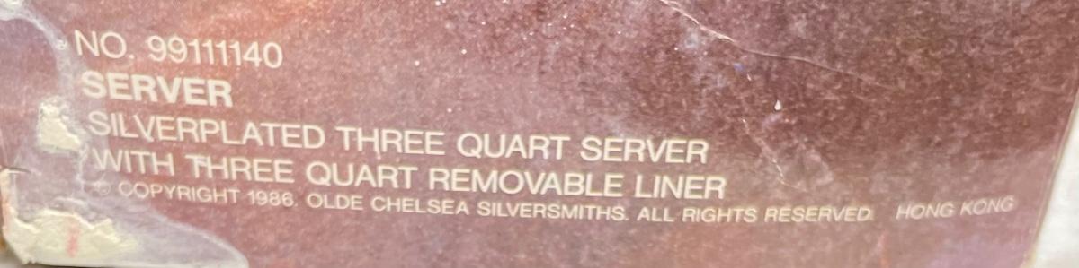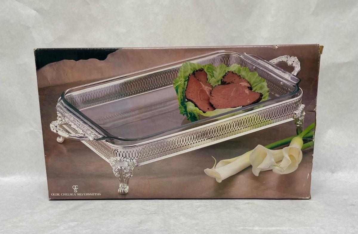 Olde Chelsea Silversmiths 3-quart serving dish with removable glass liner pan. Good condition, approx. 19" x 10".