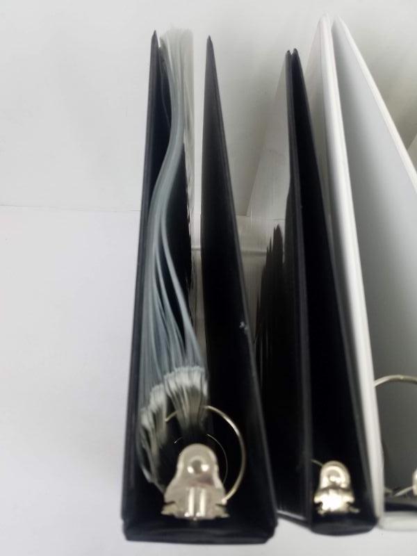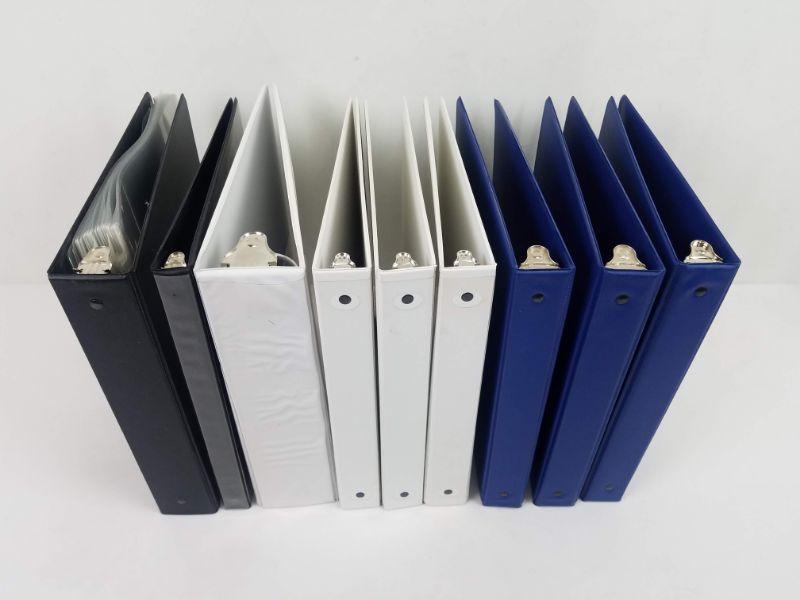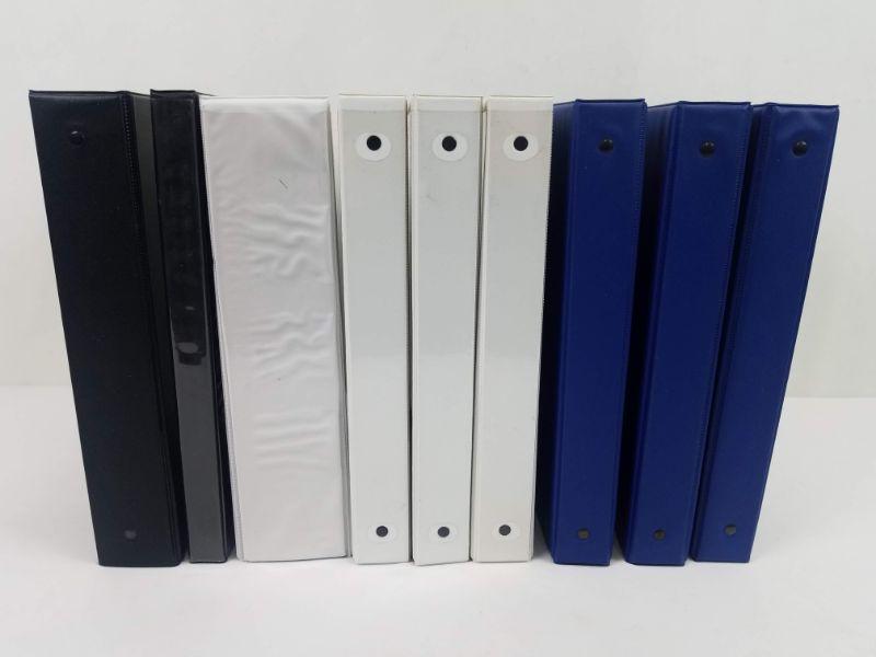 3-Ring Binders, Qty 9: 3 Blue 1.5", 3 White 1.5", White 2.5" Black 1" Black 2" & Page Protectors