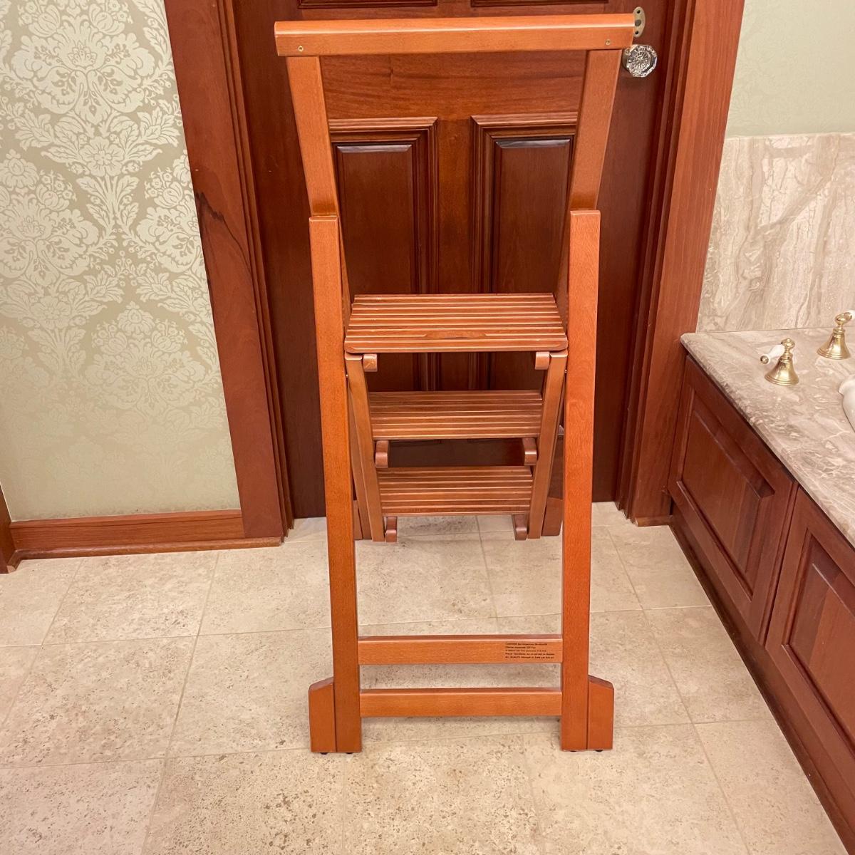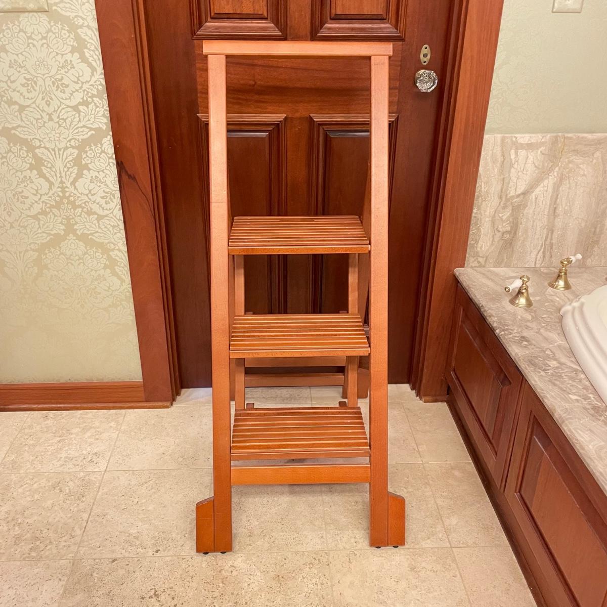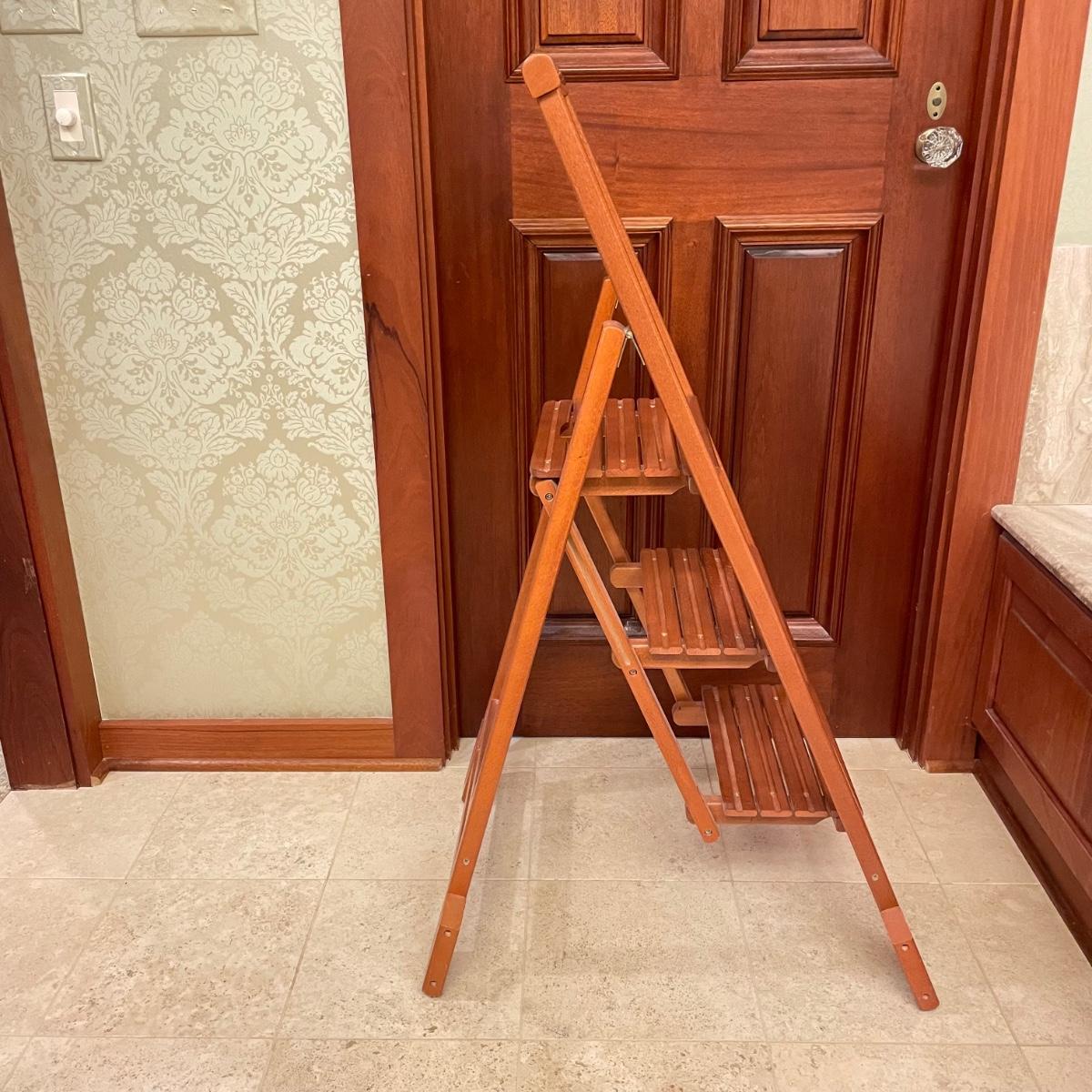 Nice wood slatted step ladder, made in Italy. Piece appears to be sturdy. The highest step sits at 28”H. When collapsed, stool measures 20” x 2.5” x 48”H. Local pick up only.