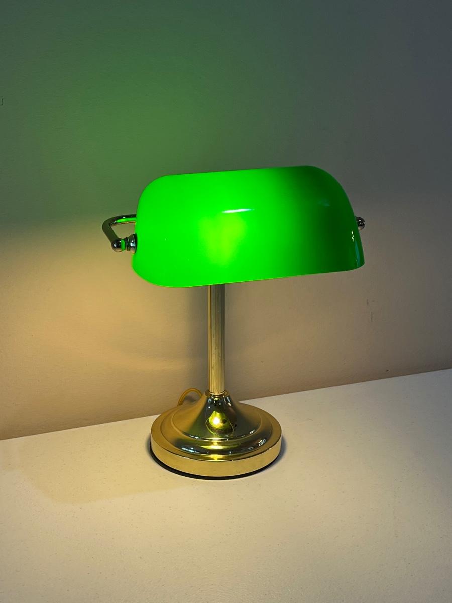 Base is metal ~ Green shade swivels ~ Shade is plastic with minor surface scratches ~ 14” H x 11” W x 10” D
