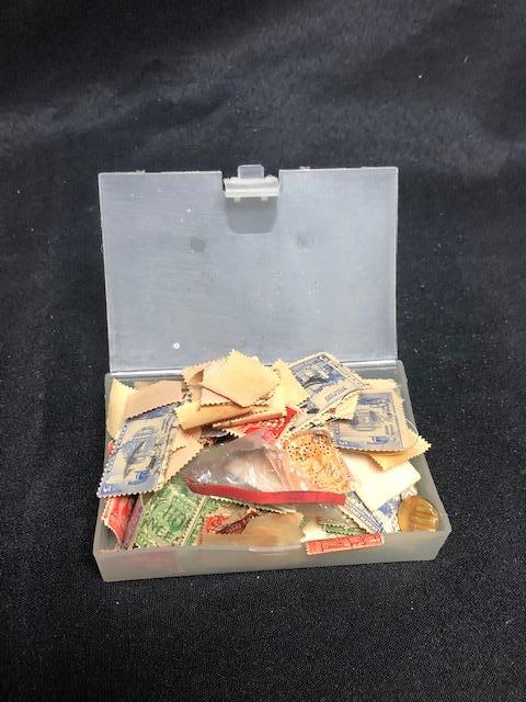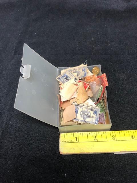 Plastic box full of old stamps. Box is approximately 3x5. Stamps are old, unsure of age or where they originate.